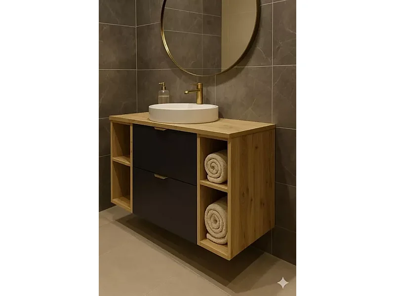 Ensemble pour salle de bain 100 cm Armoire avec plateau et étagères Chêne Artisan / Noir Orio