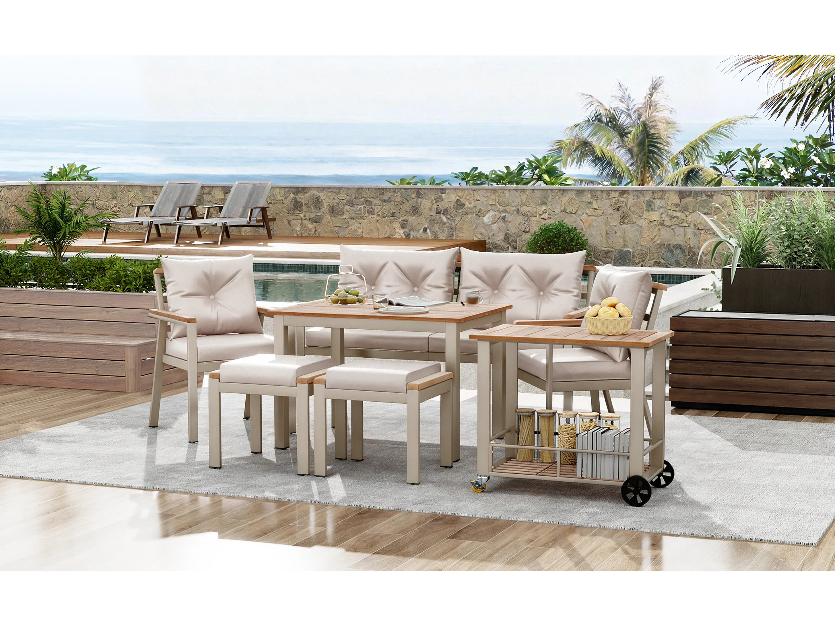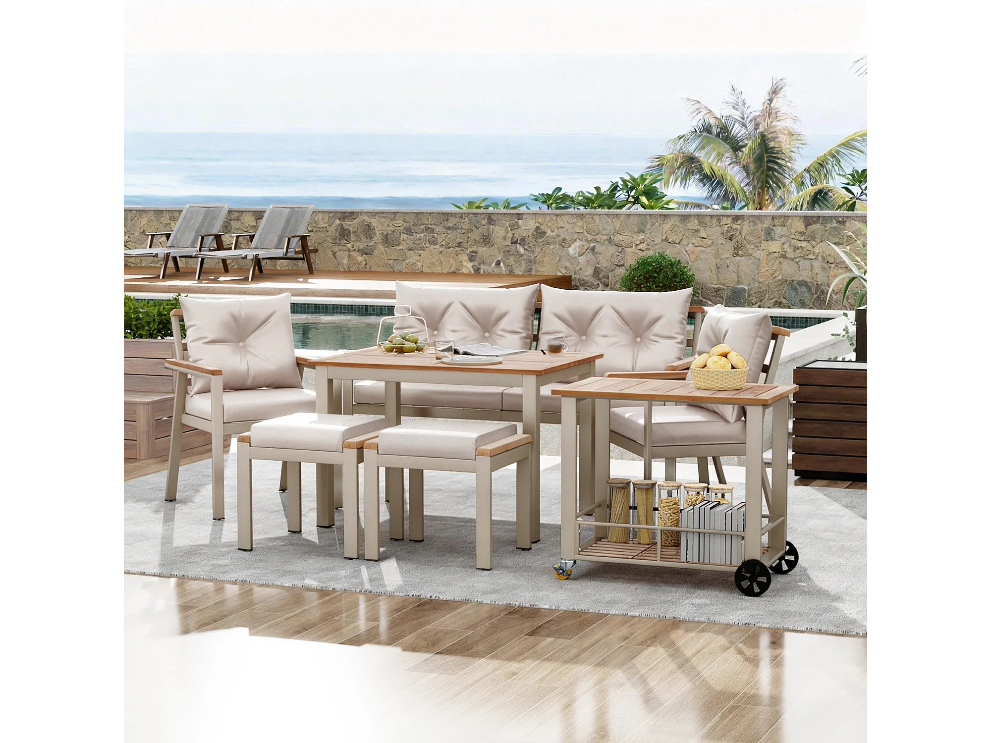 Ensemble salon de jardin 6-7 places - avec fauteuils + desserte amovible + table + chaises - métal - beige