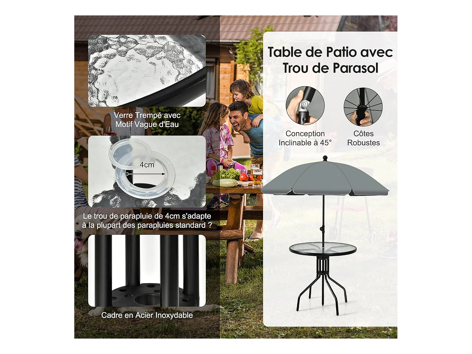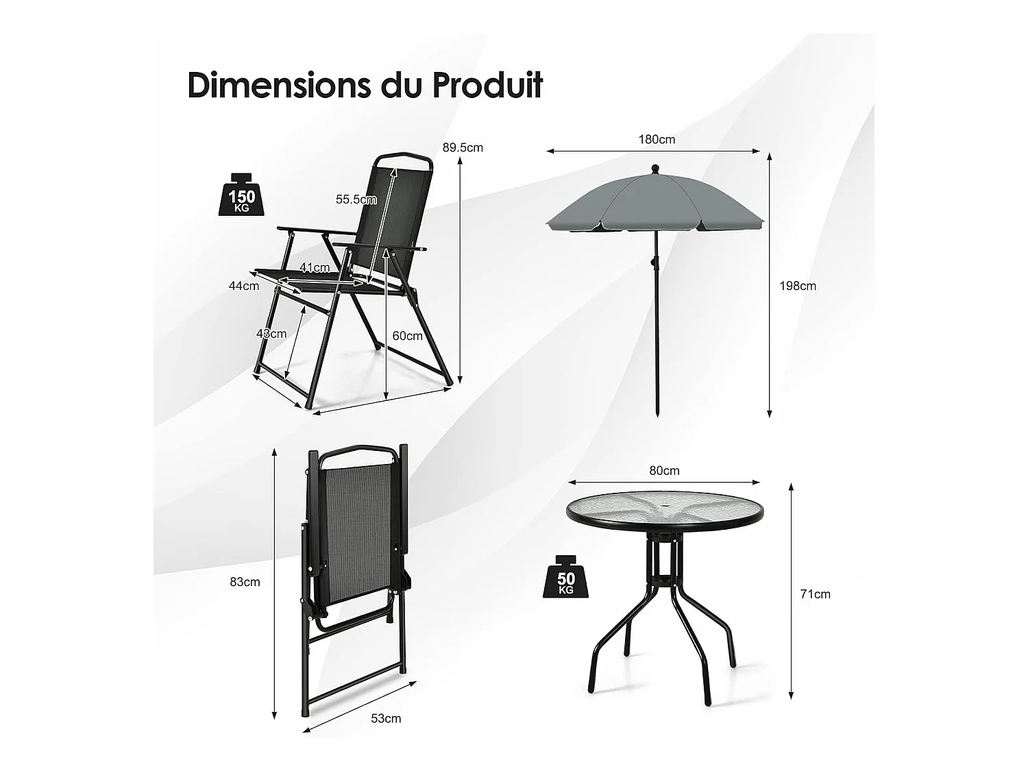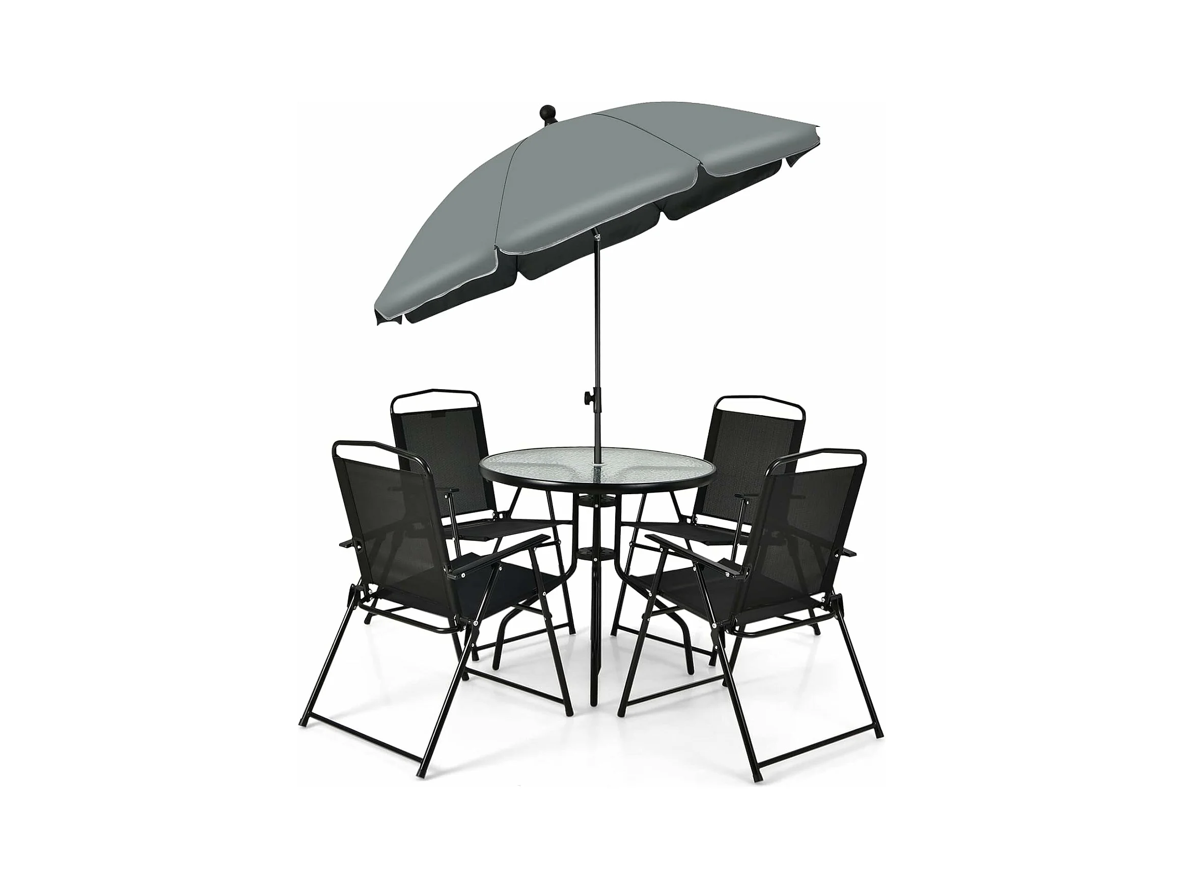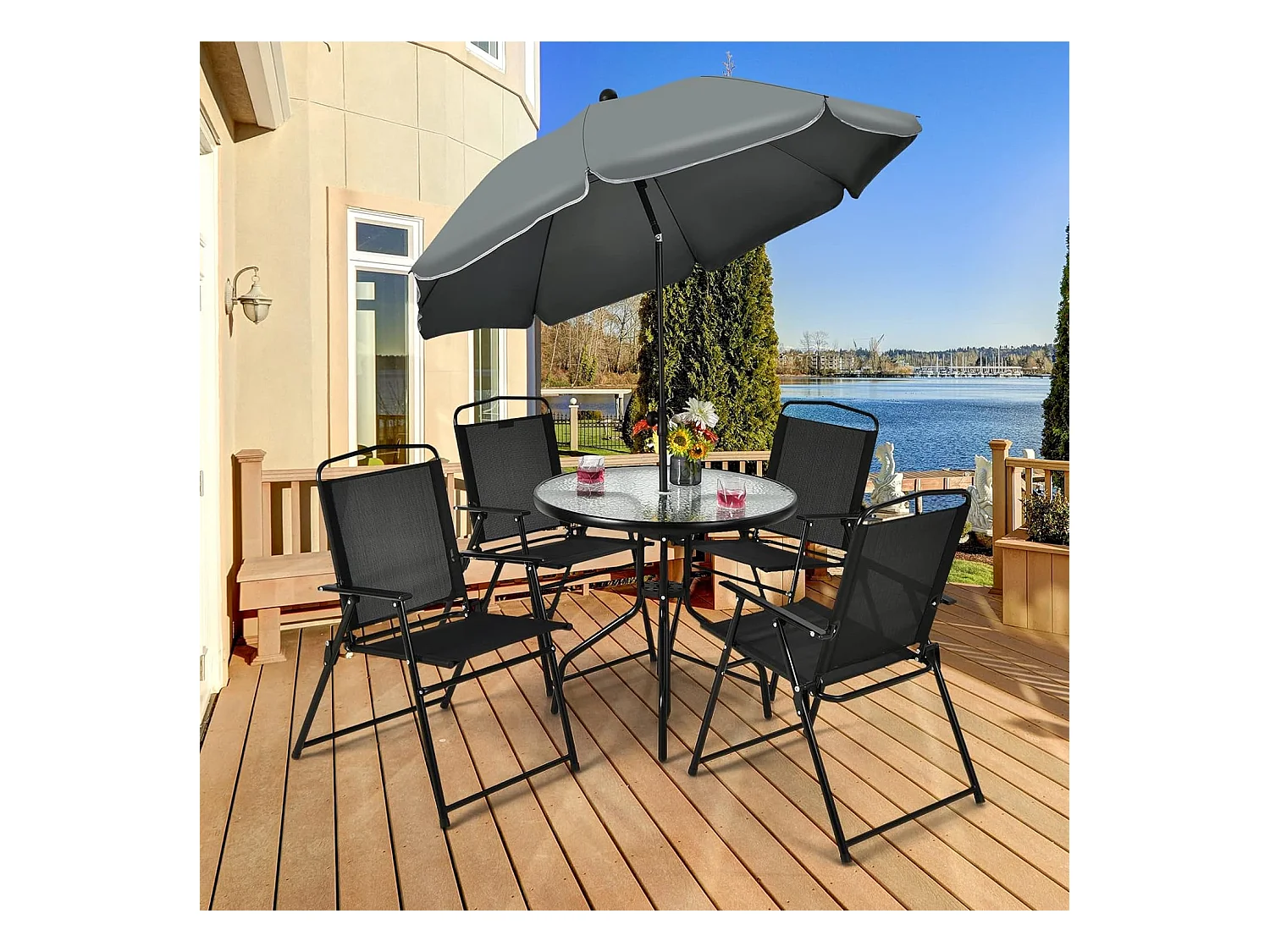 Ensemble Salon de Jardin 6 Pcs, 4 Chaises Pliantes Table Basse en Verre et Parasol, pour Terrasse, Piscine, Cour, Noir