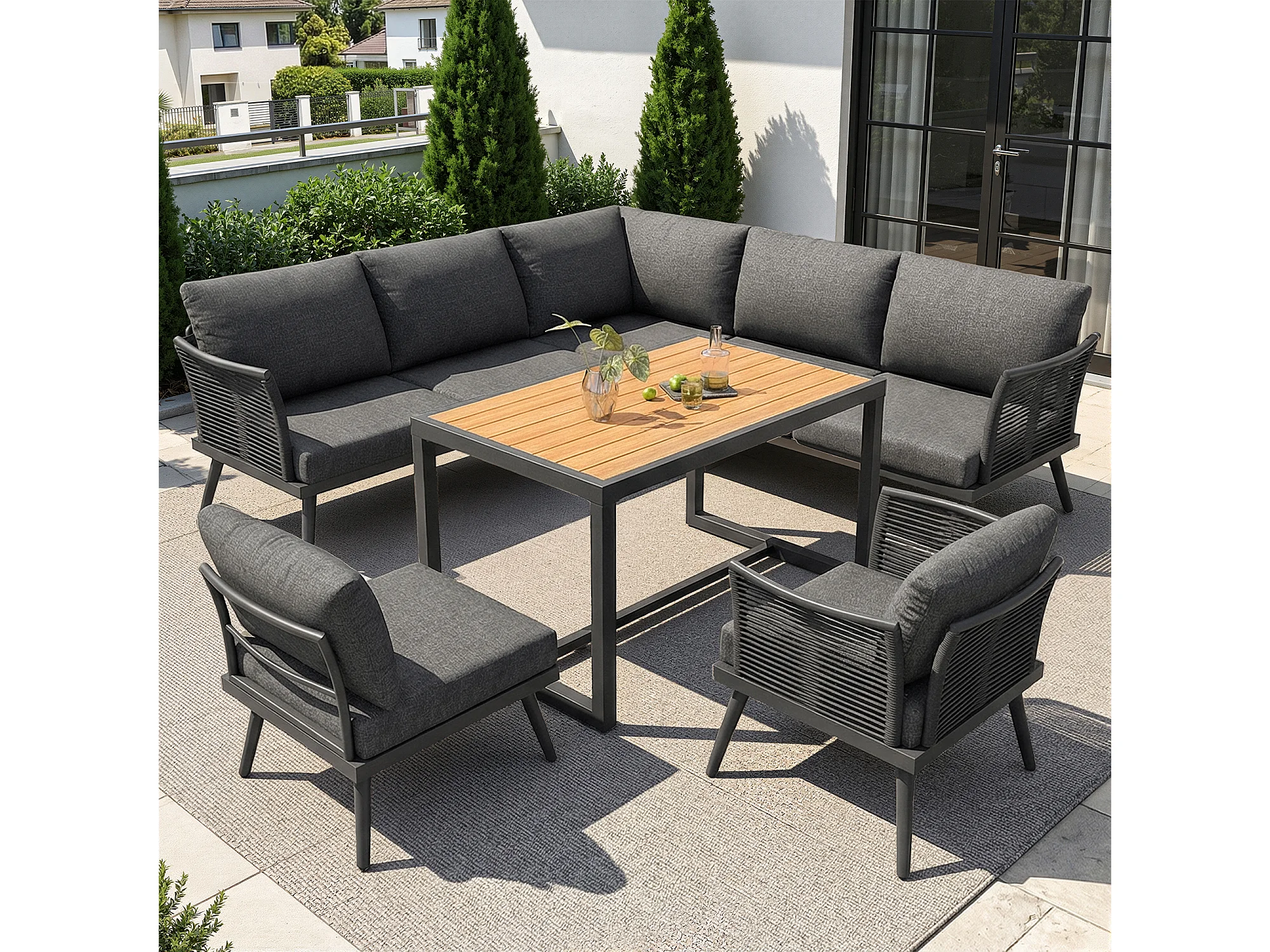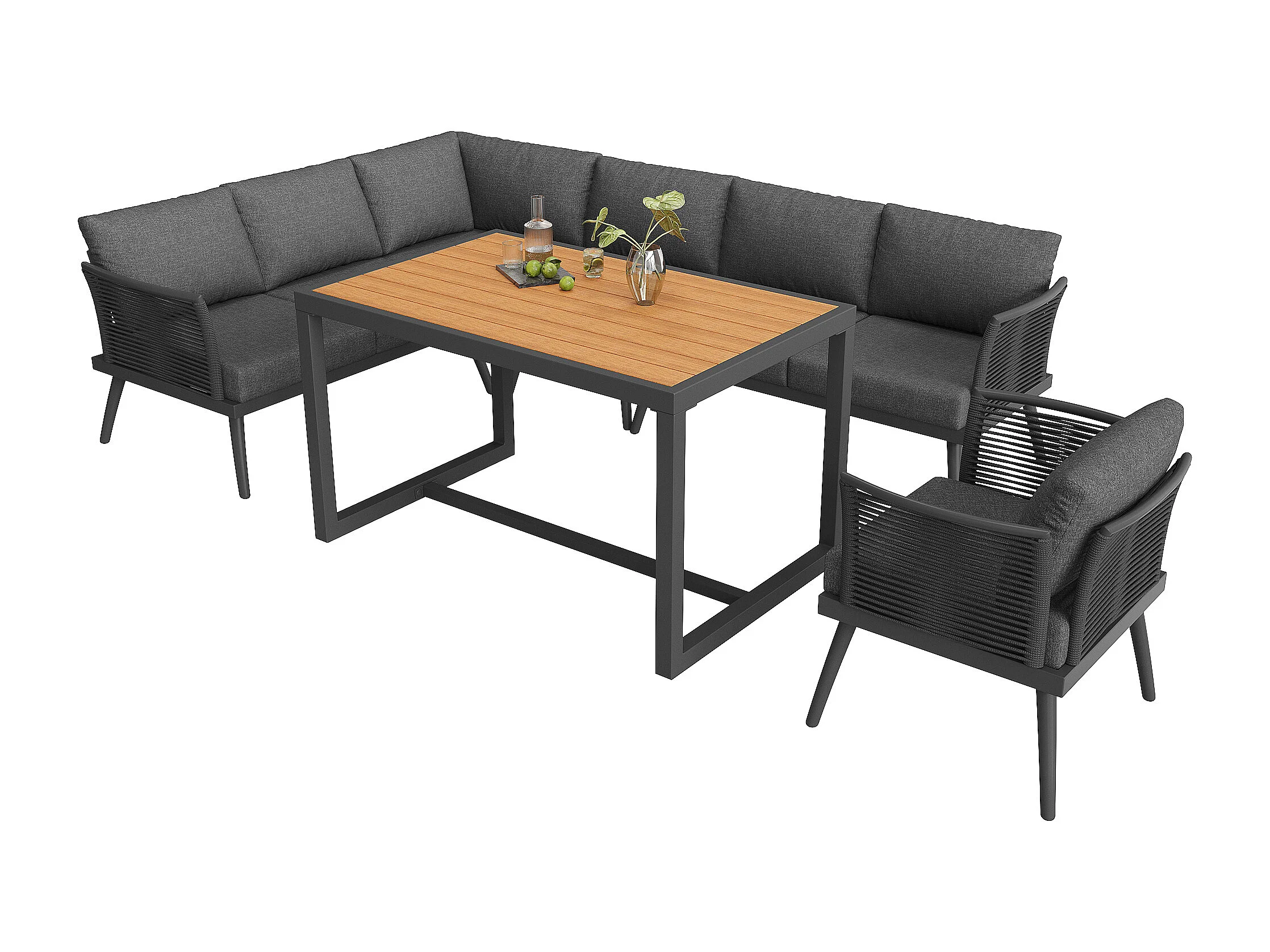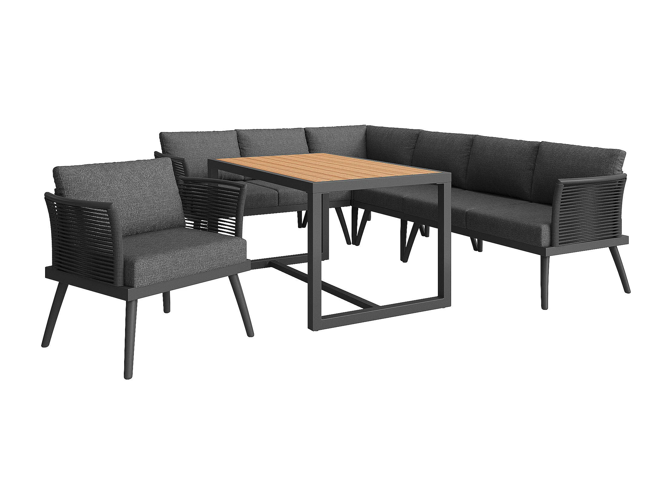 Ensemble salon de jardin 7 places - canapé avec accoudoirs tressés + table basse + fauteuil + coussins - métal - gris