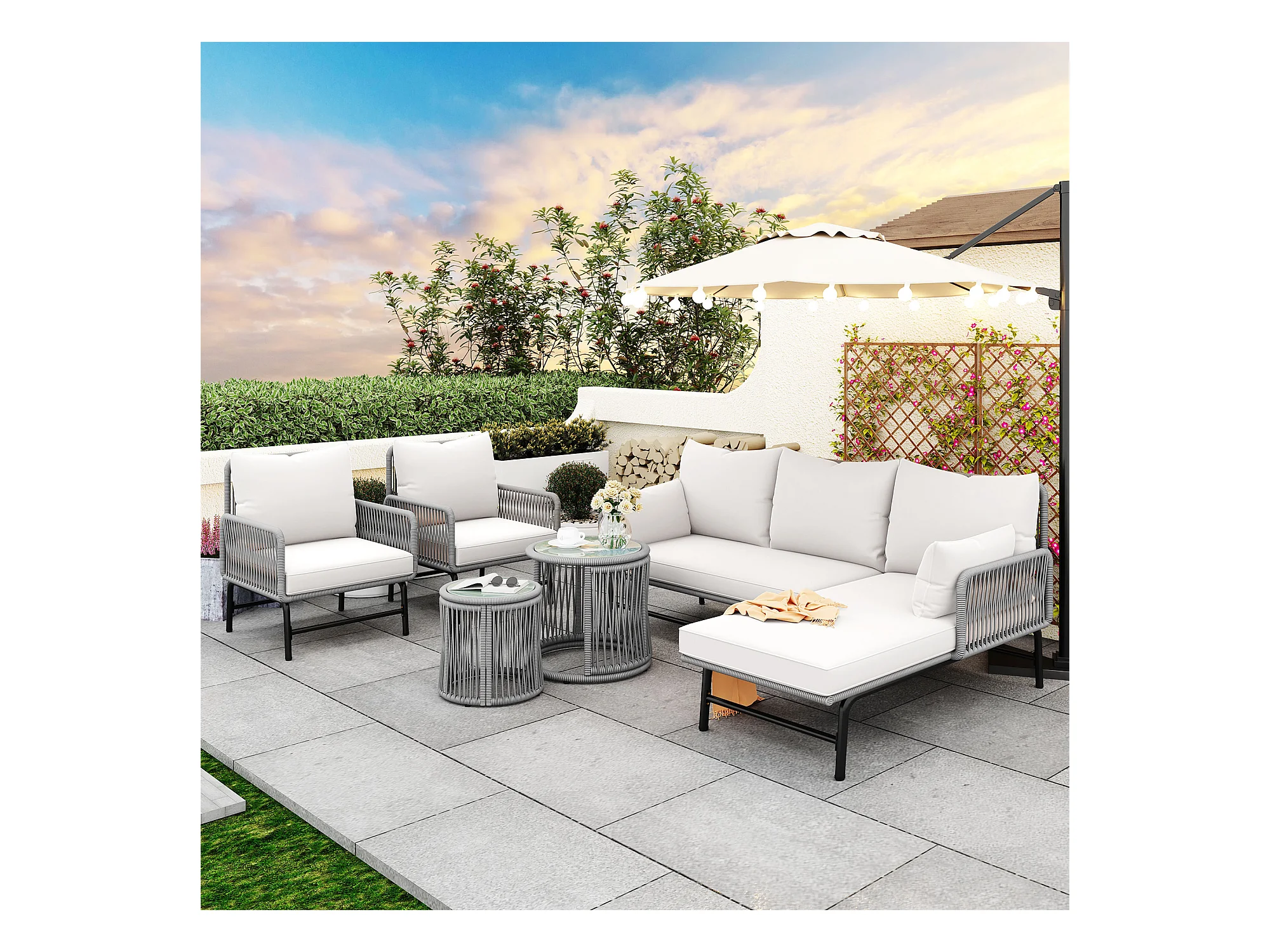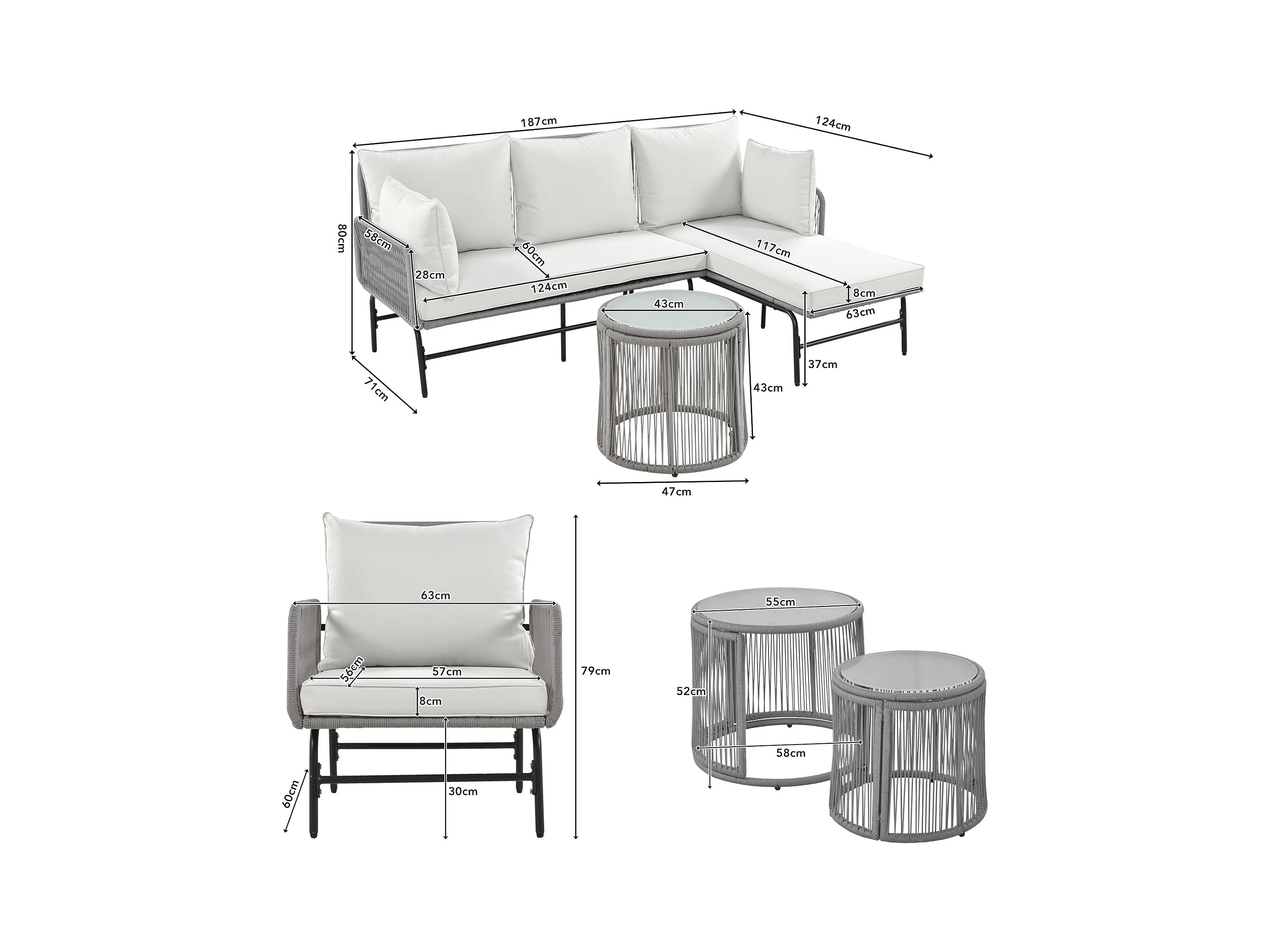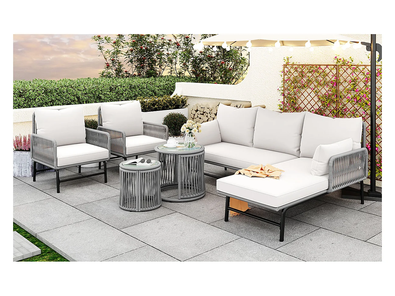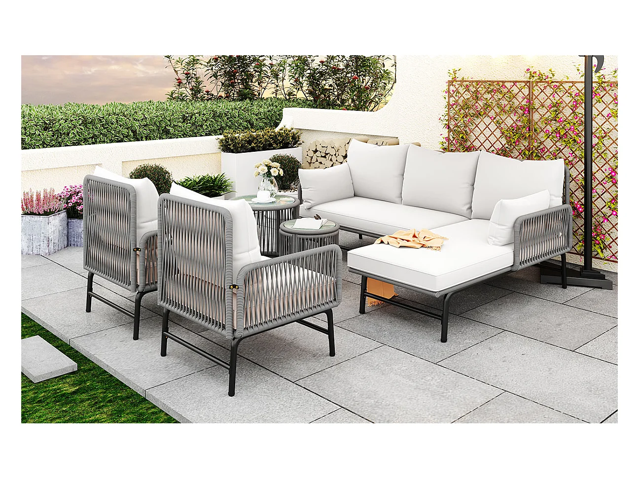 Ensemble salon de jardin en fer 6 places : 2 fauteuils + 2 canapés d'angle + tables basses gigognes - Coussins inclus - gris + blanc