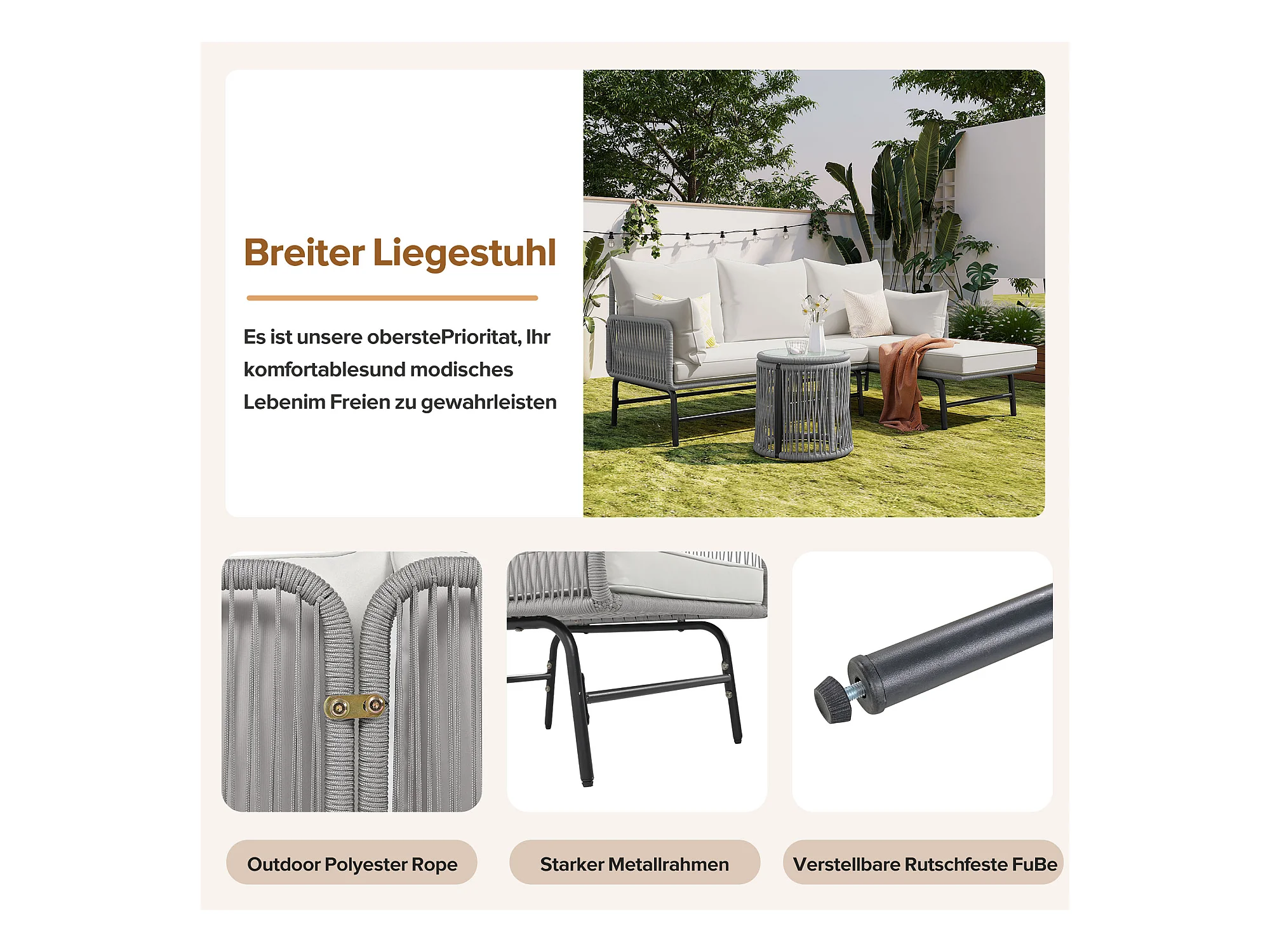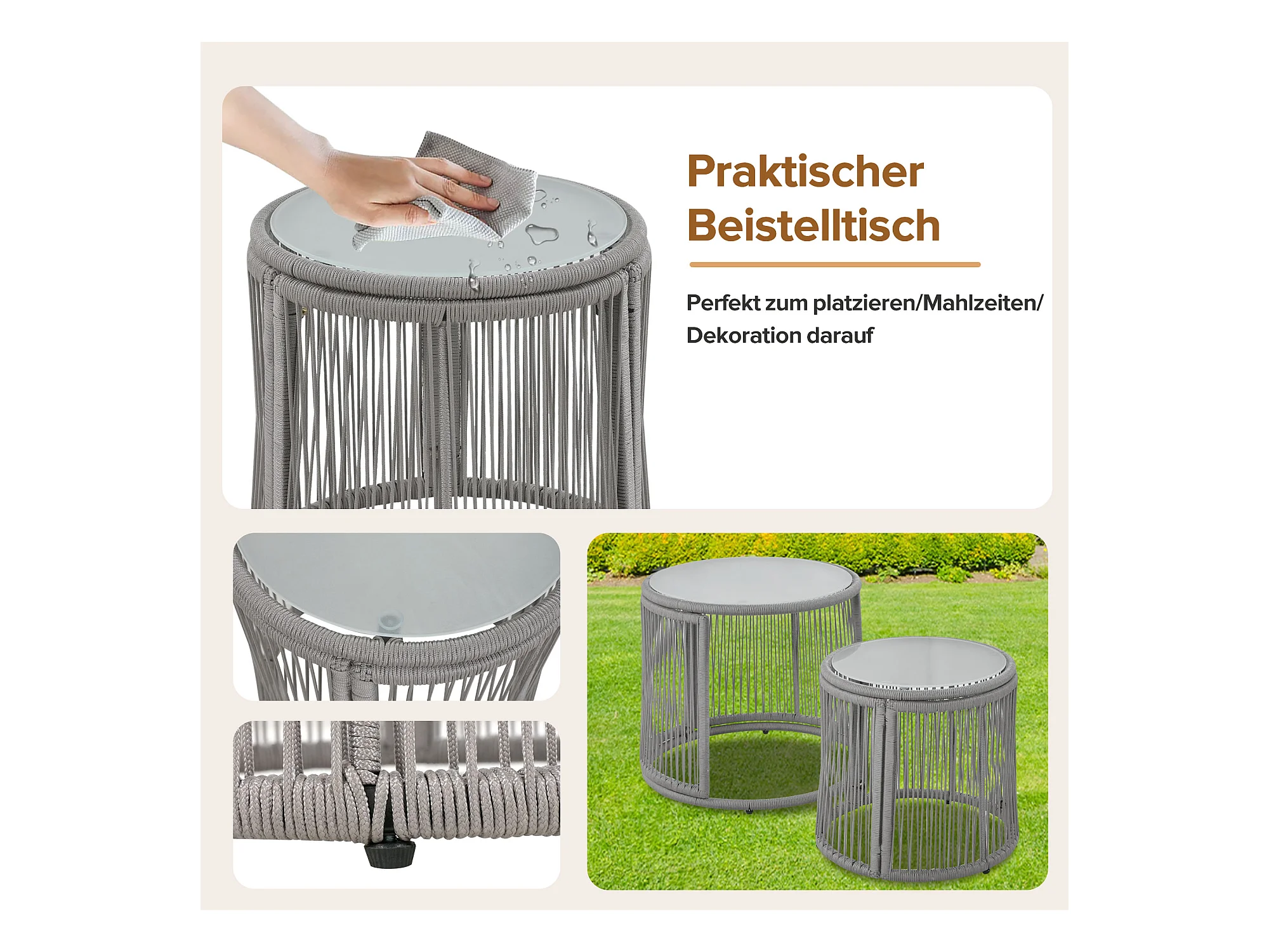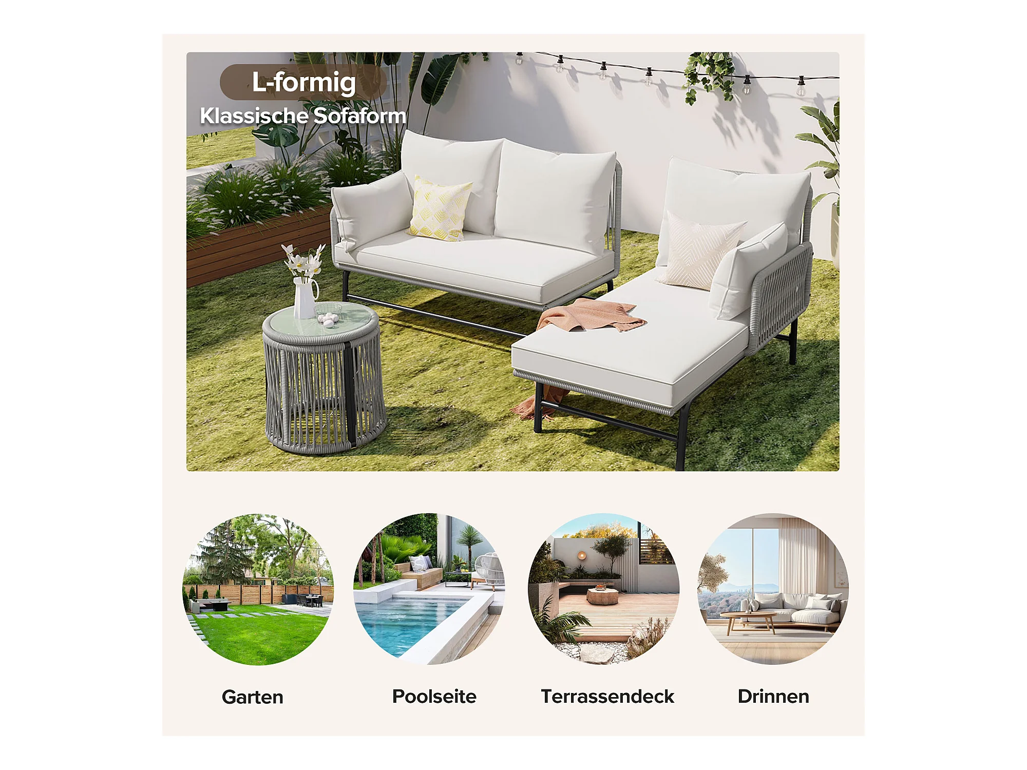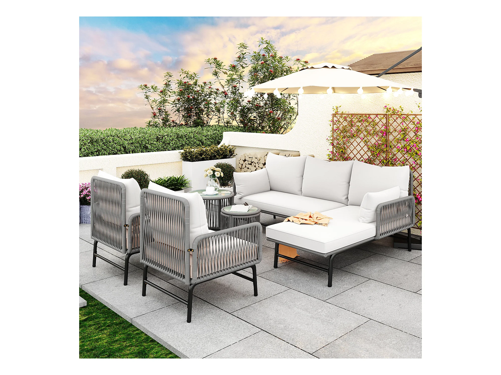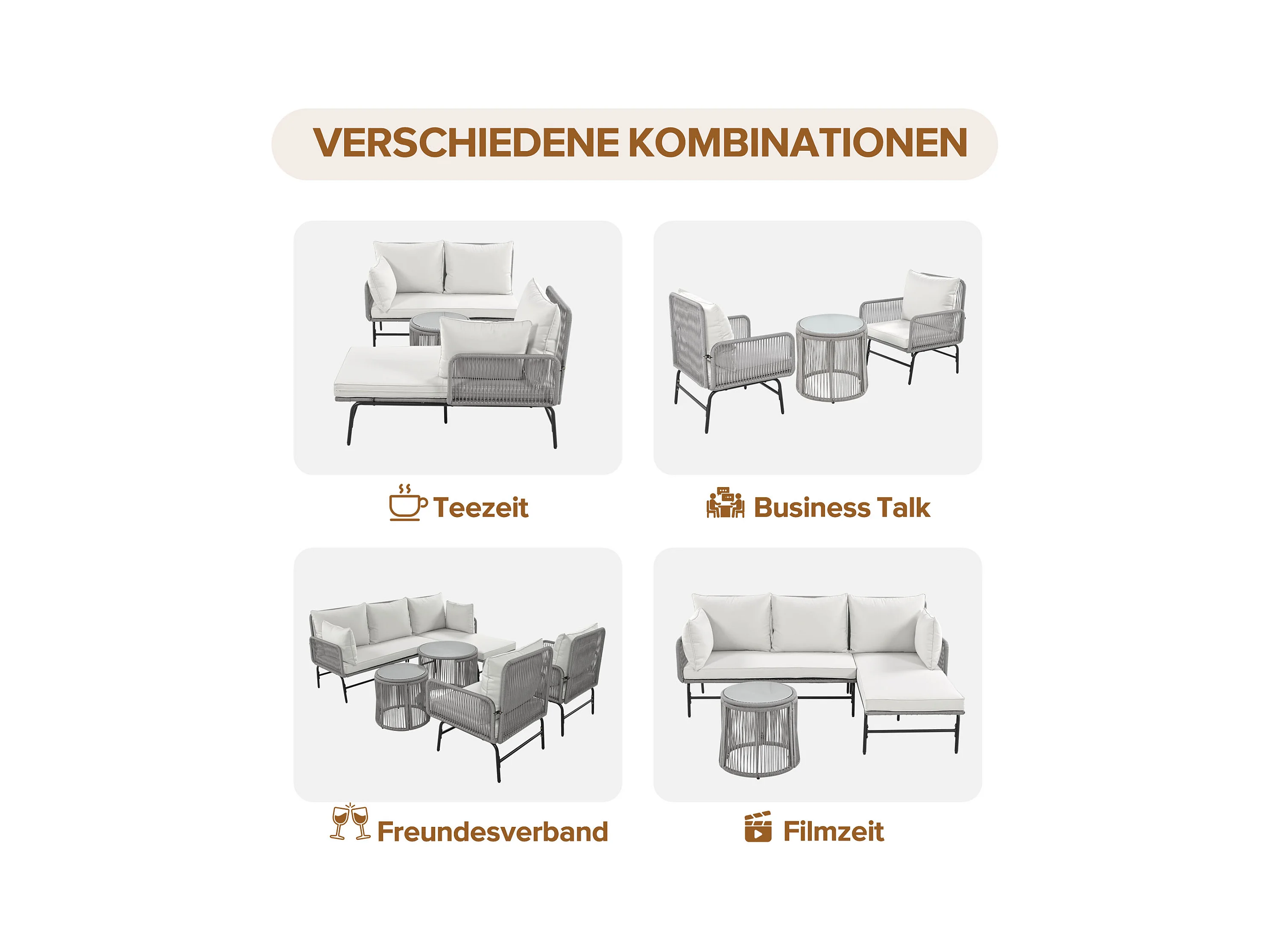 Ensemble salon de jardin en fer 6 places : 2 fauteuils + 2 canapés d'angle + tables basses gigognes - Coussins inclus - gris + blanc