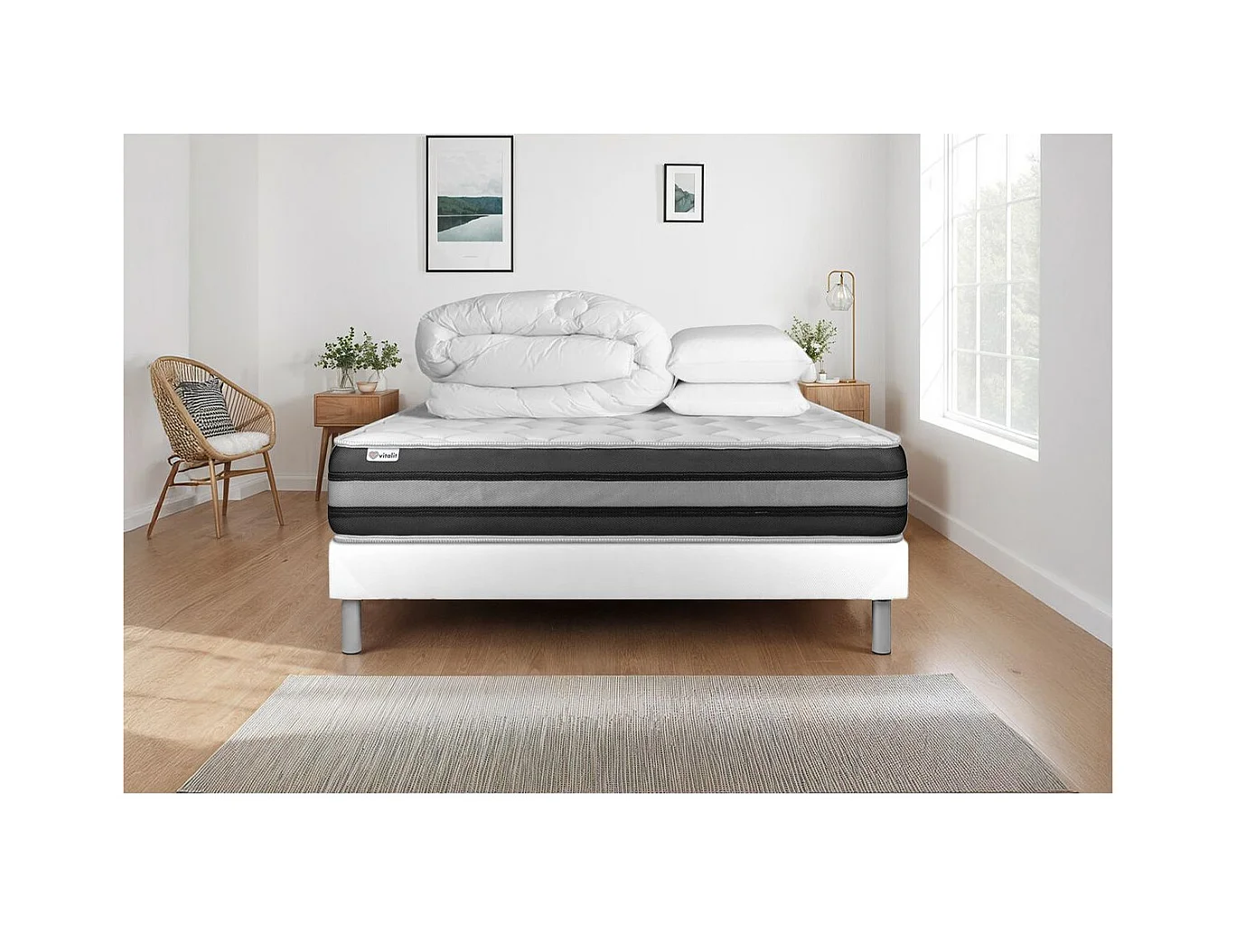 Pack prêt à dormir 160x200 matelas LANCASTER ressorts ensachés et mémoire de forme + sommier kit blanc + Couette + 2 oreillers