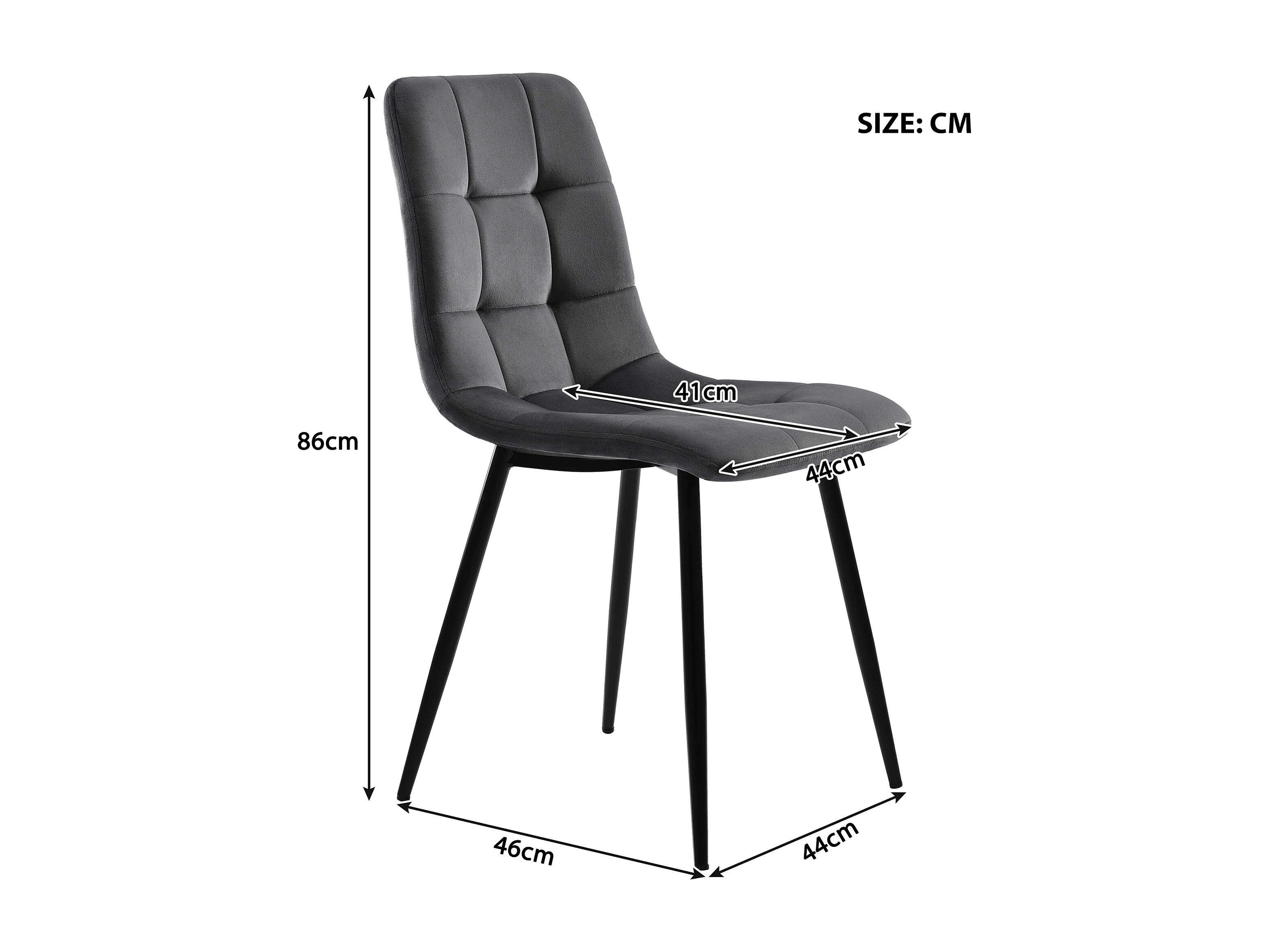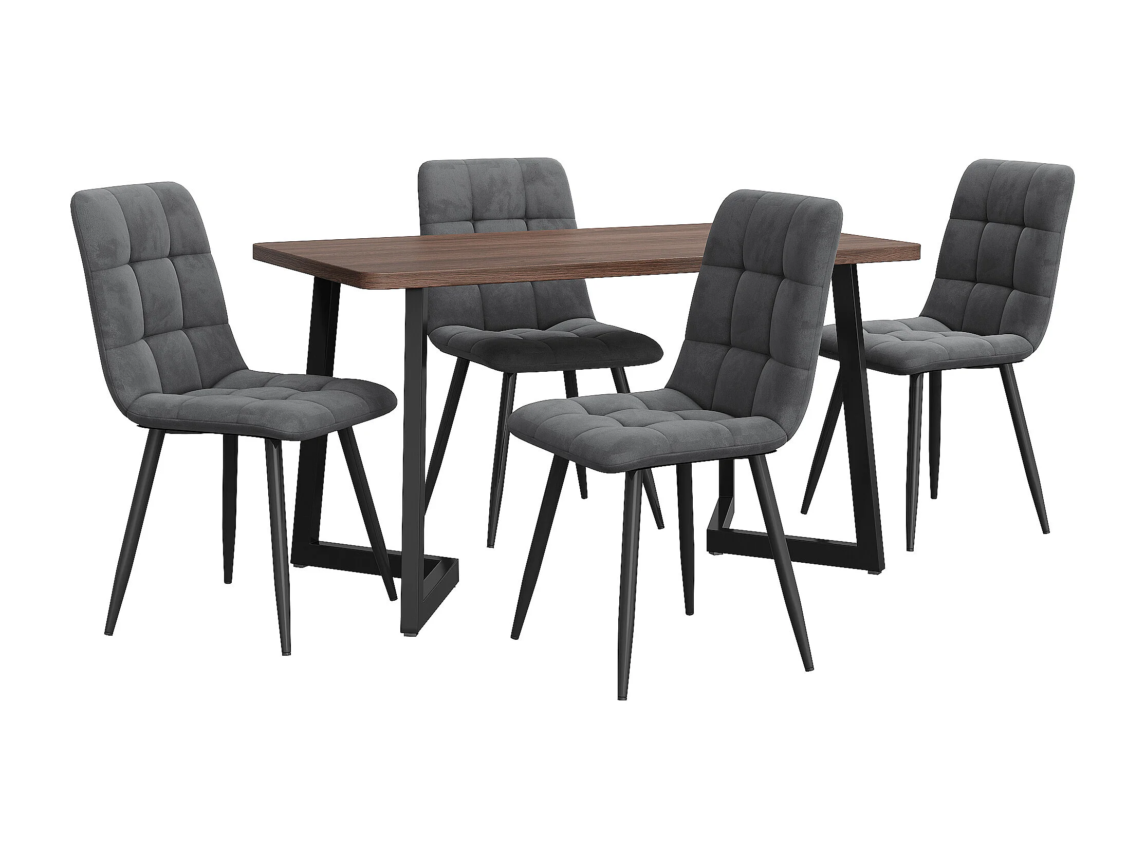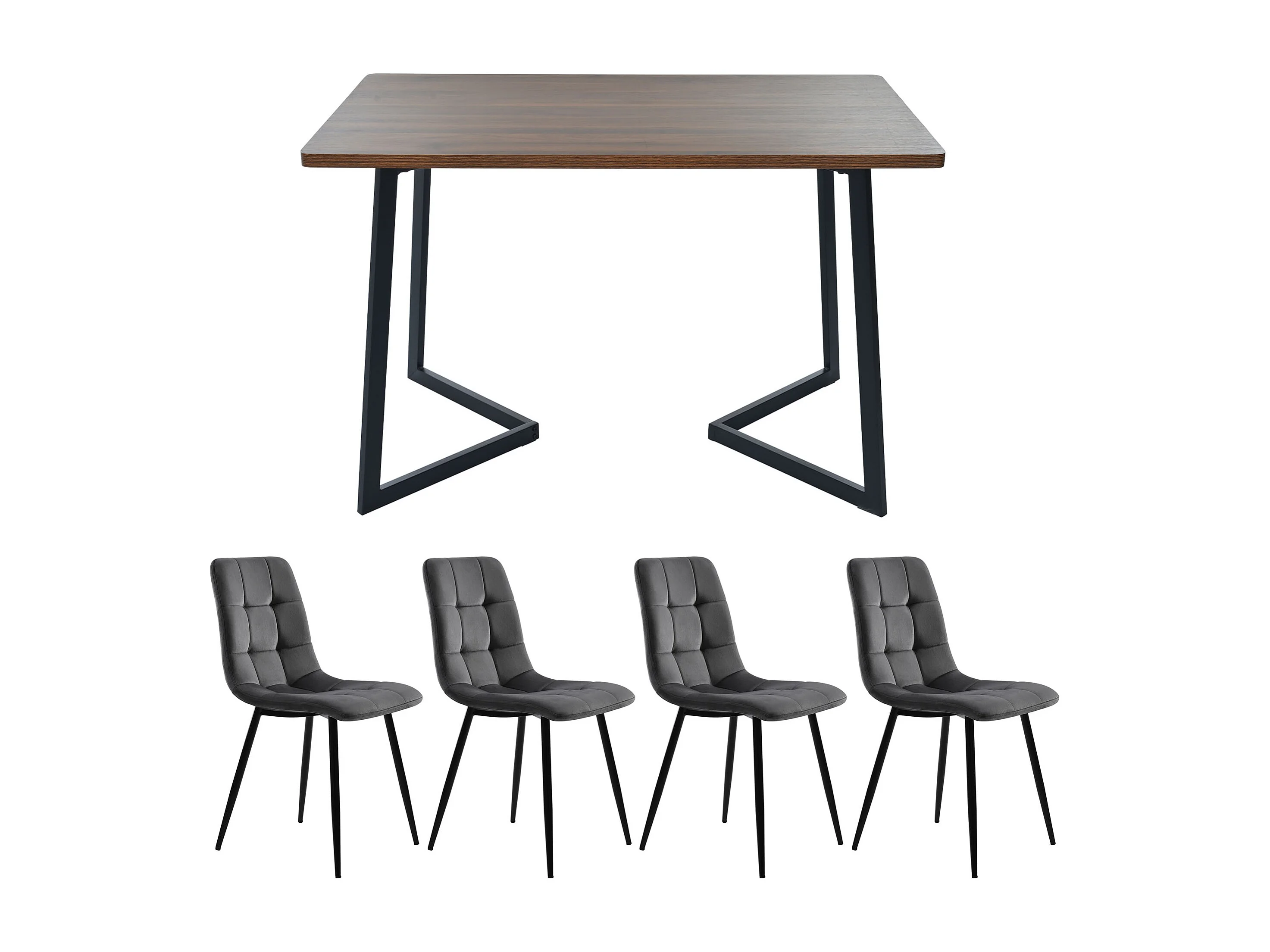 Ensemble table et 4 chaises 117x68x75 cm, piètement métallique noir, assise en velours, plateau en MDF, noyer