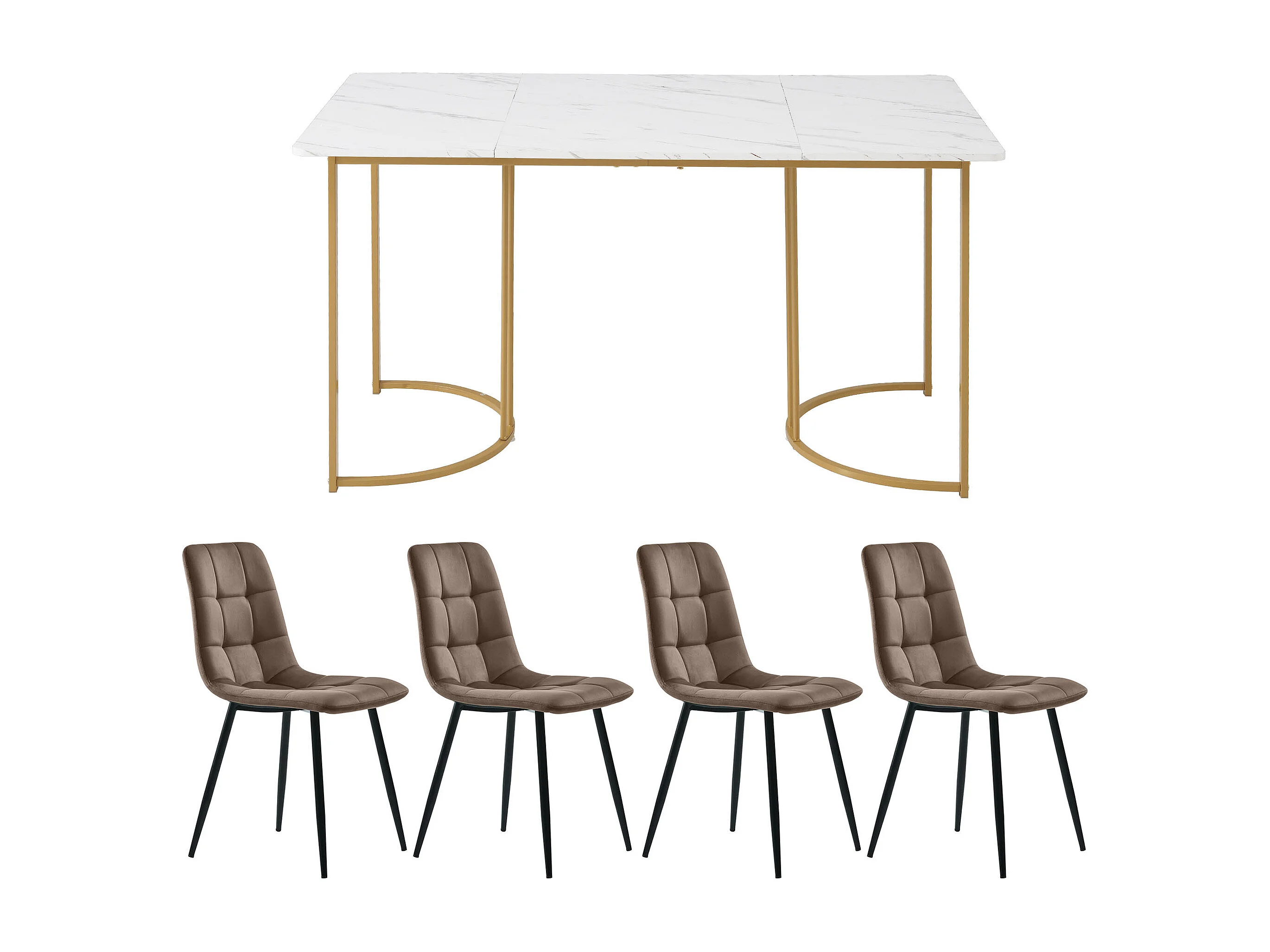 Ensemble table et 4 chaises 140x80x75 cm, plateau effet marbre, pieds métal réglables, MDF, blanc