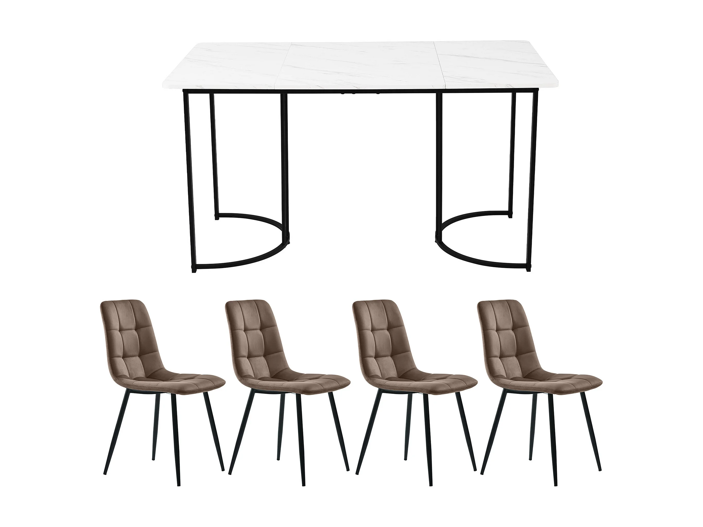 Ensemble table et 4 chaises 140x80x75 cm, plateau effet marbre, pieds réglables, MDF blanc
