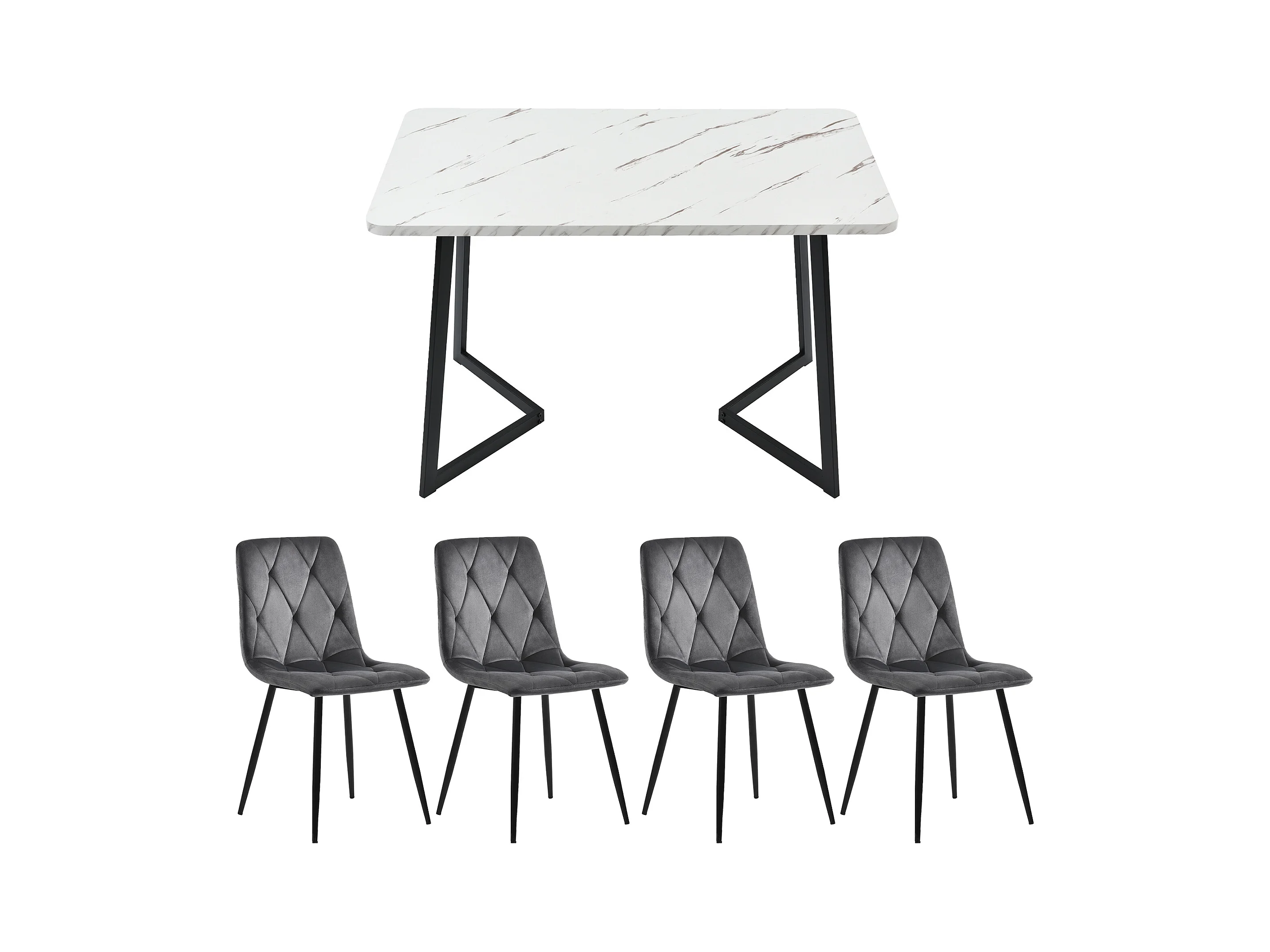 Ensemble table + 4 chaises en velours - pièds en métal - gris et blanc