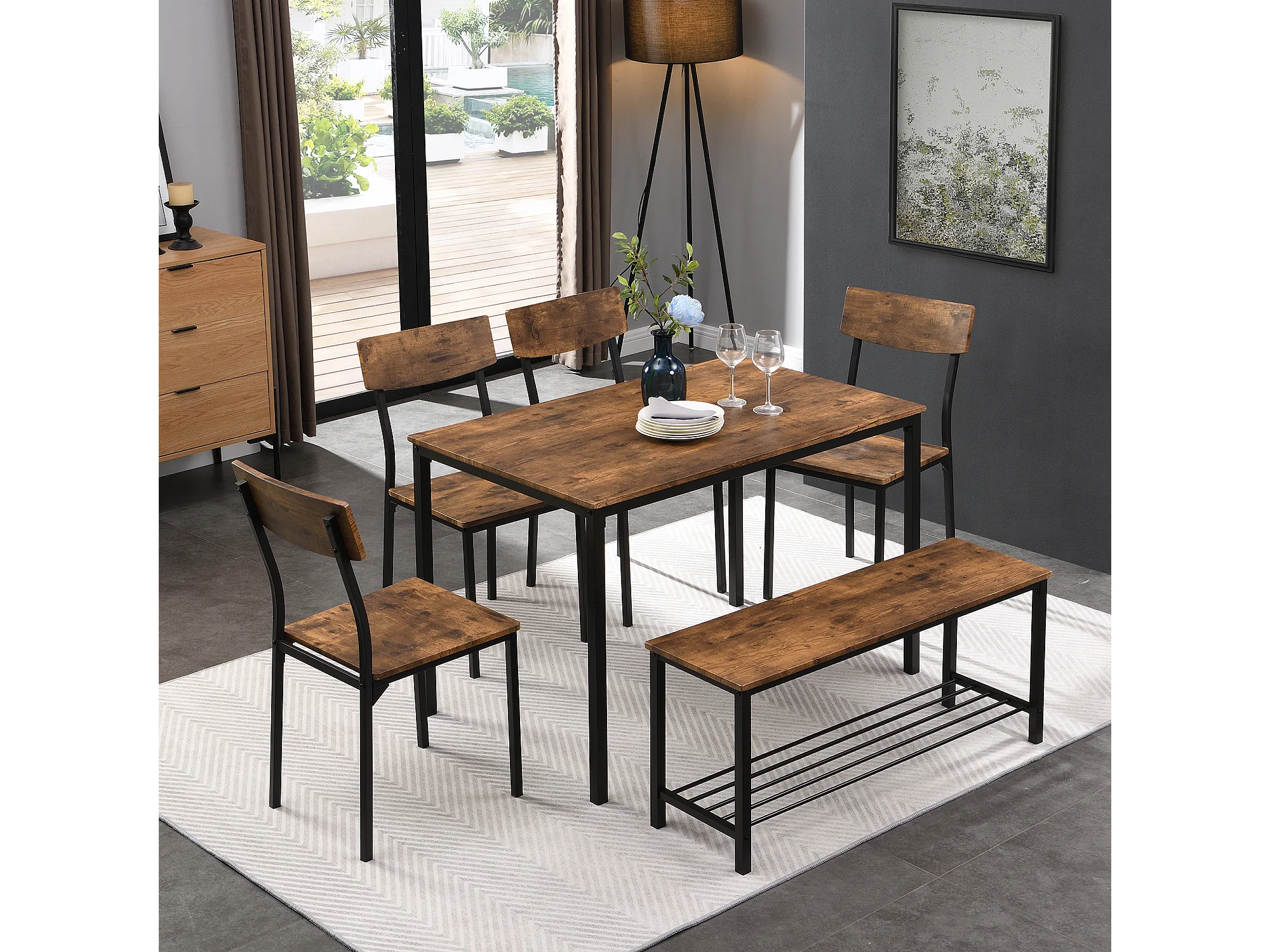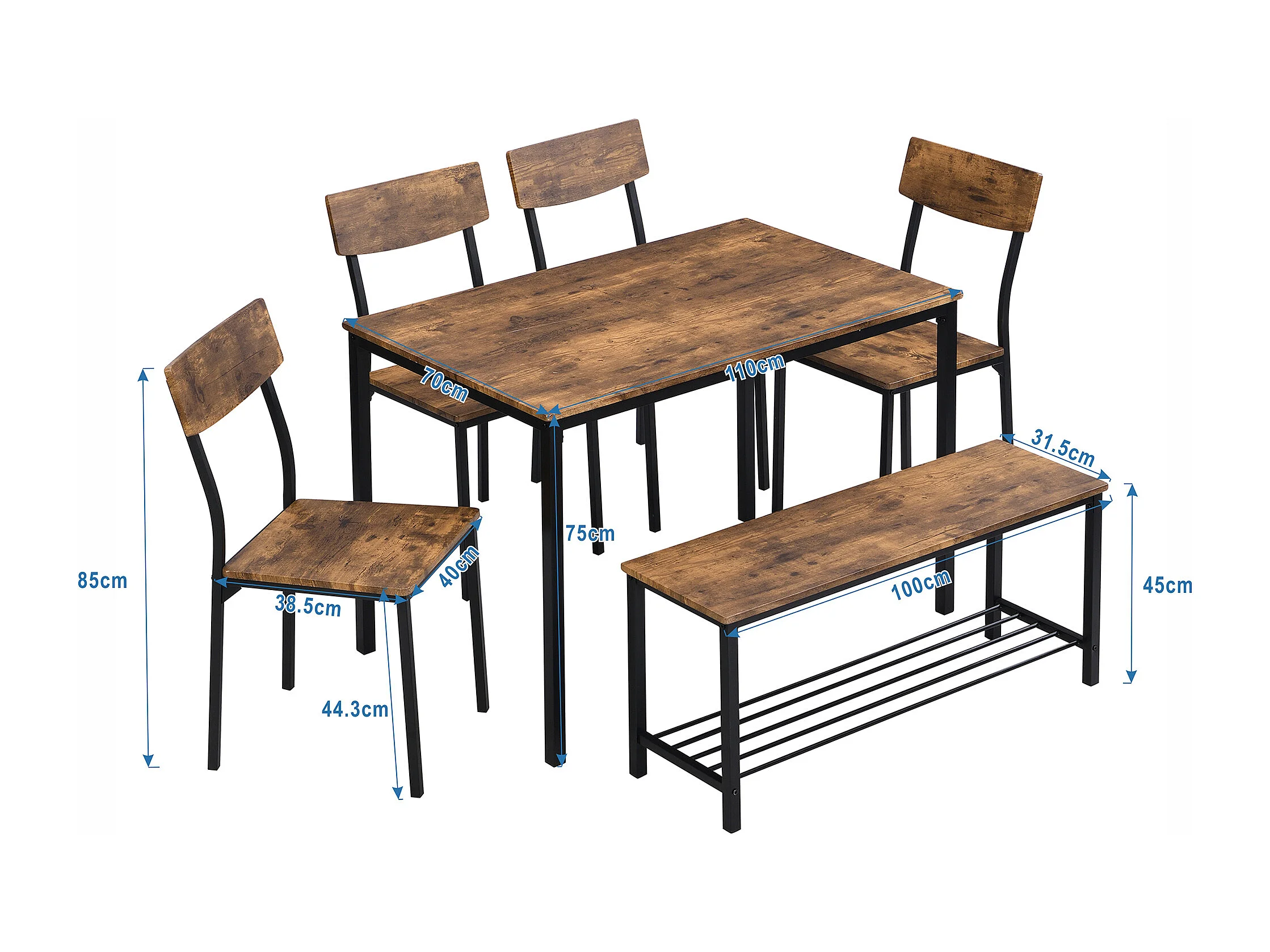 Ensemble table a manger 110x70x75 cm + 6 chaises en bois marron - pieds en métal noir