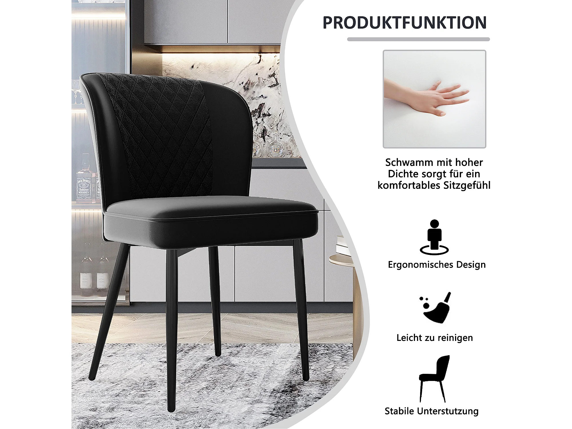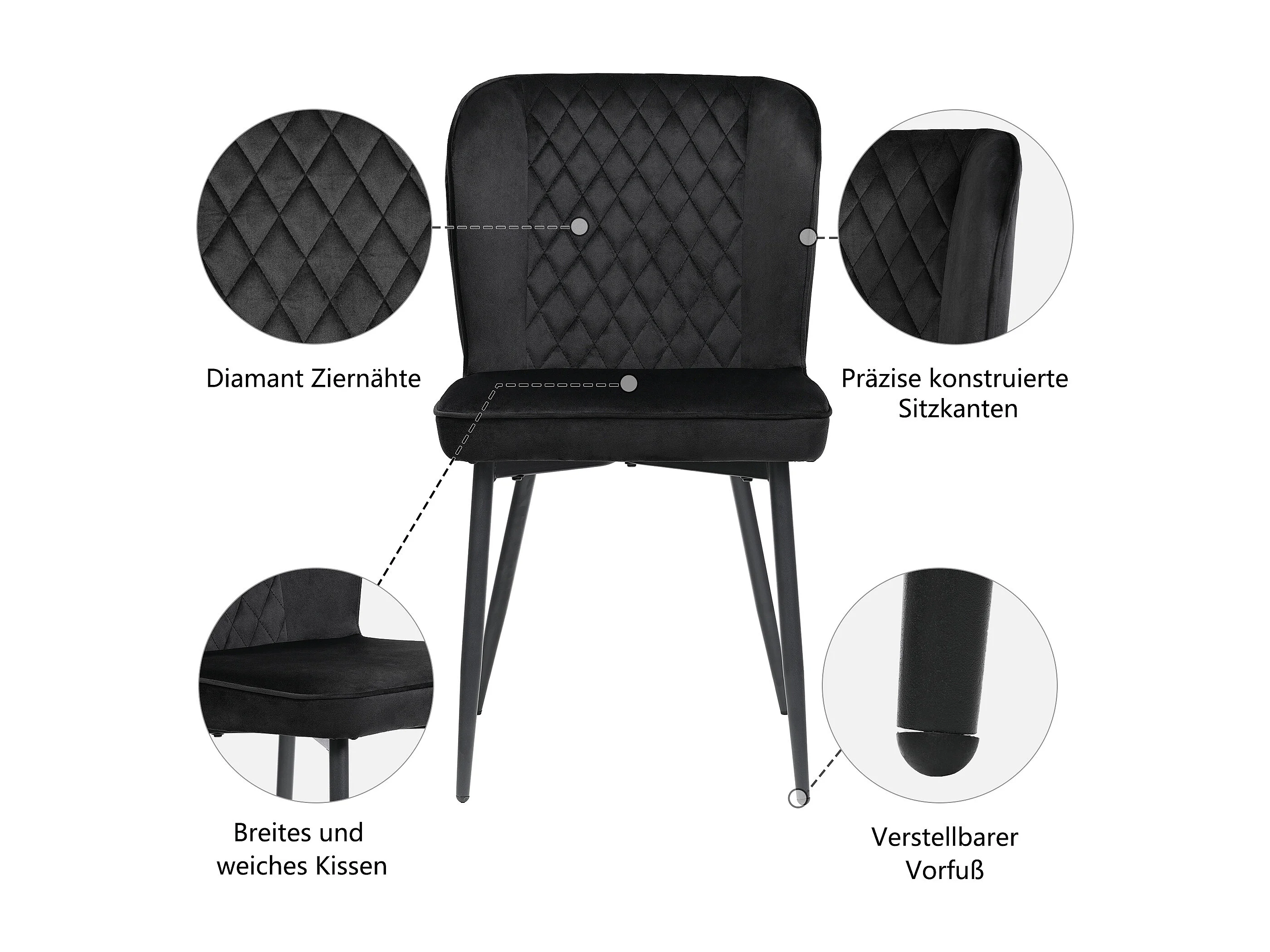 Ensemble table à manger 140 x 80 x 75 cm avec 4 chaises en velours - Bois MDF et métal - Noir