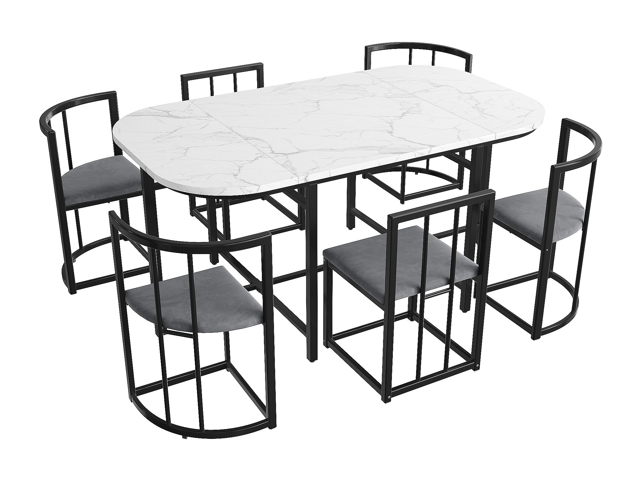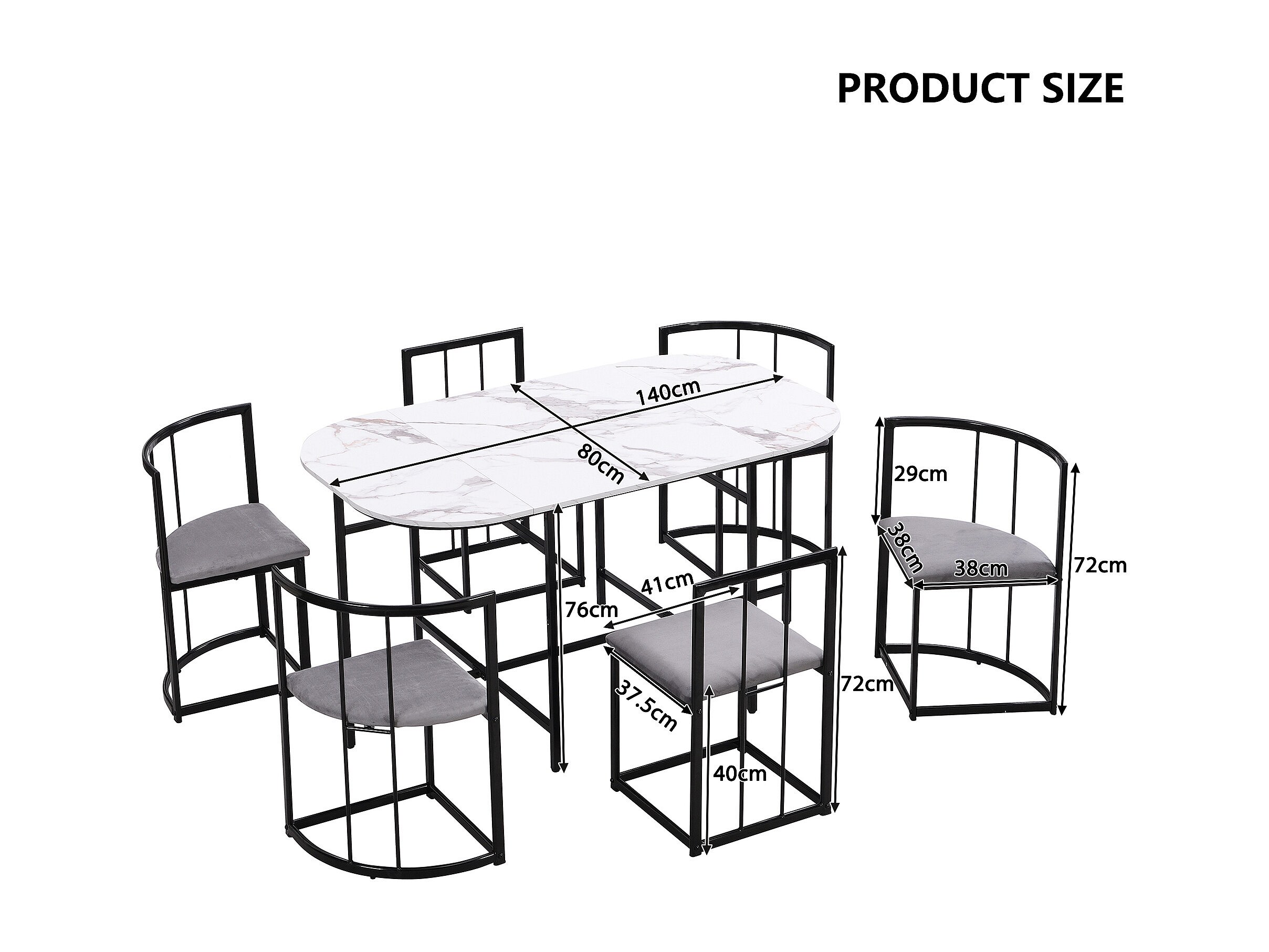 Ensemble table a manger (140x80x76 cm) + 6 chaises avec dossier en velours gris - pieds en métal noir