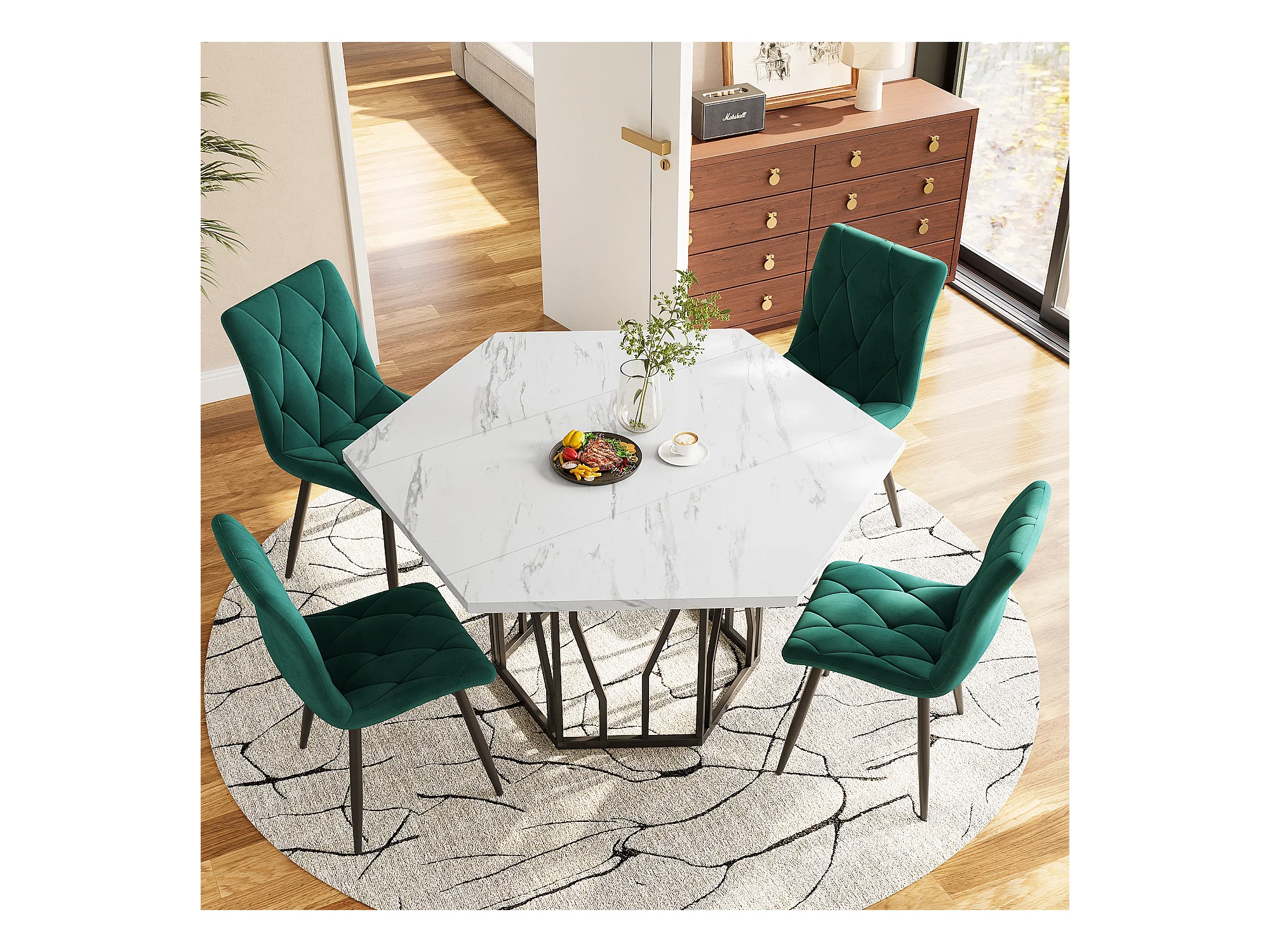 Ensemble table à manger et chaises 5 pièces, table hexagonale marbre moderne + 4 chaises velours vert, MDF + acier, noir et vert (115.5x100x75 cm)