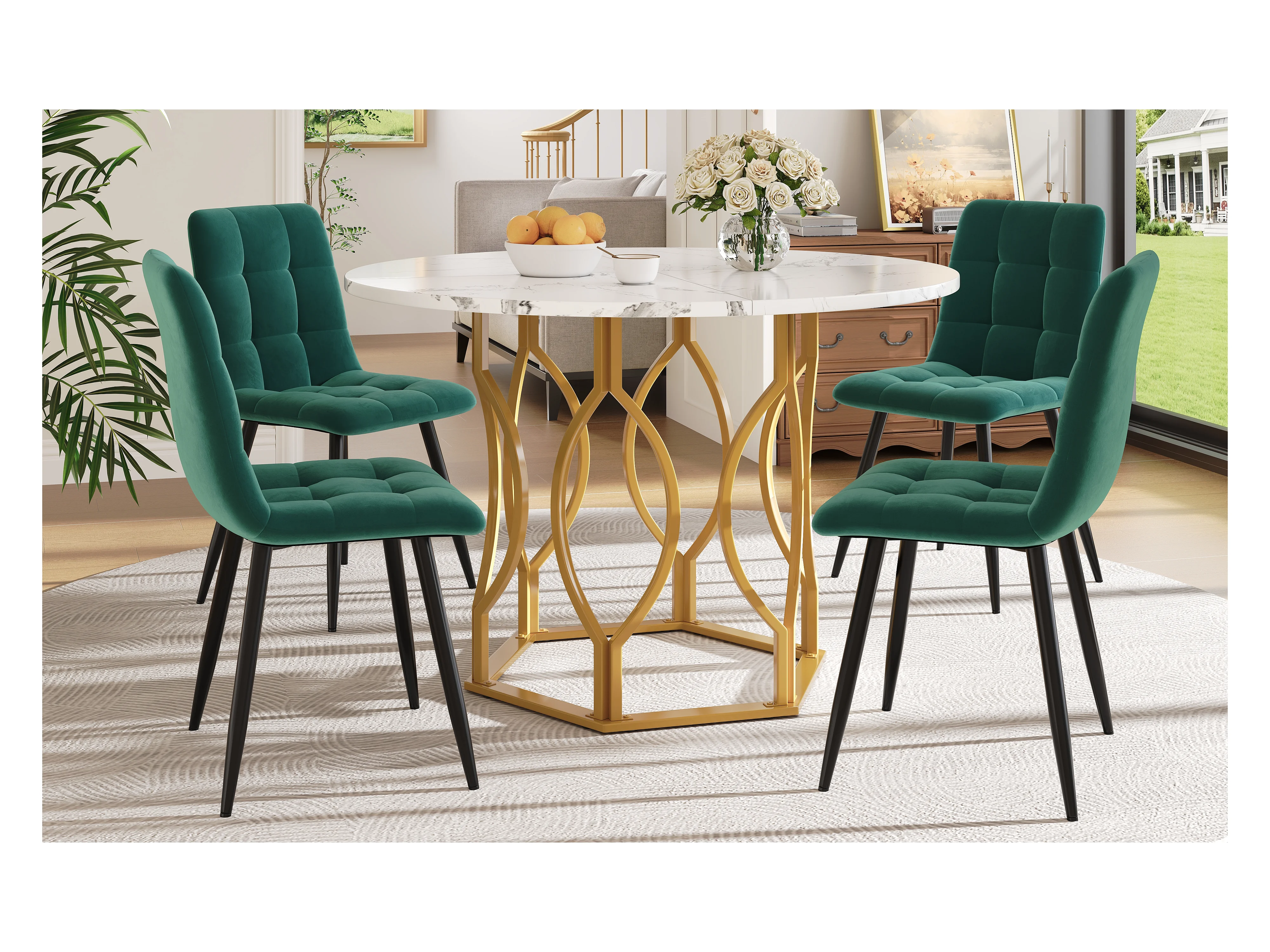 Ensemble Table à Manger Ronde avec 4 Chaises, MDF Effet Marbre, Pieds Métalliques Dorés, Chaises en Velours Vert Foncé (100x100x76 cm)