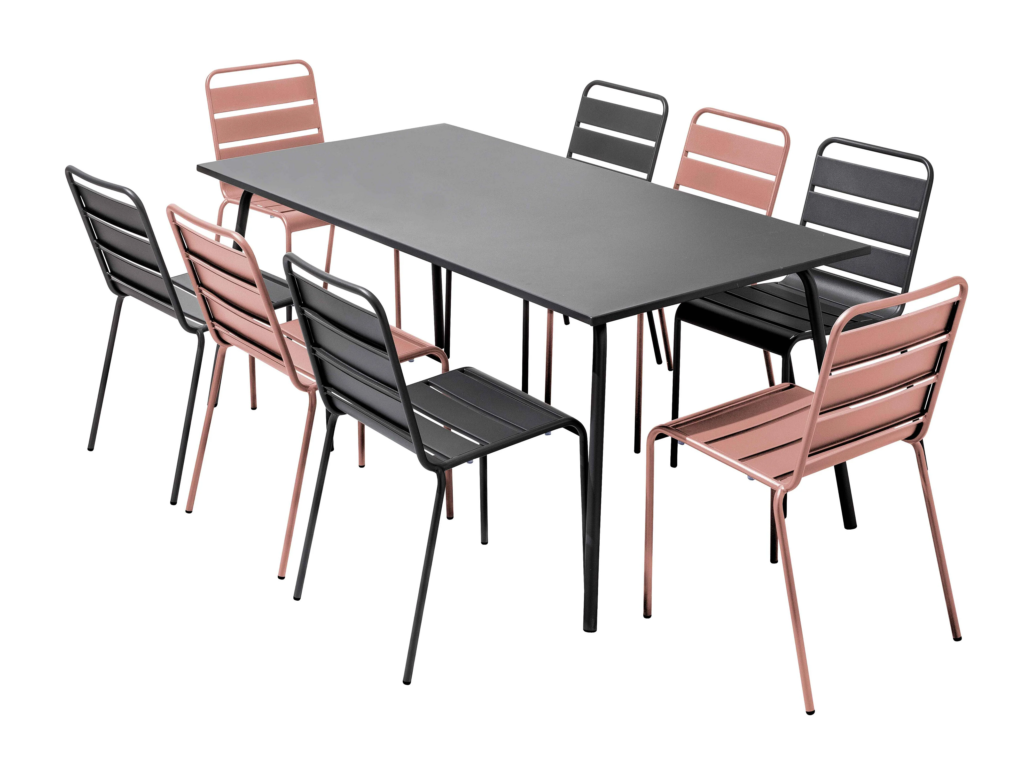 Ensemble table de jardin et 8 chaises en métal gris et rose poudré - Palavas