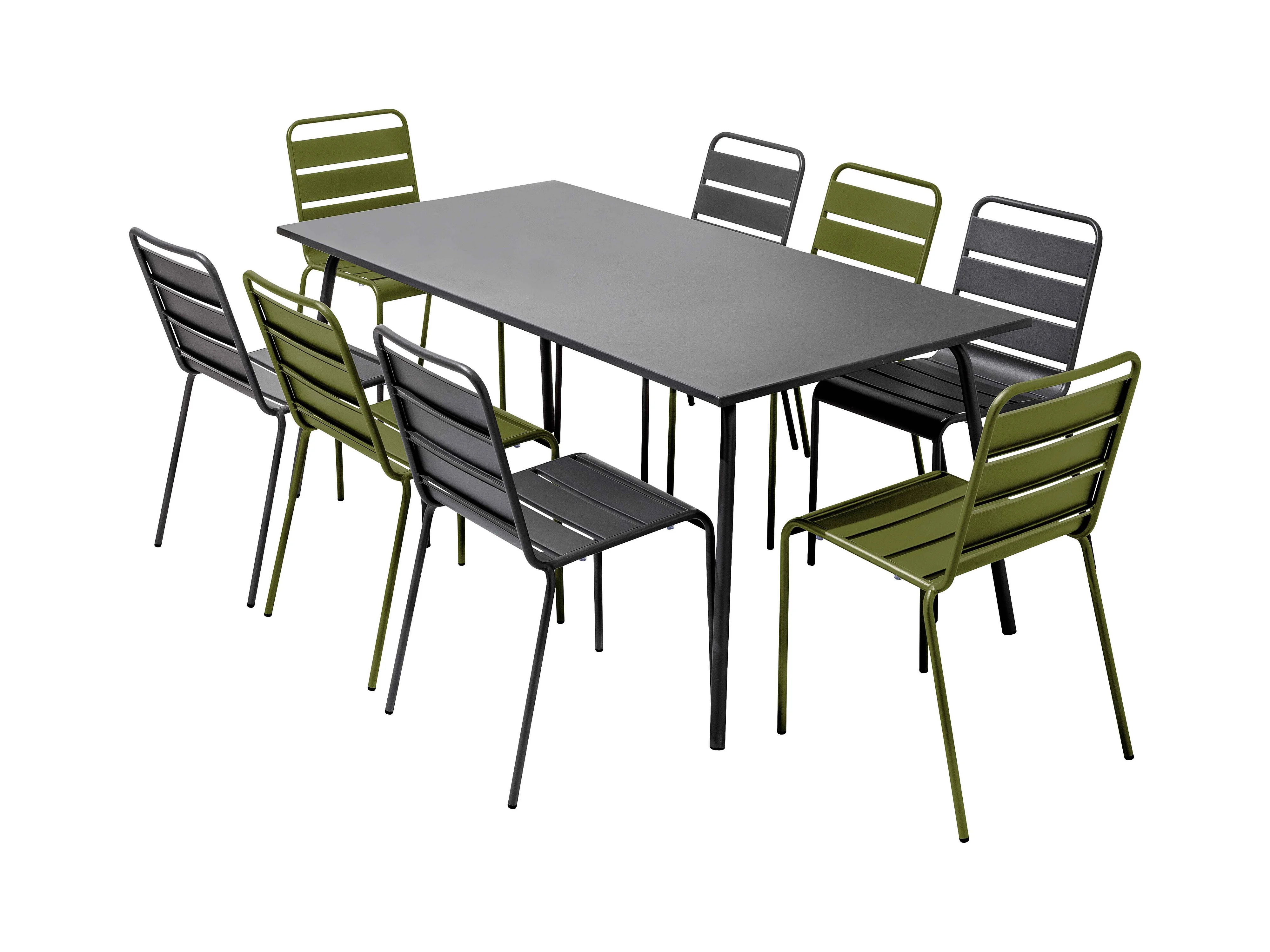 Ensemble table de jardin et 8 chaises en métal gris et vert kaki - Palavas