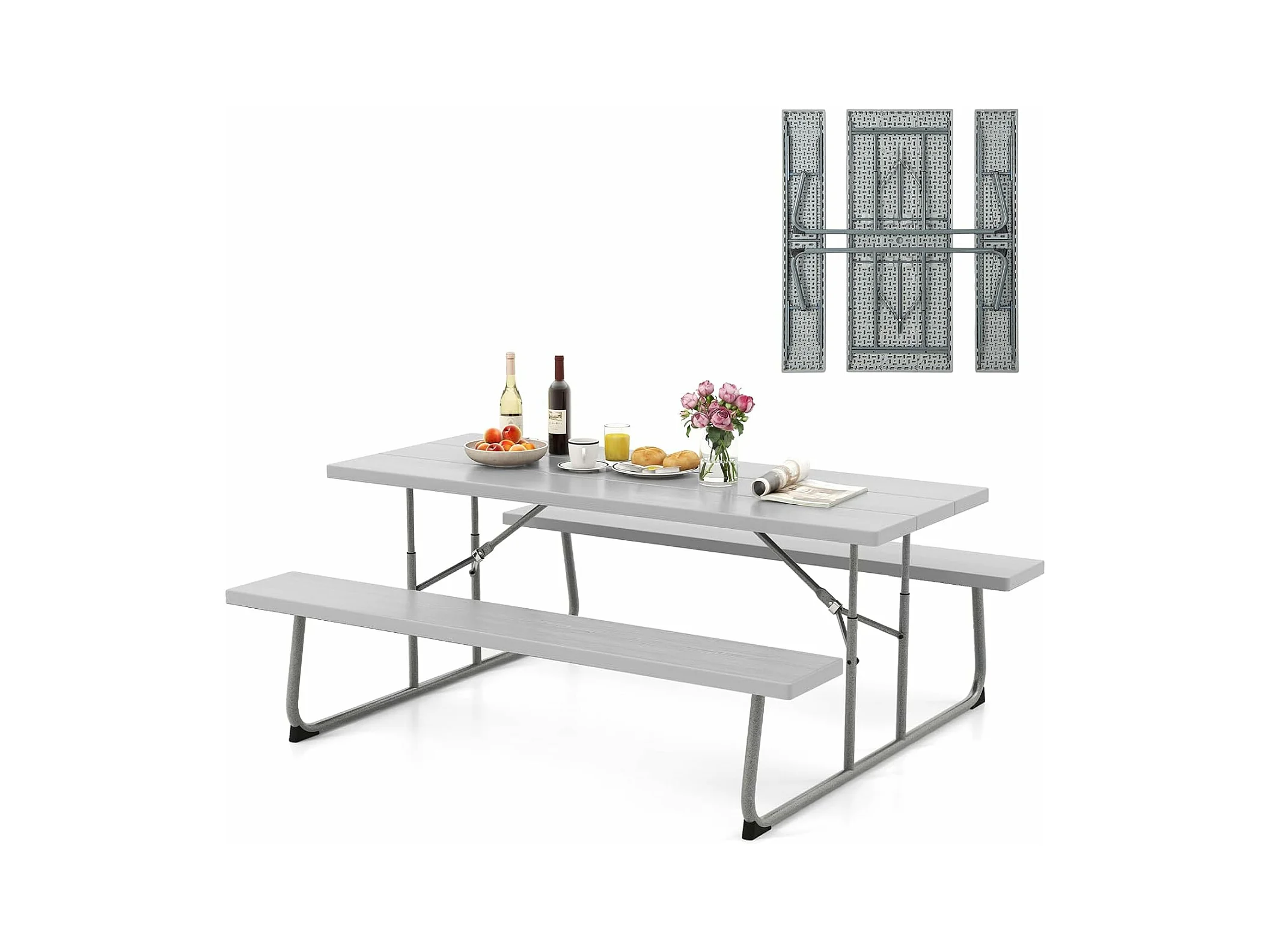 Ensemble Table et Bancs de Pique-Nique Pliable, Ensemble de Meubles Jardin avec Cadre Métallique, Trou pour Parasol, Banc Charge 250KG, 183 x 163 x 74 cm (Gris)