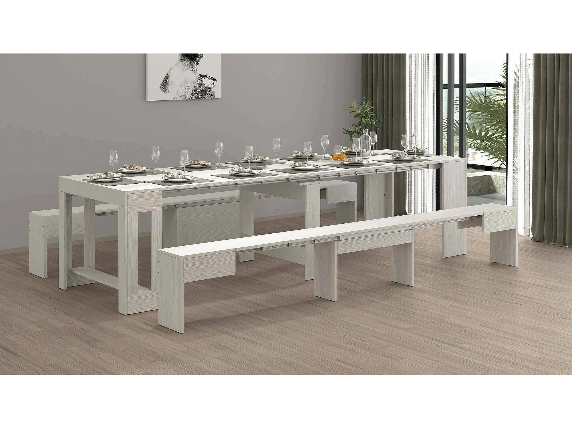 Ensemble table et chaises Dadamoni, Composition polyvalente, Ensemble avec console et 2 bancs extensibles, 100% Made in Italy, 66x25h45 cm, Blanc