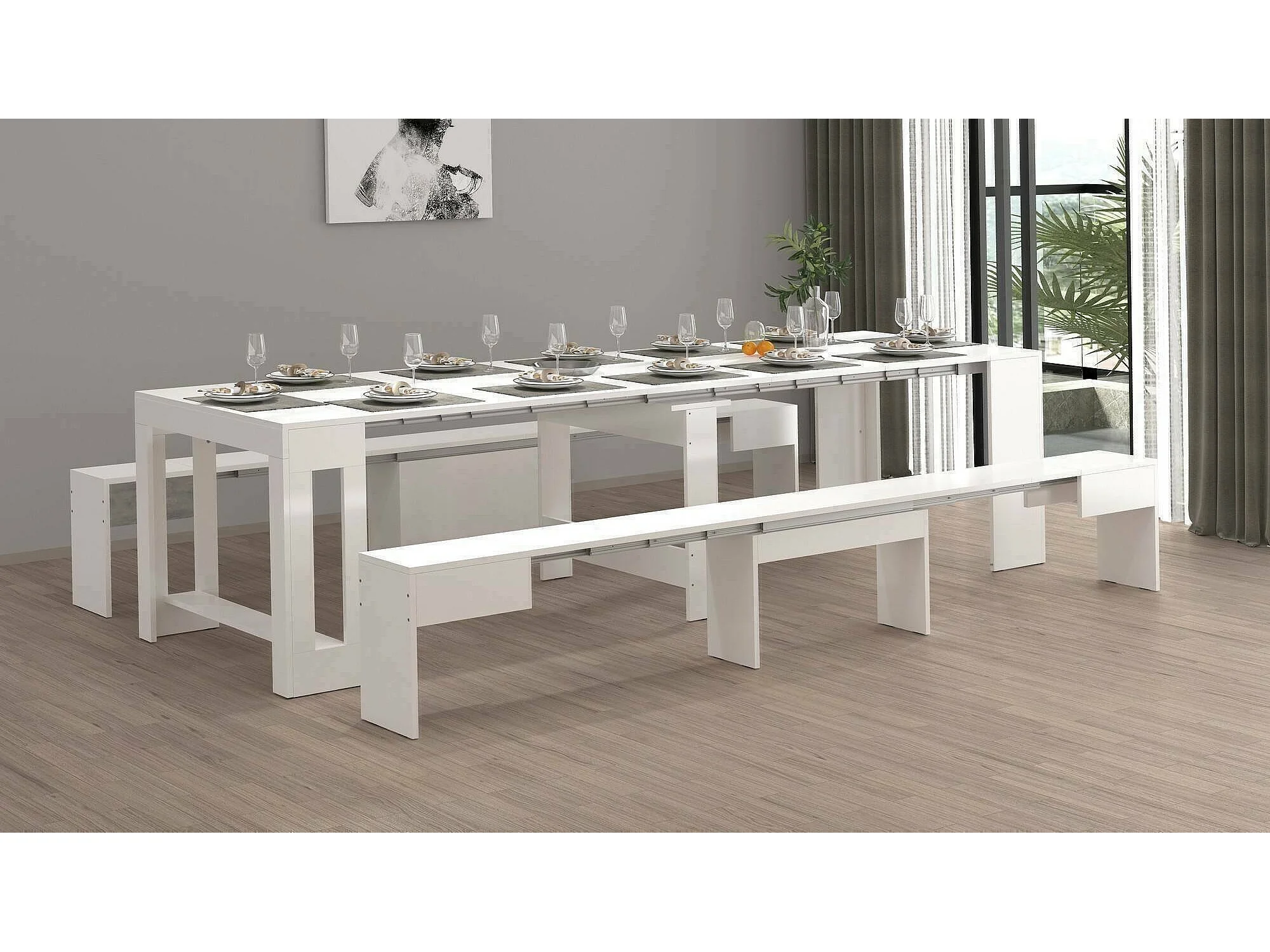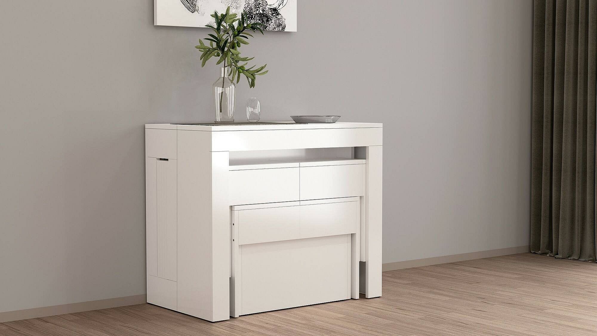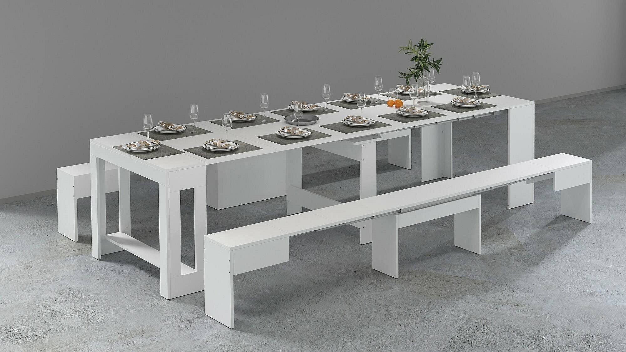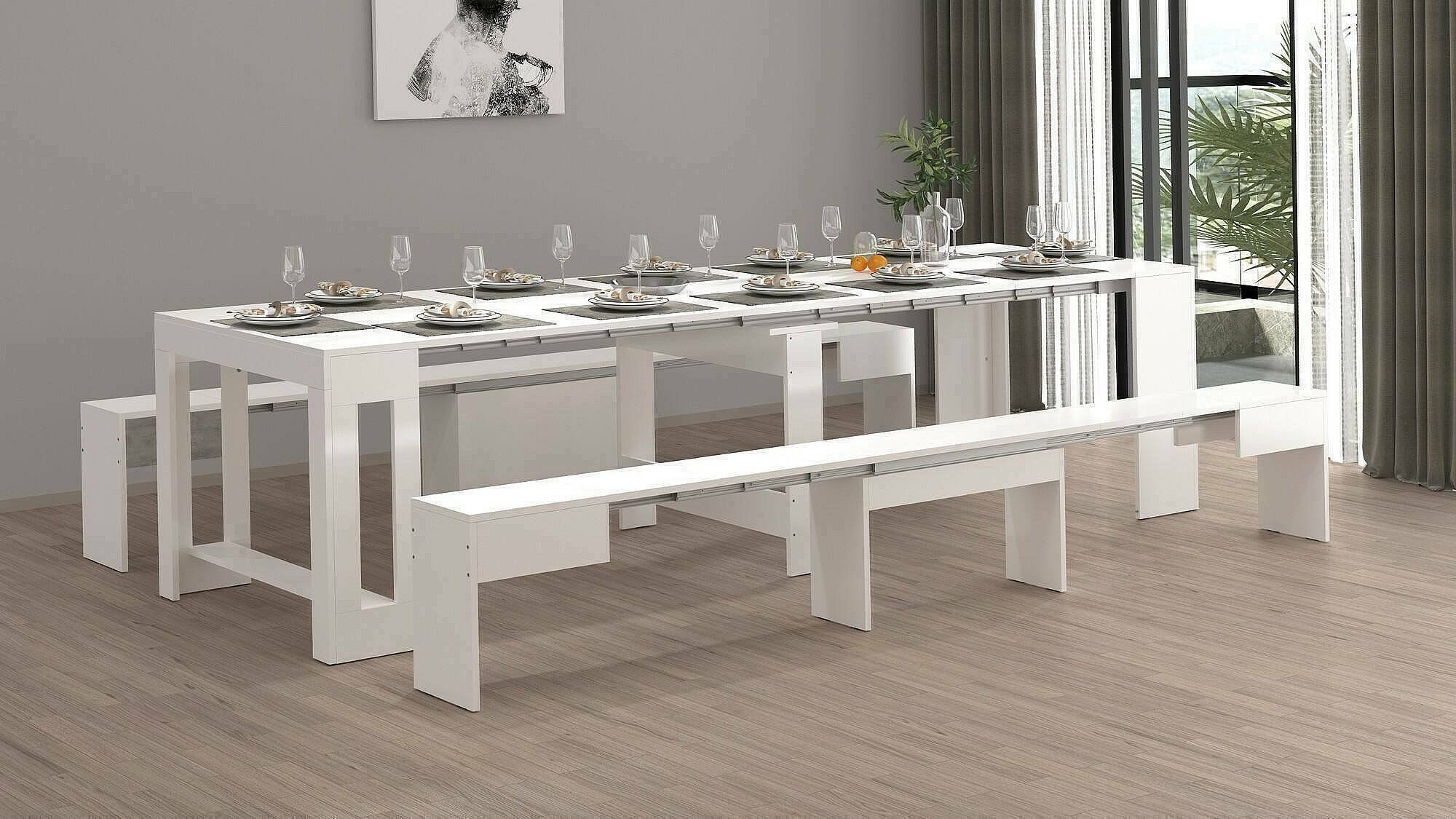 Ensemble table et chaises Dadamoni, Composition polyvalente, Ensemble avec console et 2 bancs extensibles, 100% Made in Italy, 66x25h45 cm, Blanc brillant