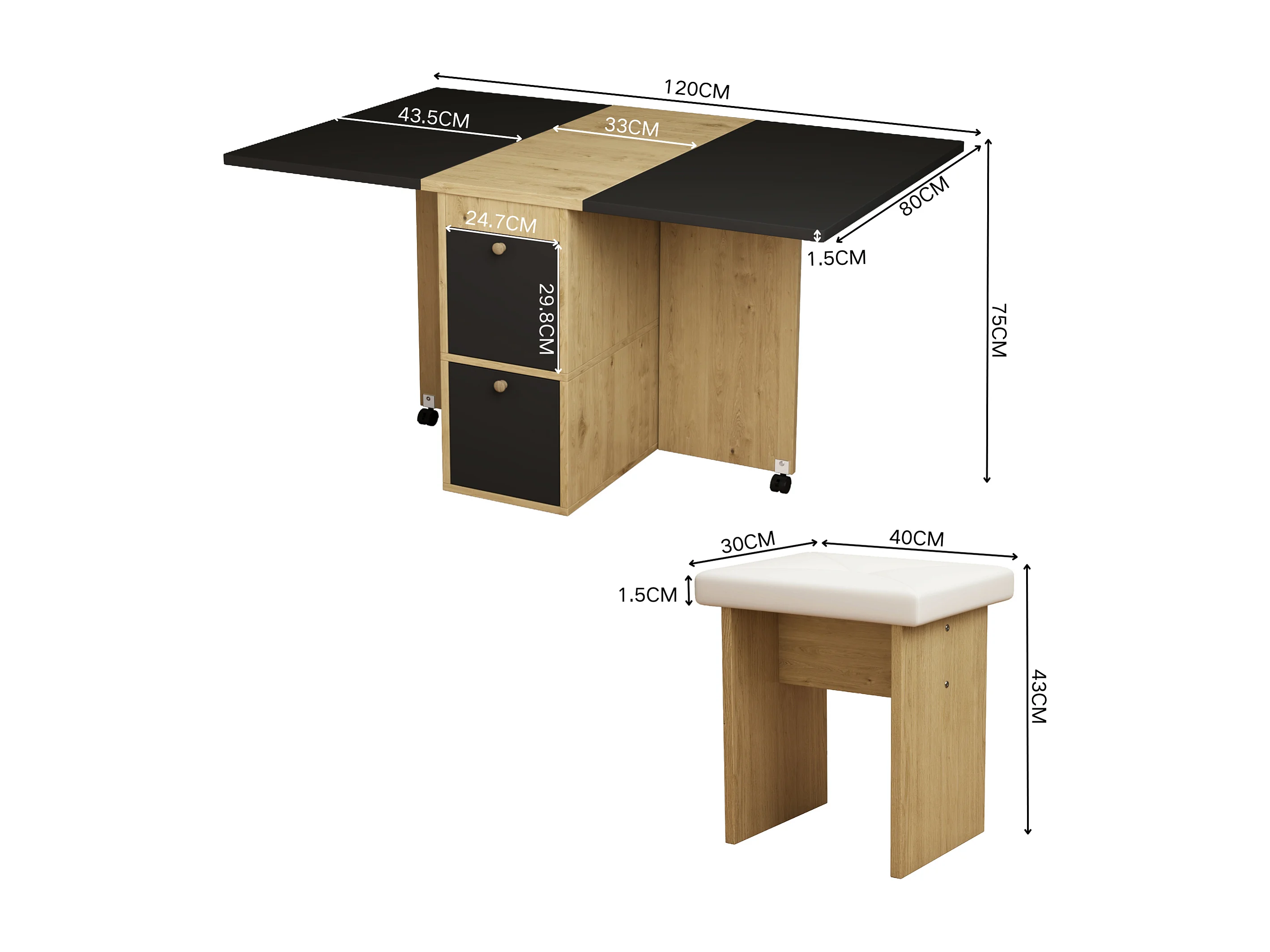 Ensemble table extensible et chaises - 120 x 80 x 75 cm - avec table pliable + 4 chaises + 2 rangements - aggloméré + PU - noir