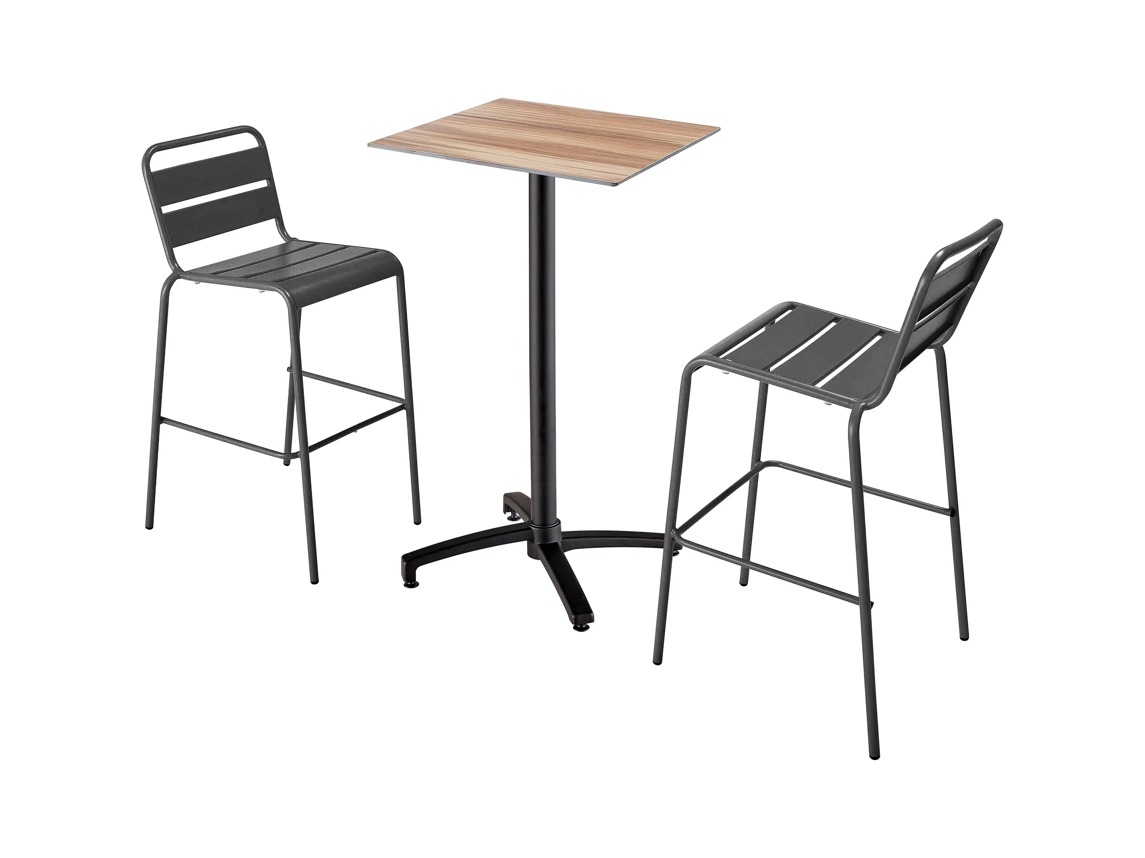 Ensemble table haute stratifié chêne foncé et 2 chaises hautes gris