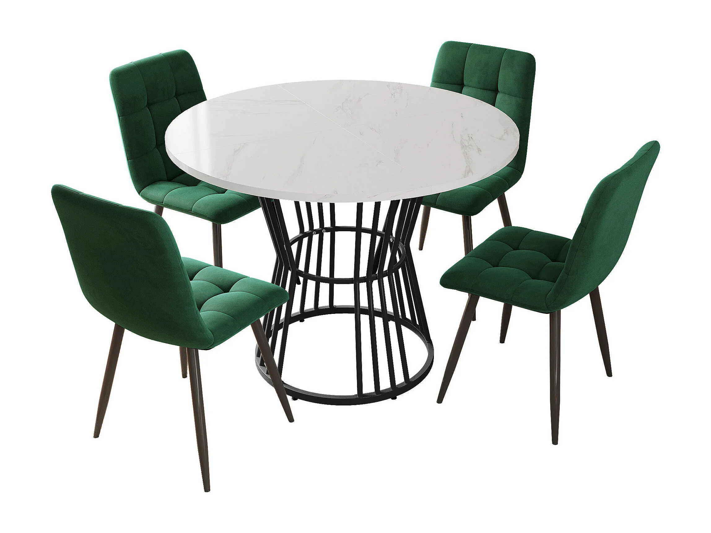 Ensemble table ronde + 4 chaises en velours - D 100 x H 75 cm - MDF et pièds en métal - Vert + blanc