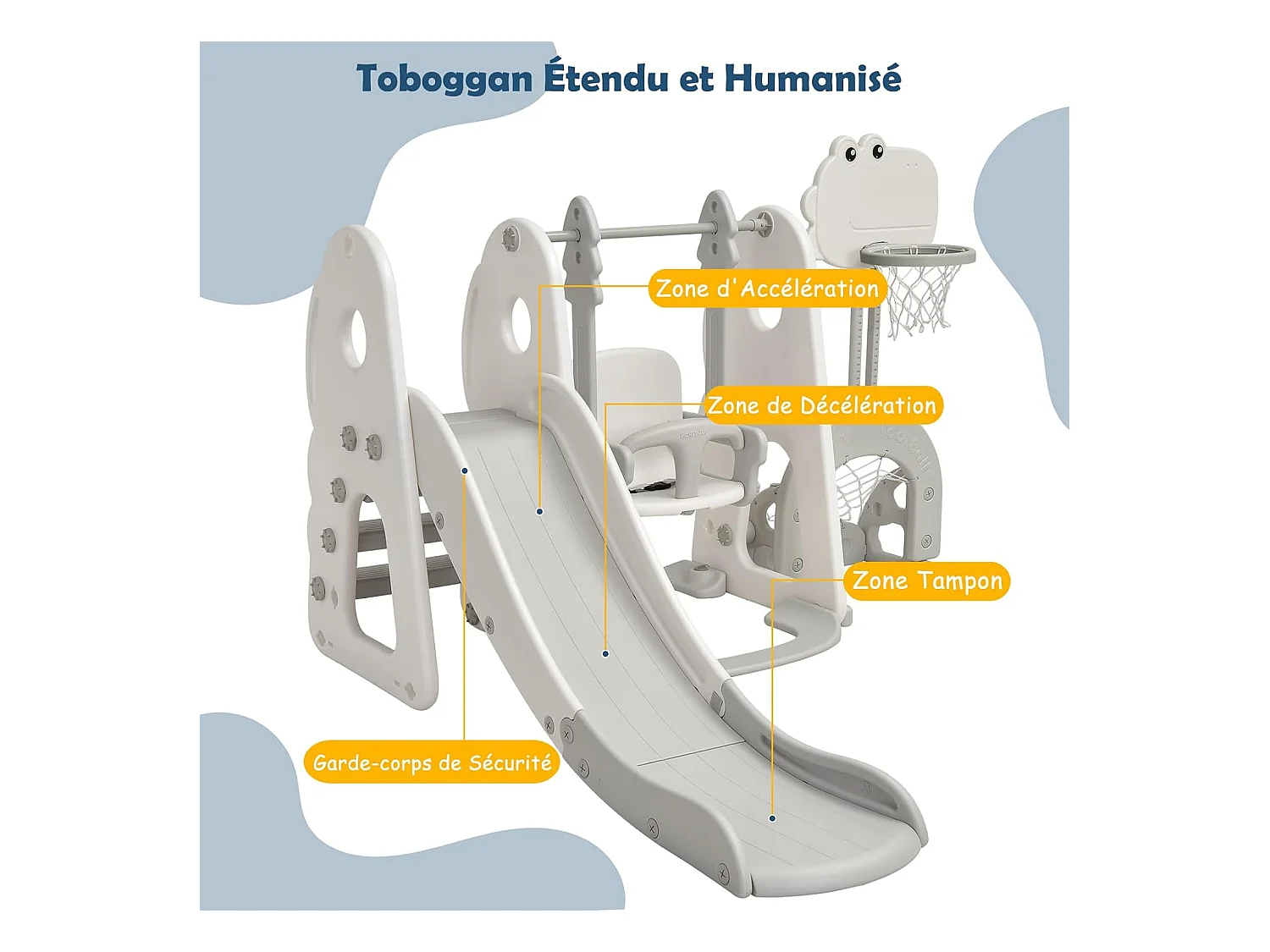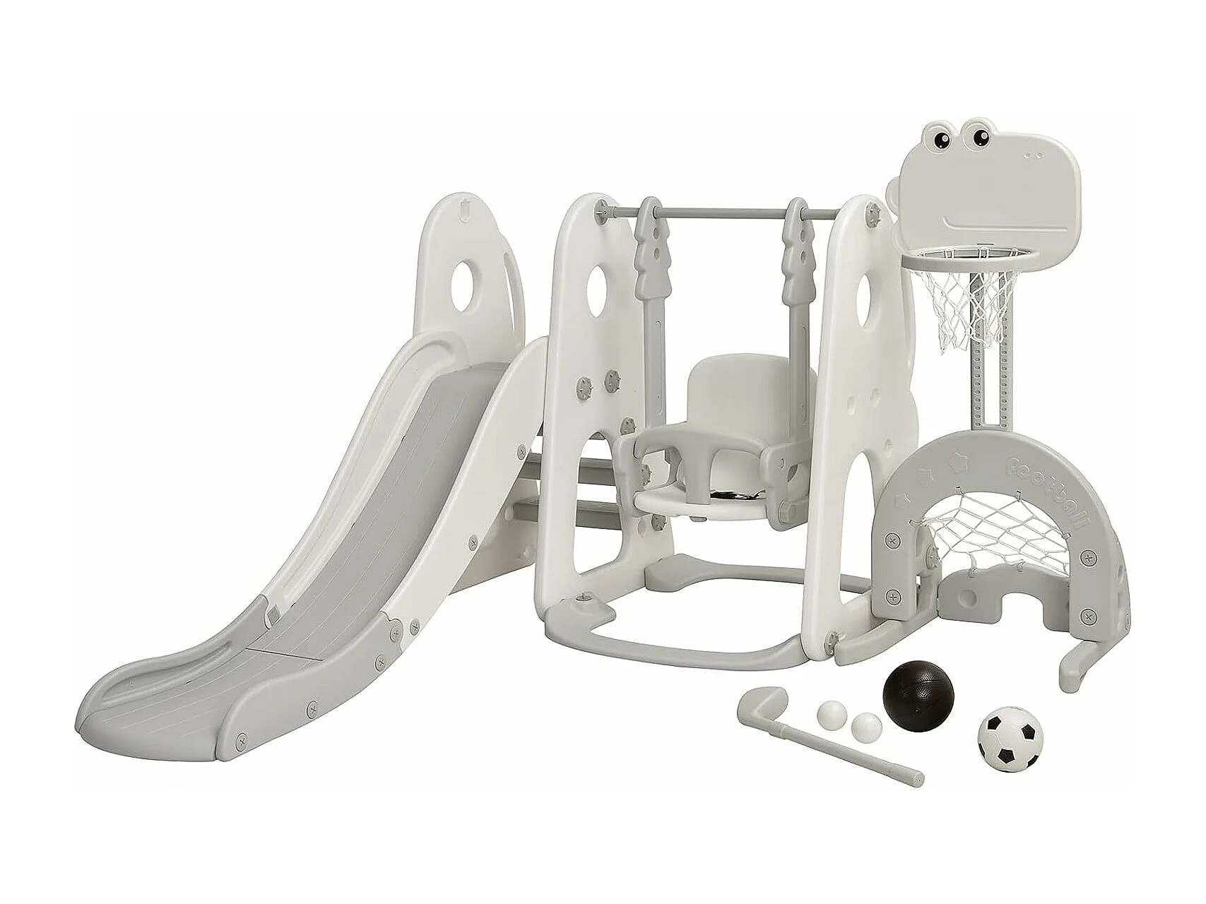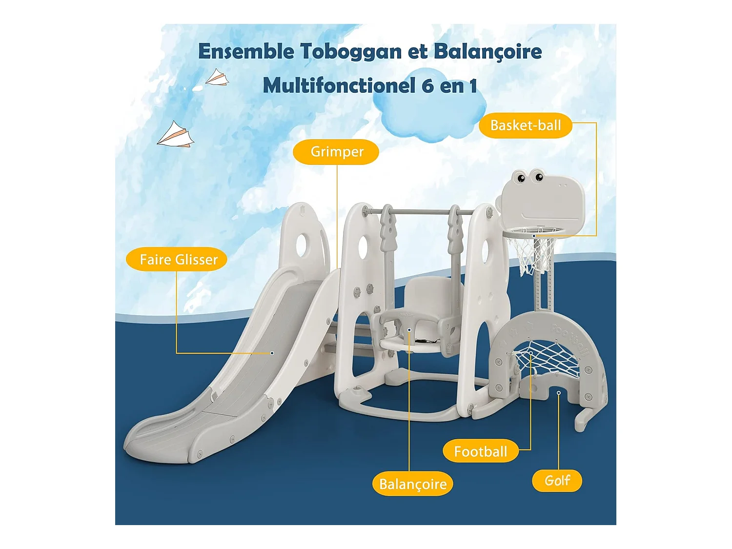 Ensemble Toboggan Balançoire 6 en 1 HDPE Basket-ball Football Escalade Golf pour Enfants 18 Mois+Gris+Blanc