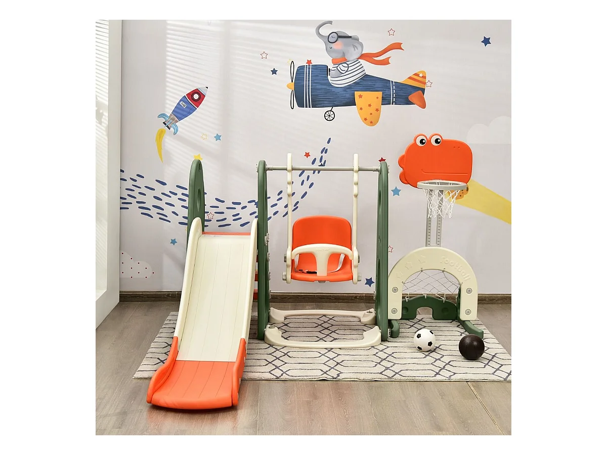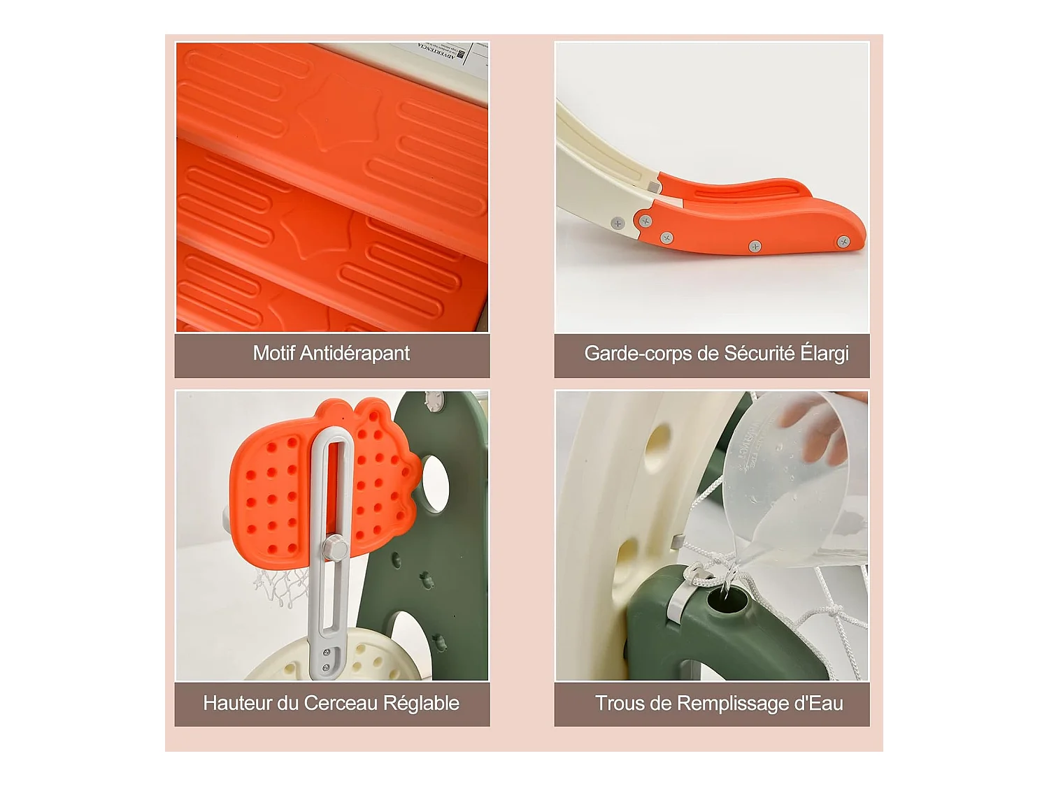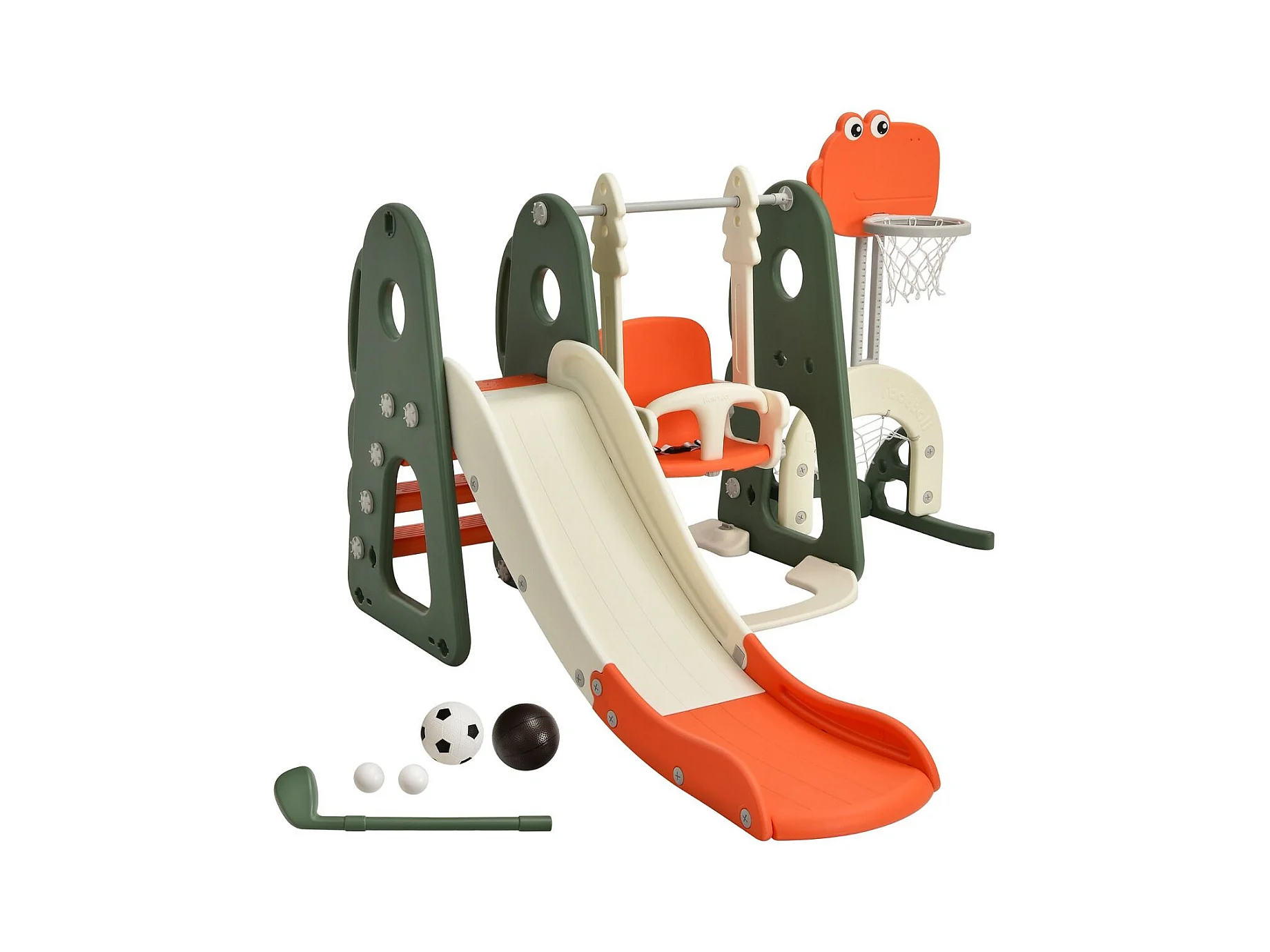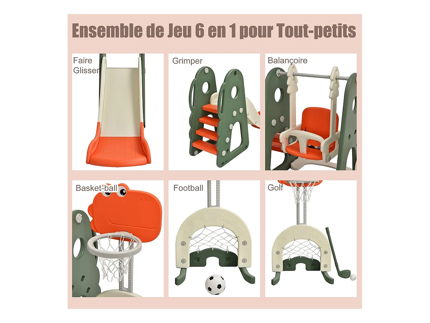 Ensemble Toboggan Balançoire 6 en 1 HDPE Basket-ball Football Escalade Golf pour Enfants 18 Mois+ Orange+Vert