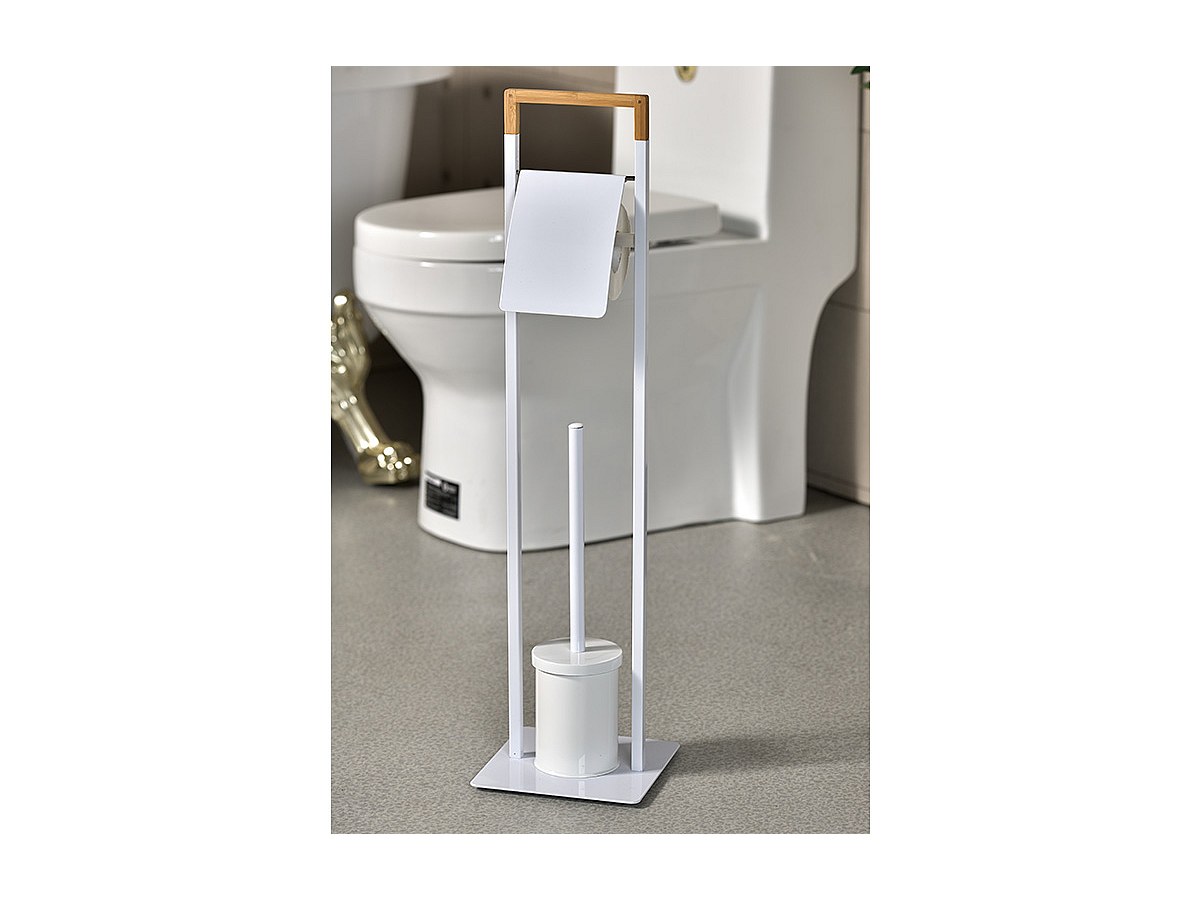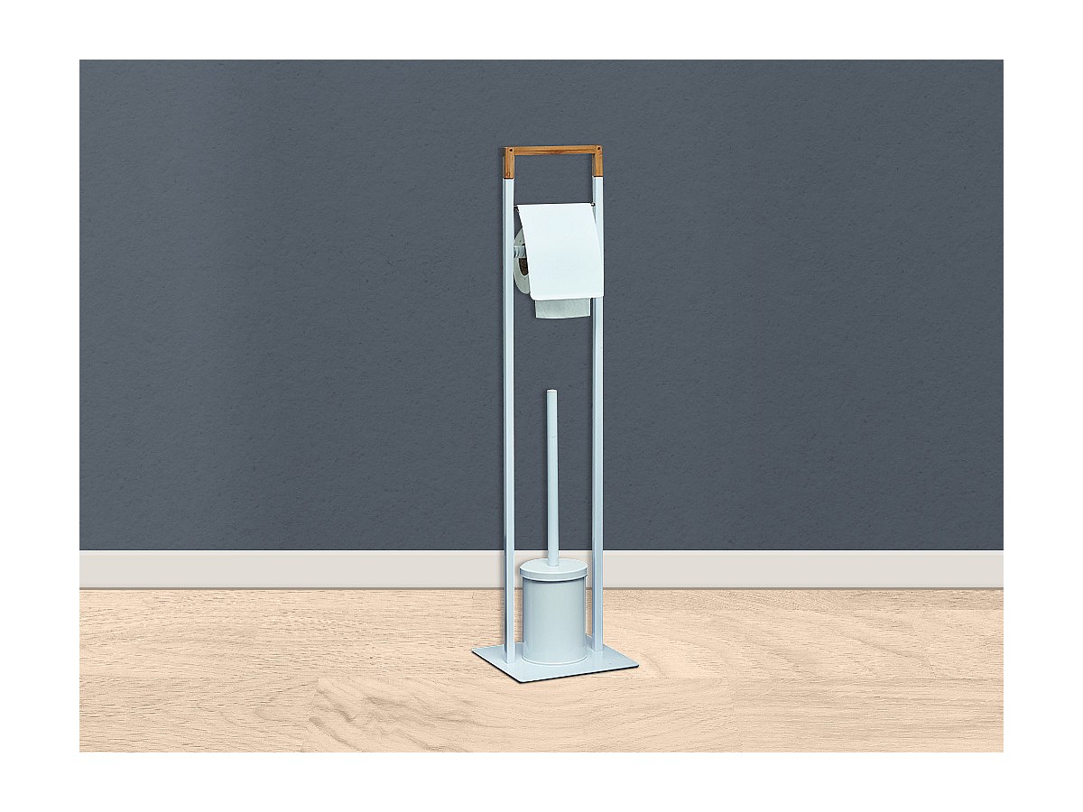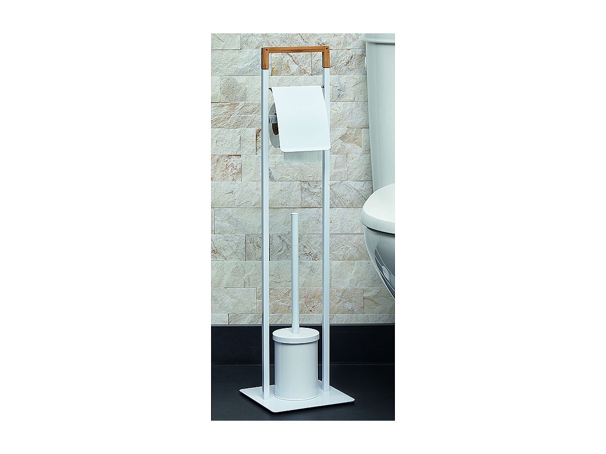 Ensemble toilettes NIKOLAOS porte-rouleau et brosse pour WC - Métal et bambou - Blanc et bois