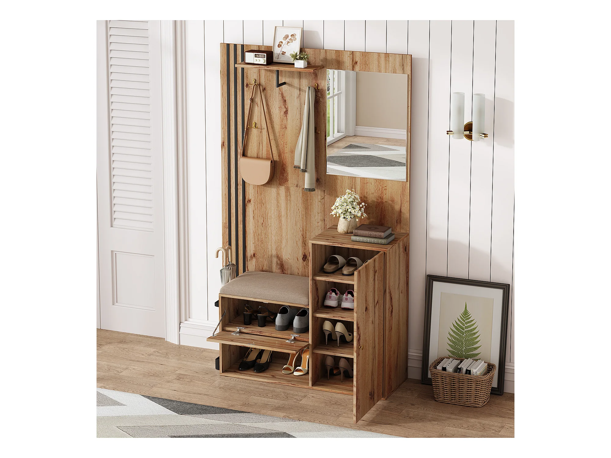 Vestiaire avec porte manteau + meuble à chaussures + miroir - Naturel
