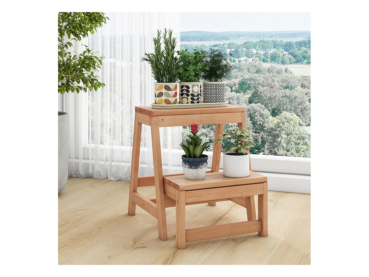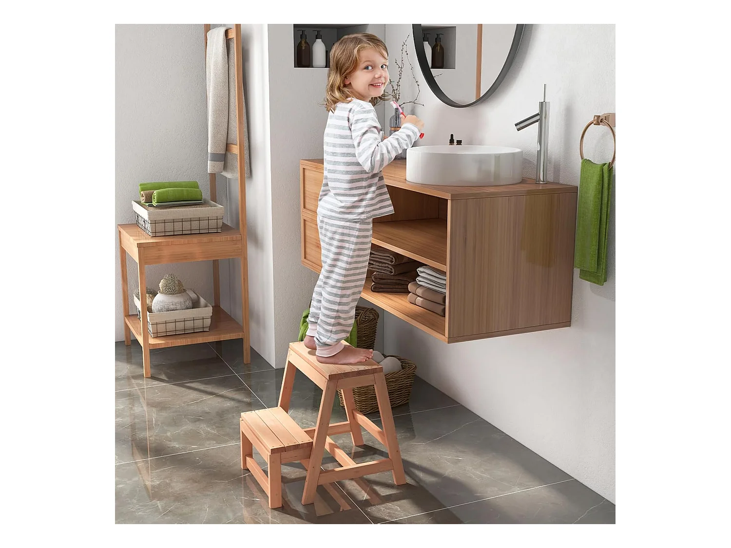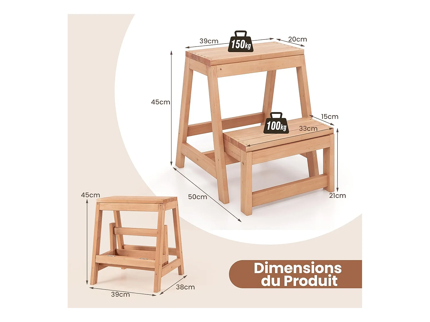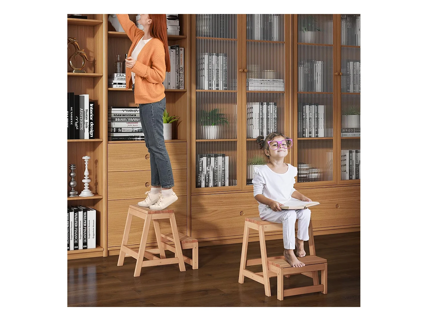 Escabeau 2 Marches Pliable, Marche Pied en Bois de Sapin 3 en 1, Tabouret Enfants et Adultes, Structure en H, Charge 250 kg, 50 × 39 × 45 cm, Naturel