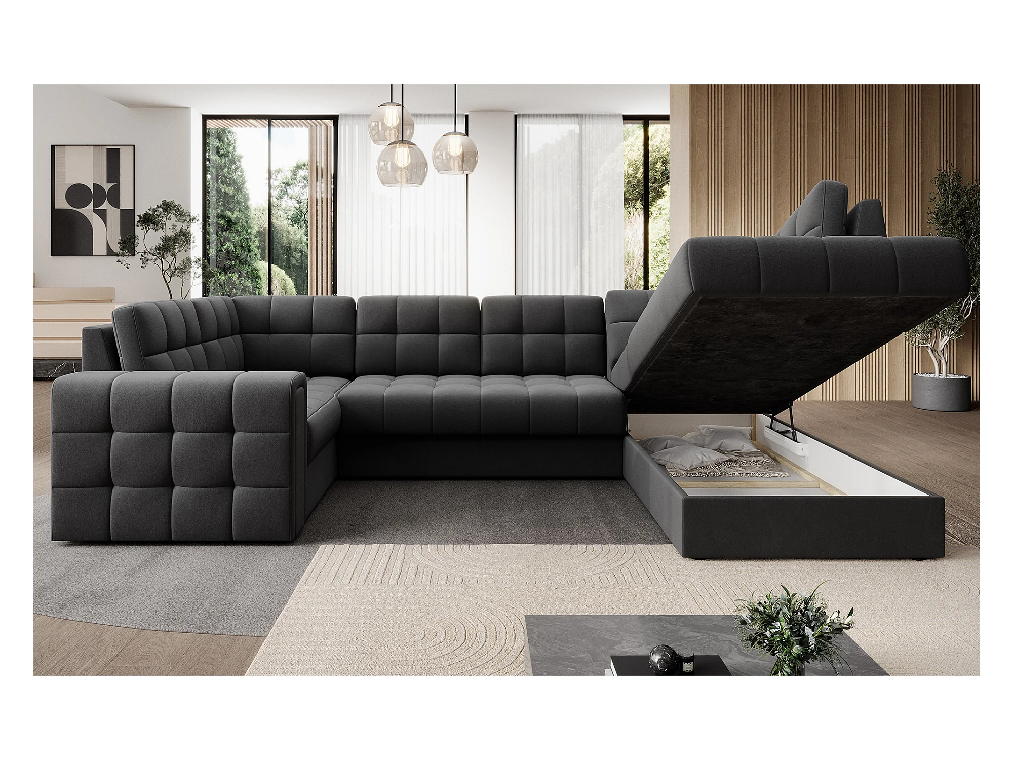 Canapé en U convertible KALANTE velours - Coffre de rangement et appuie-têtes réglables-Gris-Coffre à droite