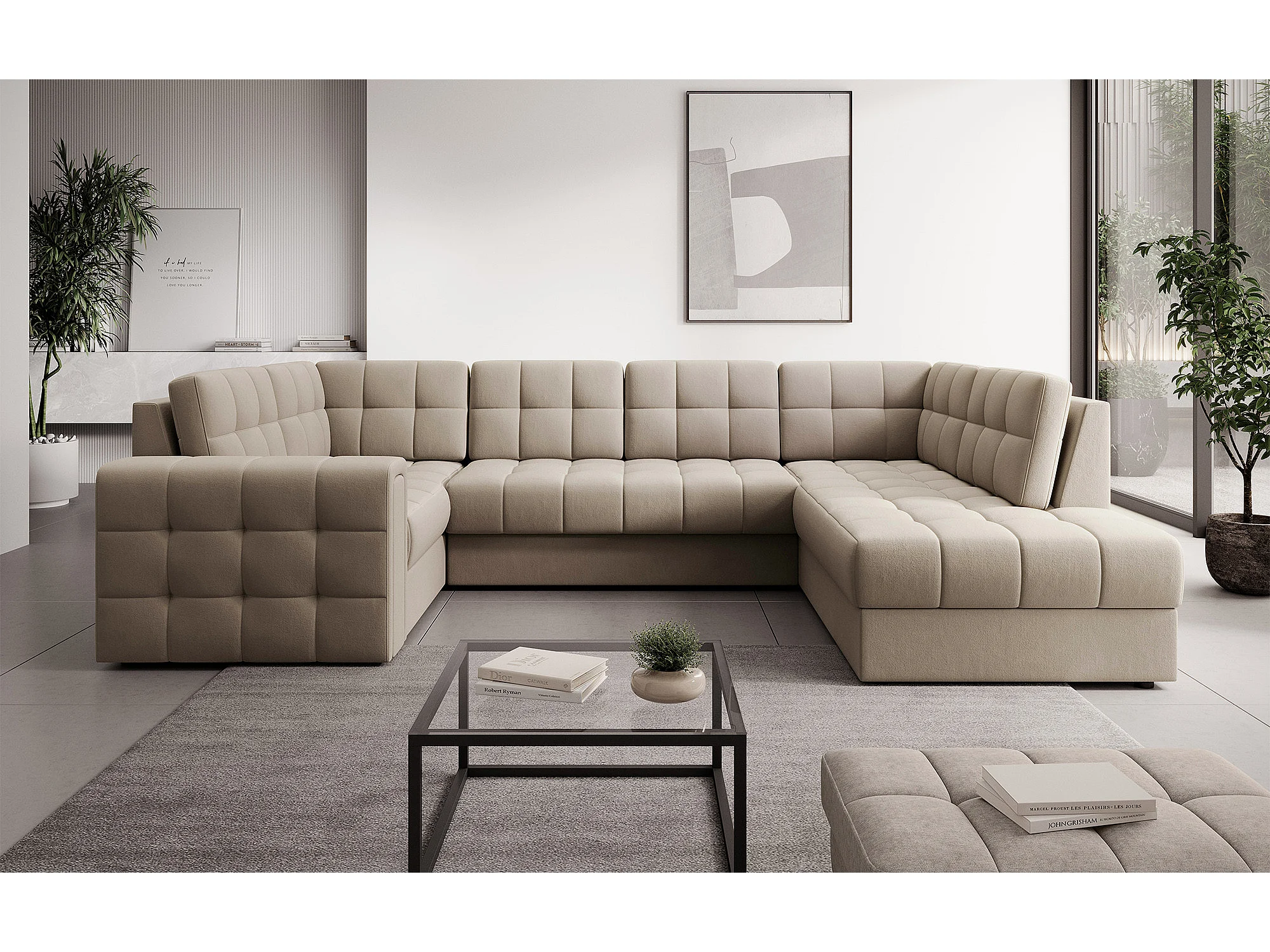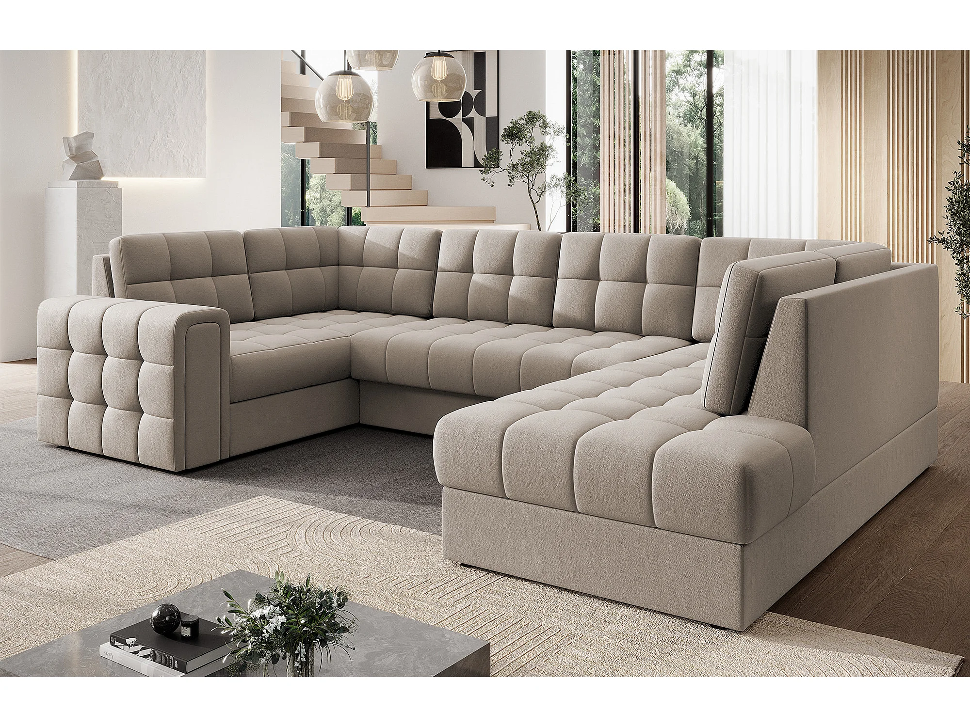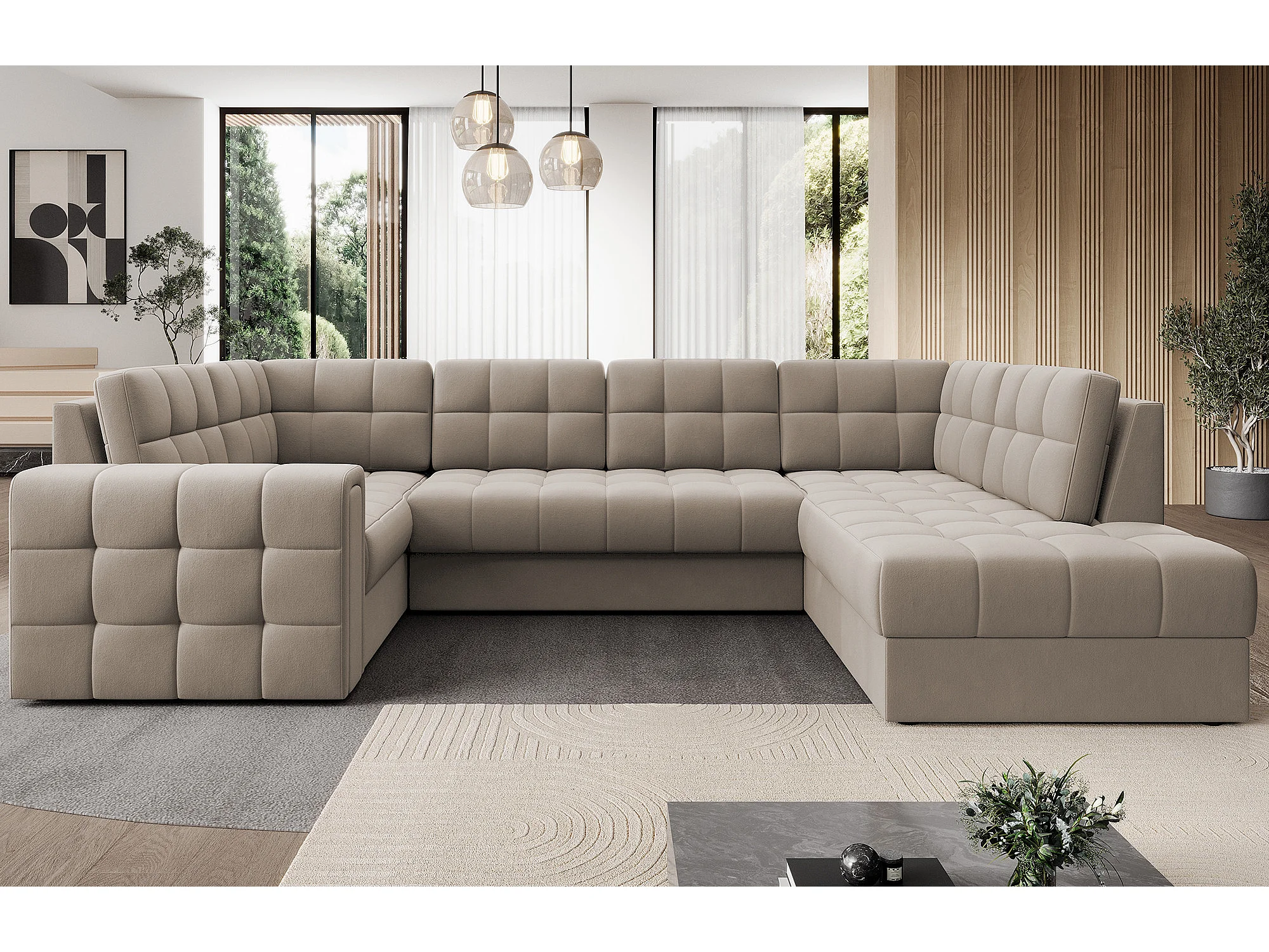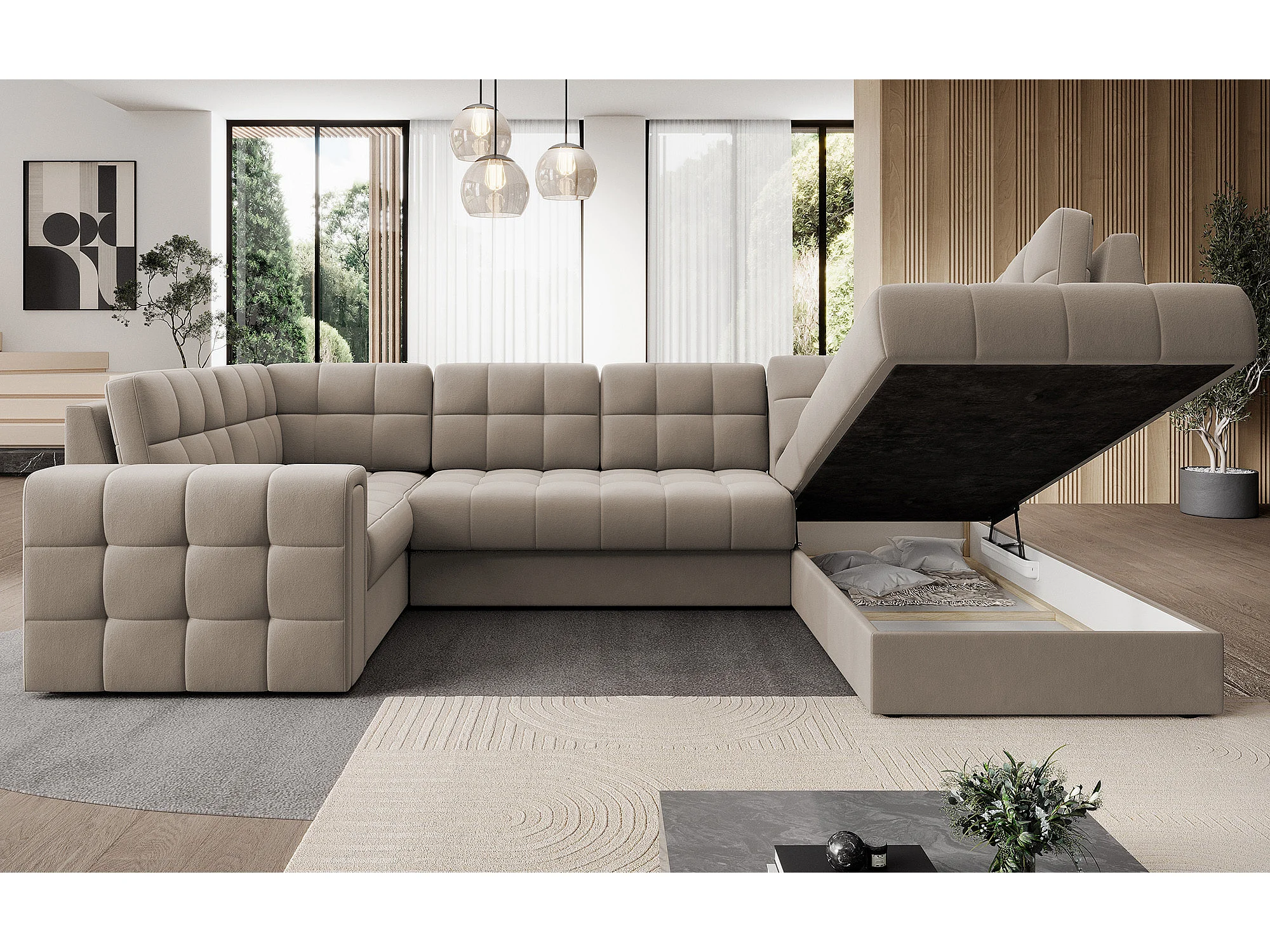 Canapé panoramique BLOOM velours capitonné - Rangement et convertible-Taupe-Coffre de rangement à droite