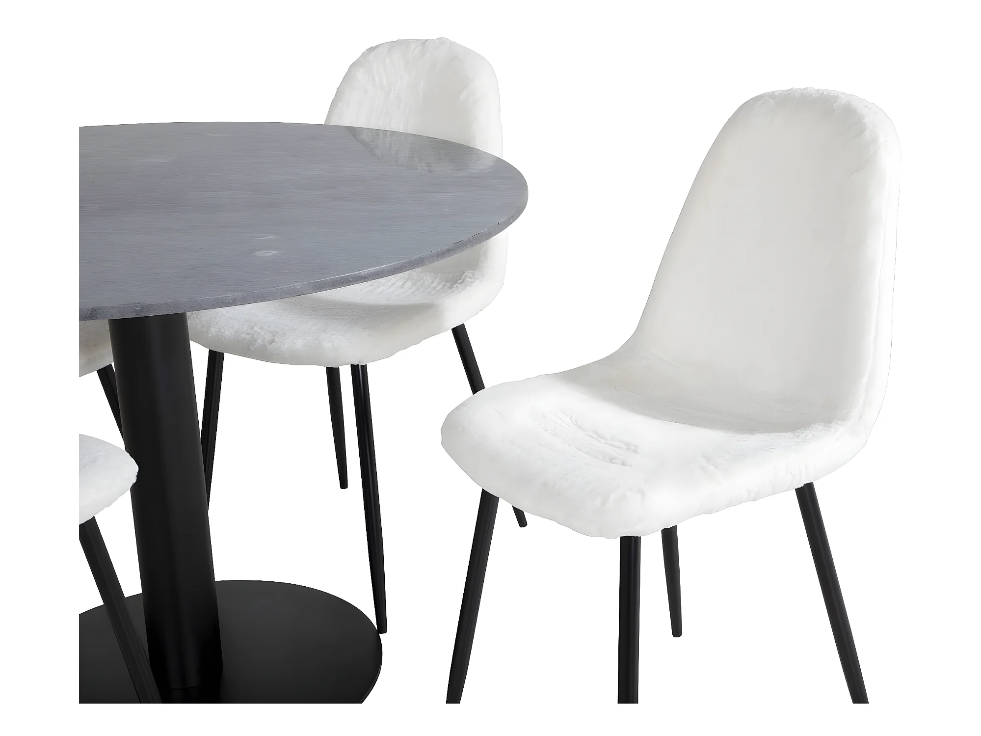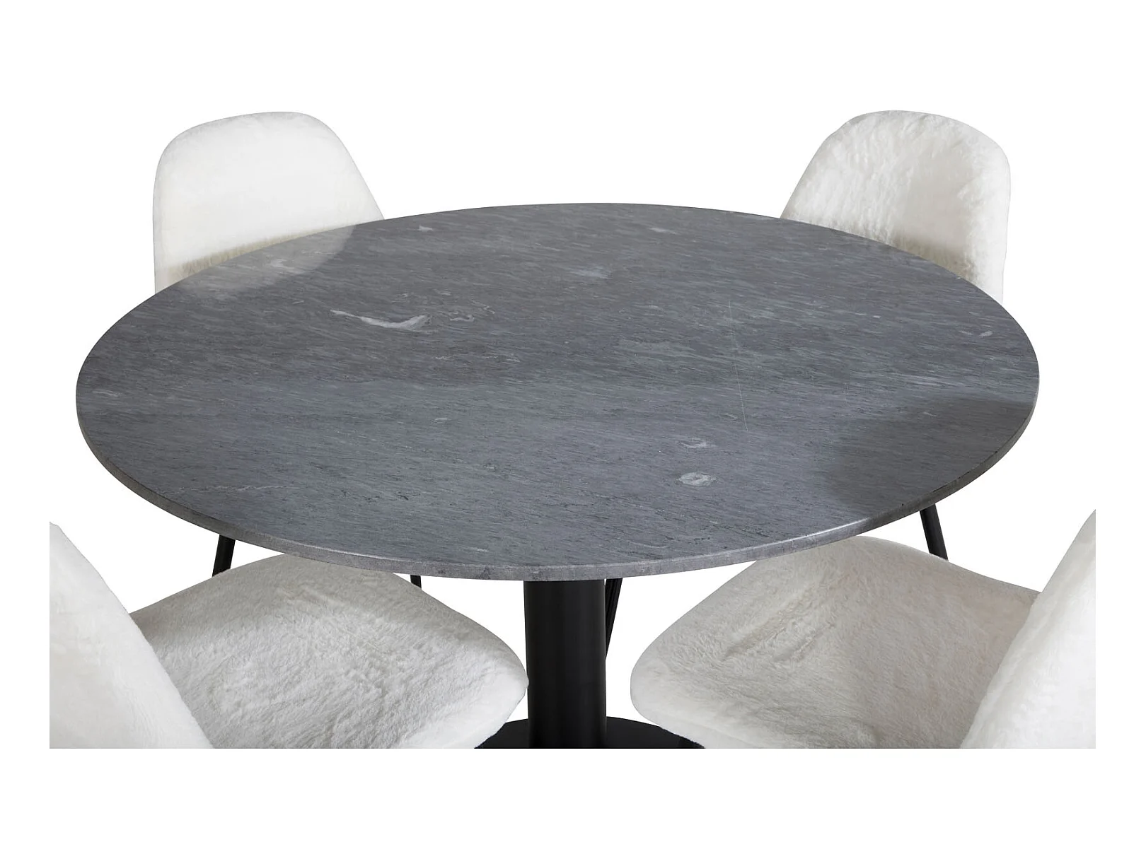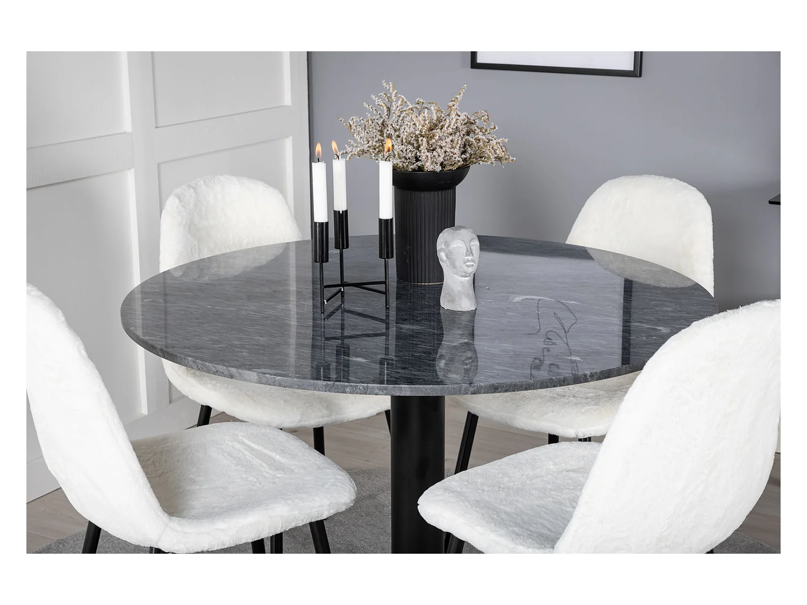 EstelleØ106BLBL ensemble table, table noir, marbre et 4 Polar Fluff chaises Teddy blanc.