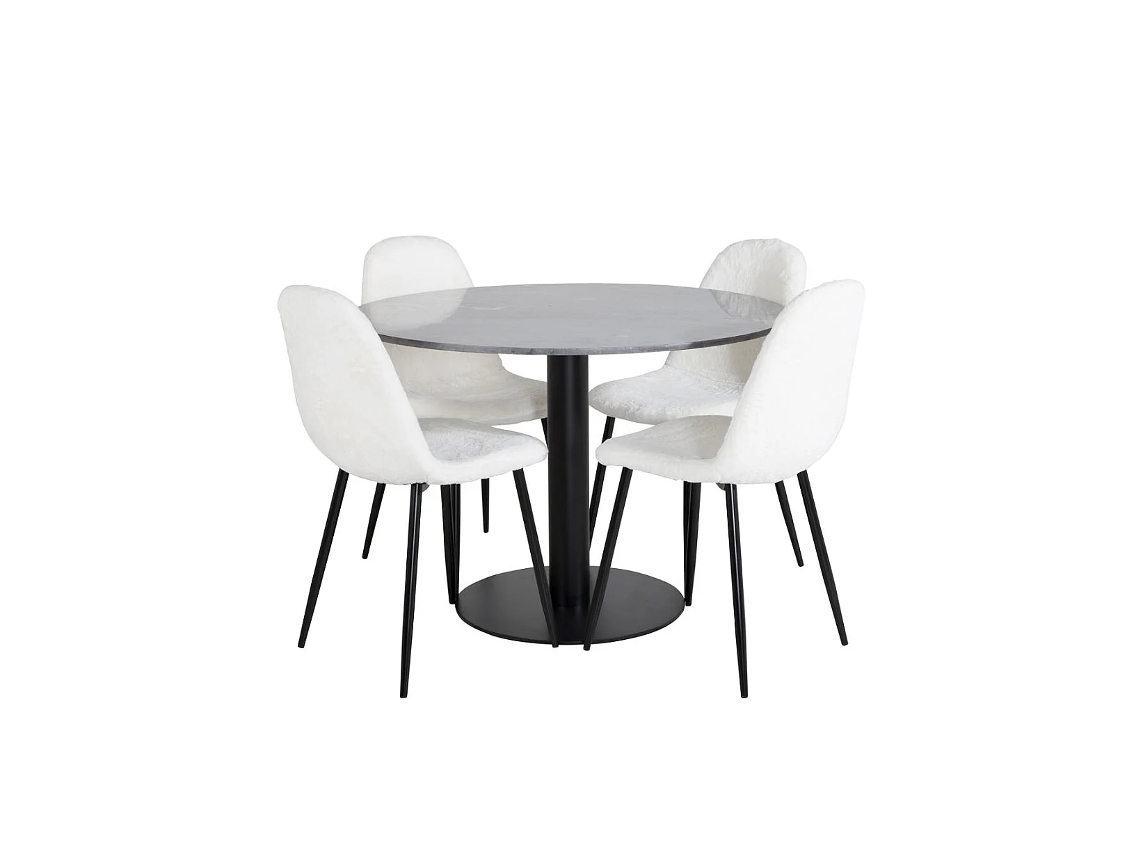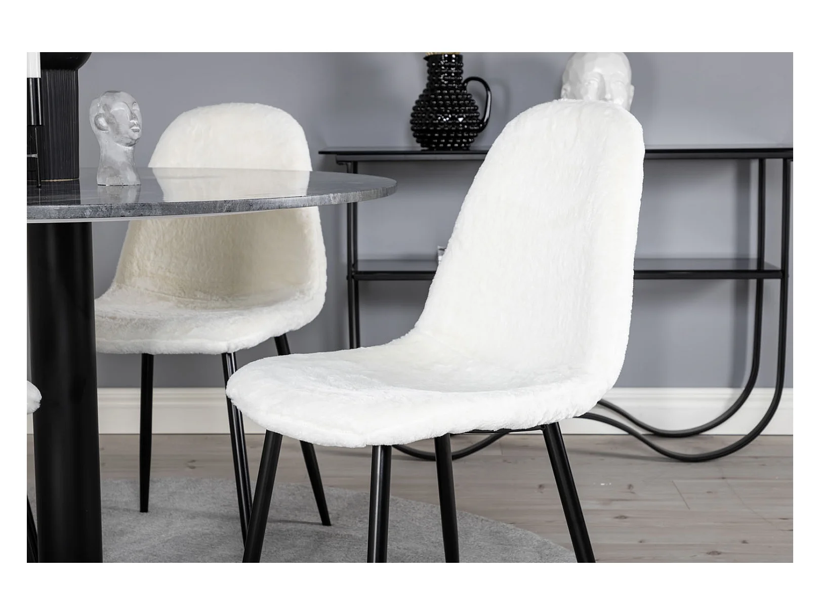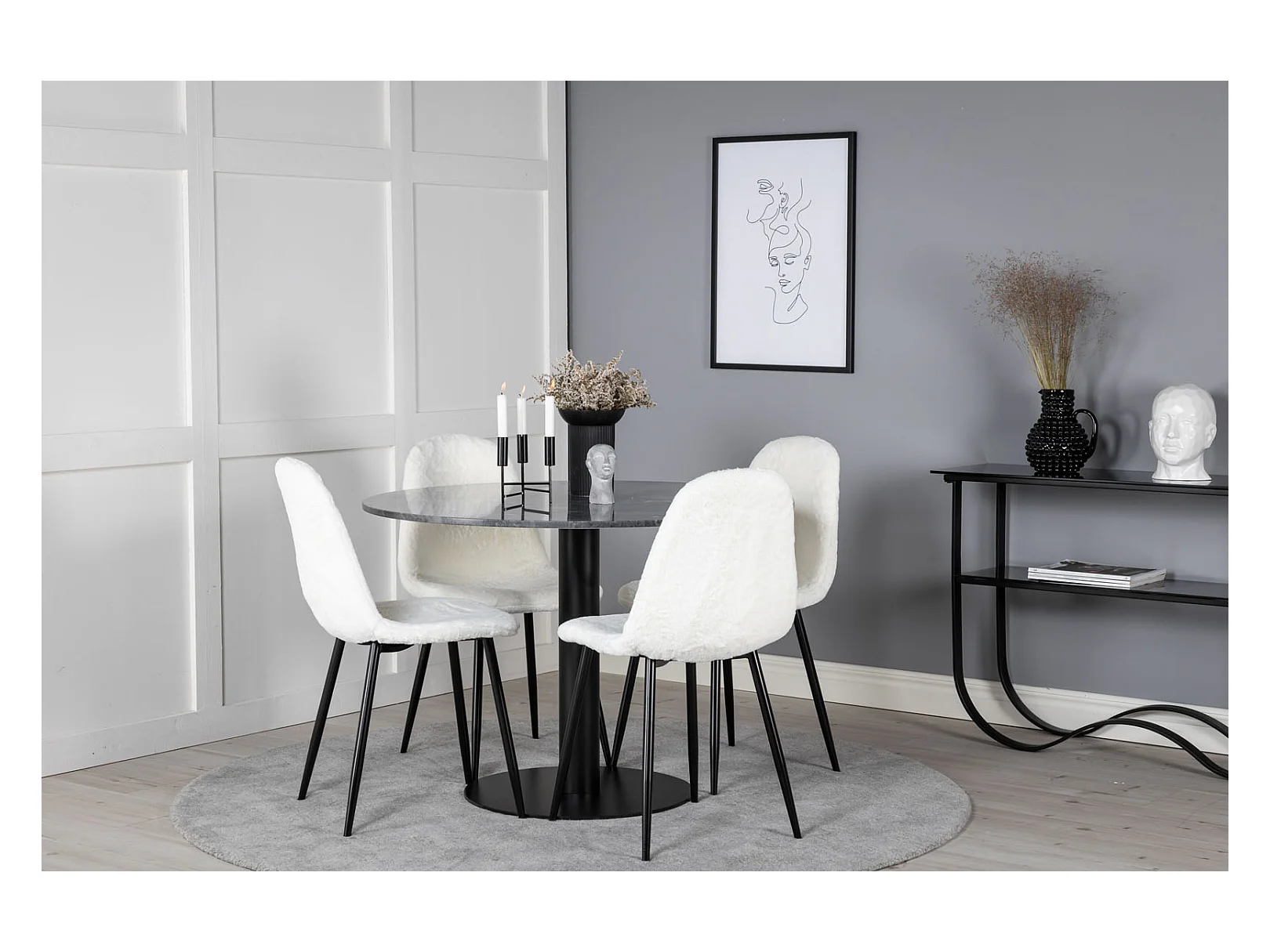 EstelleØ106BLBL ensemble table, table noir, marbre et 4 Polar Fluff chaises Teddy blanc.