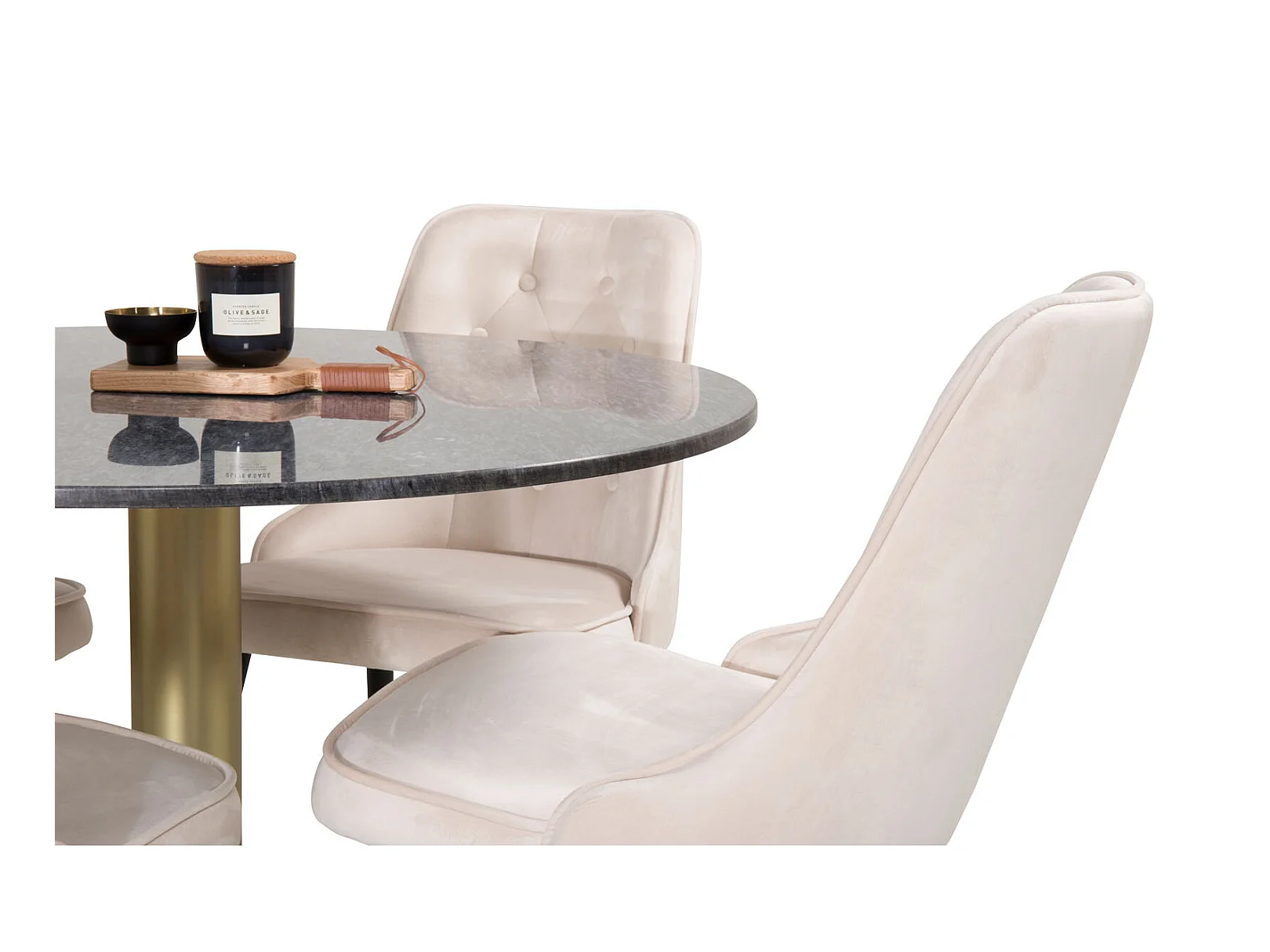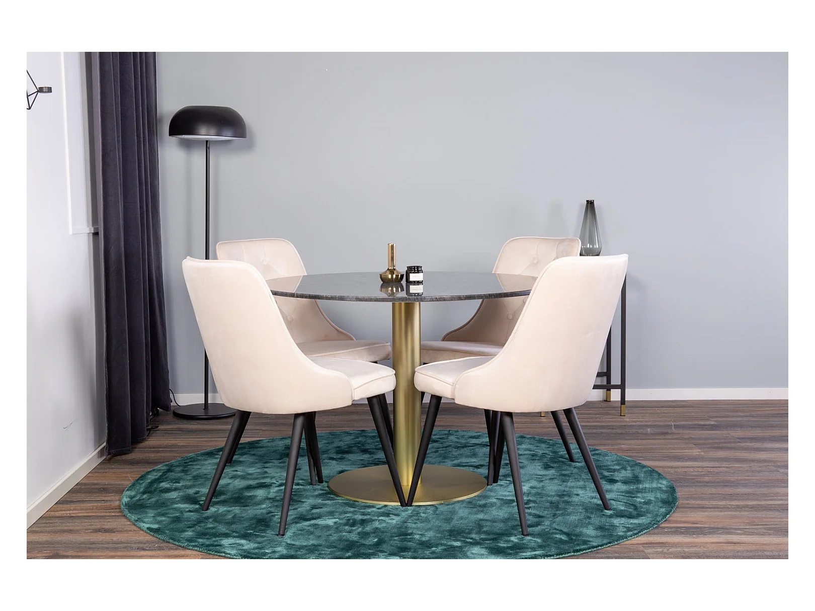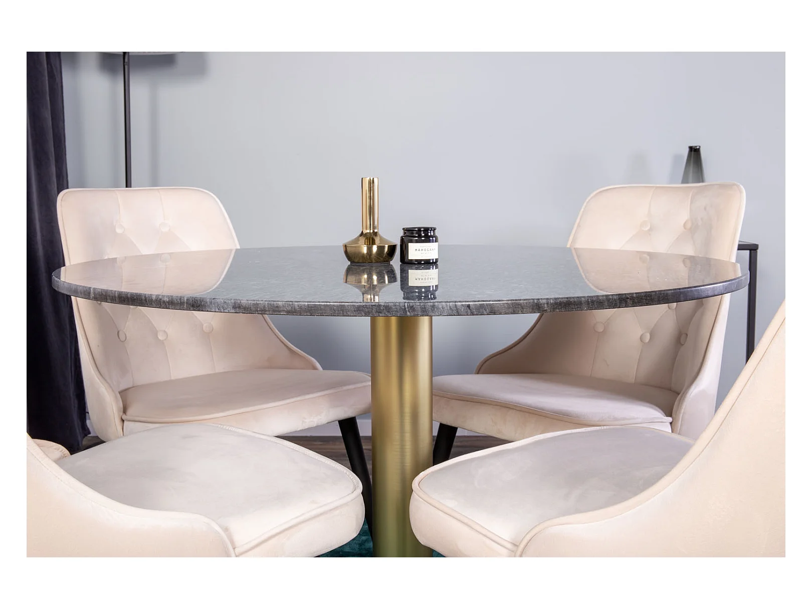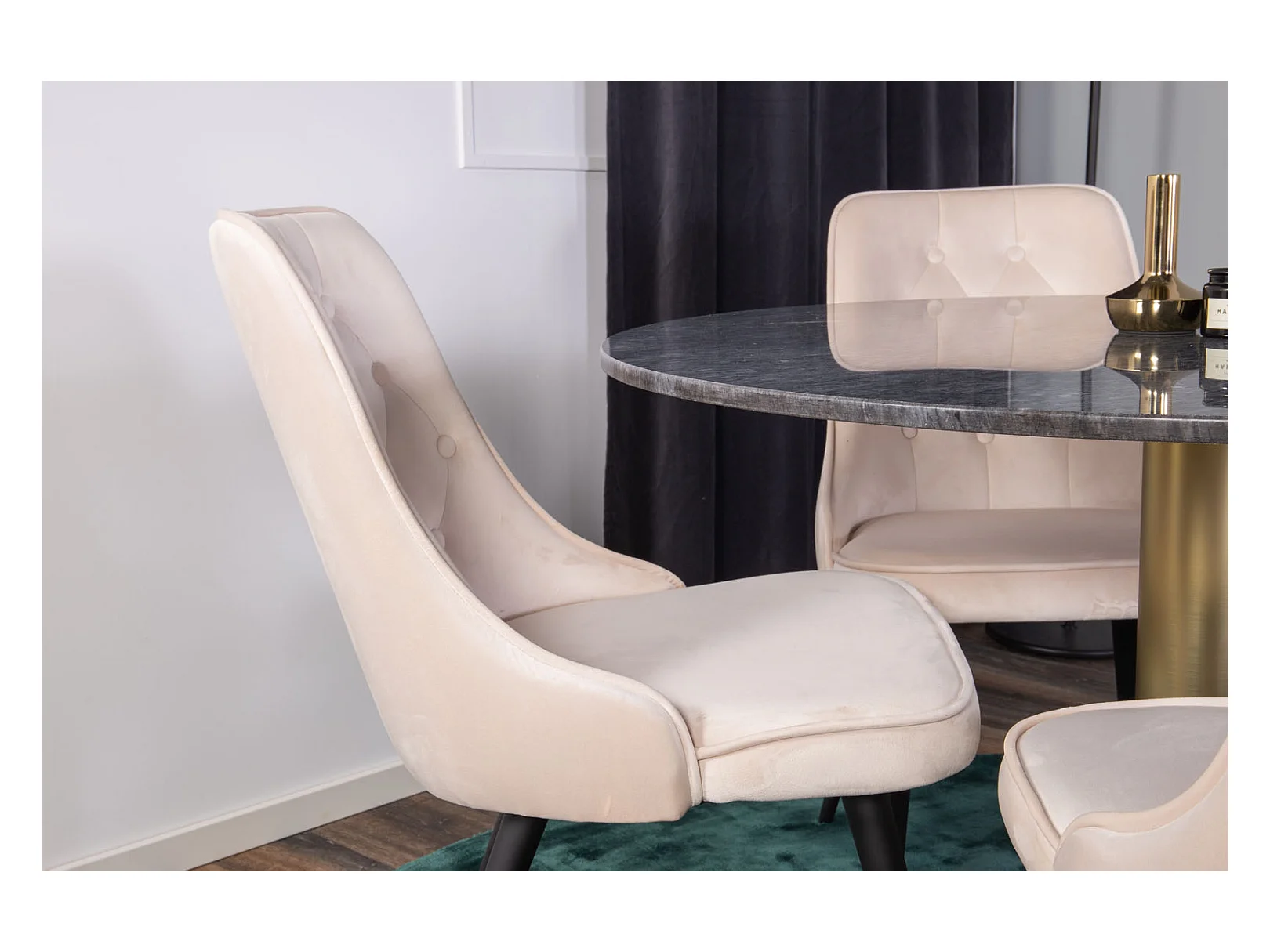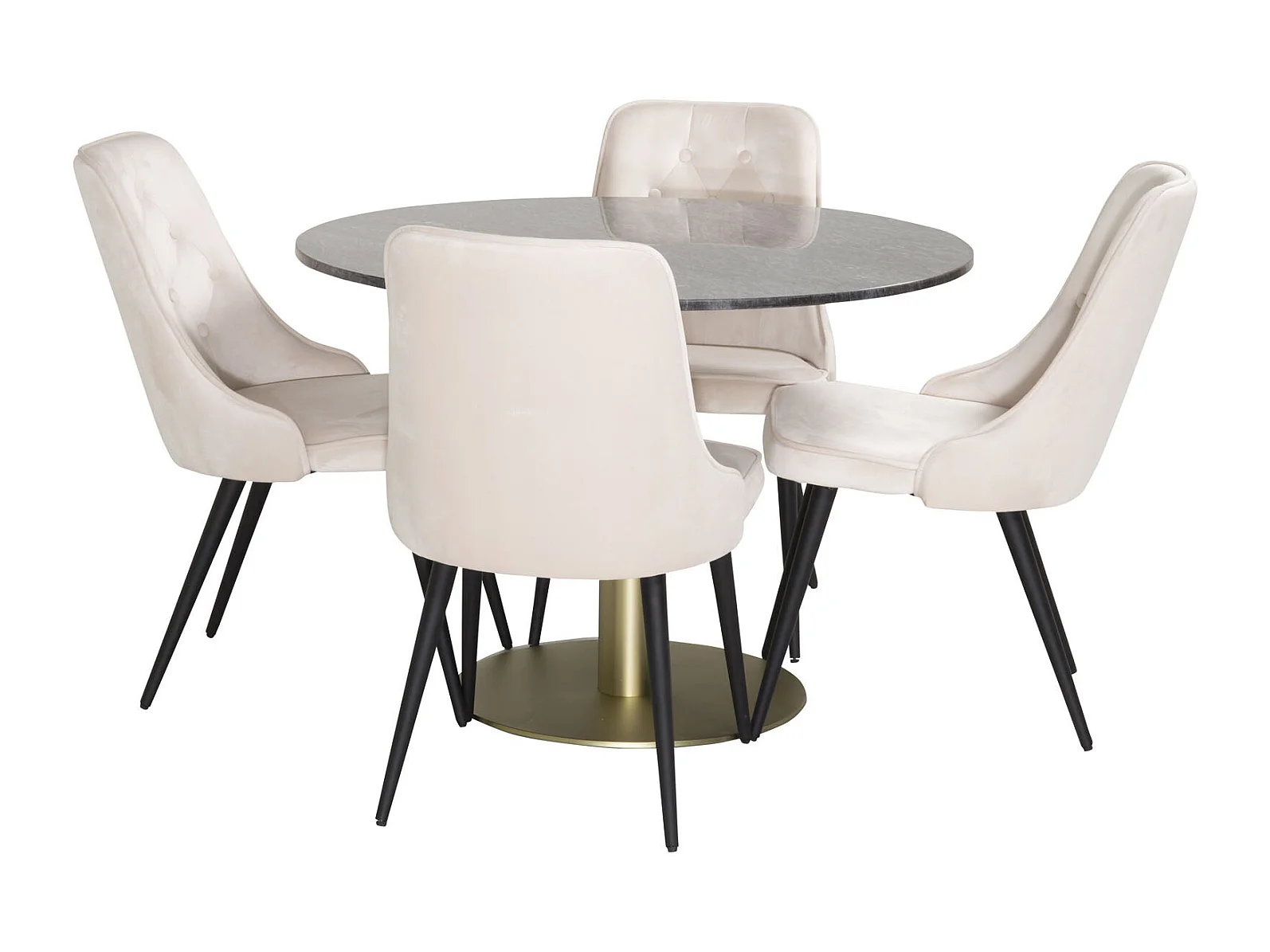 EstelleØ106BLBR ensemble table, table noir, marbre et 4 Velvet Deluxe chaises Velours beige, noir.