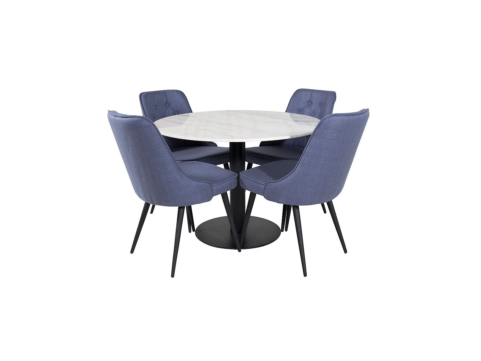 EstelleØ106WHBL ensemble table, table blanc, marbre et 4 Velvet Deluxe chaises bleu, noir.