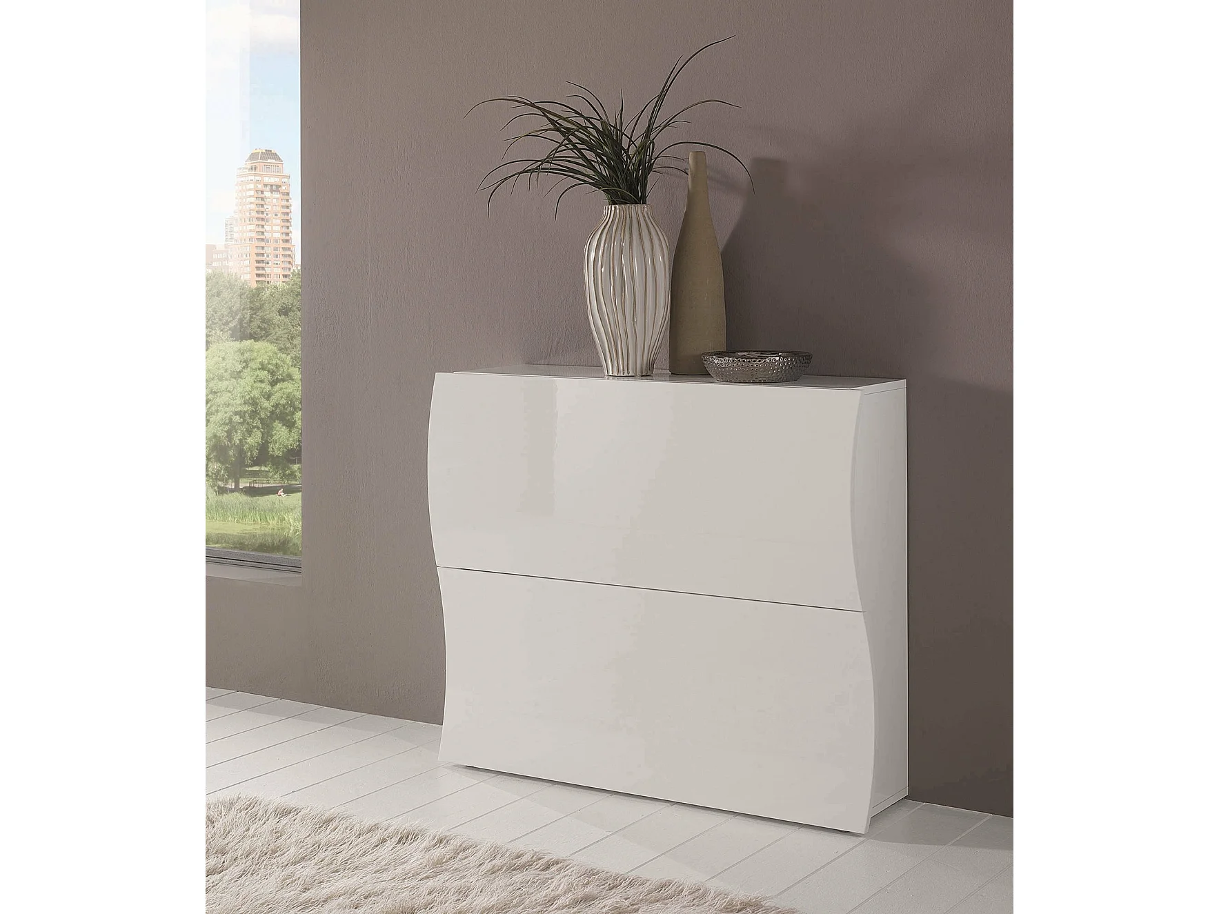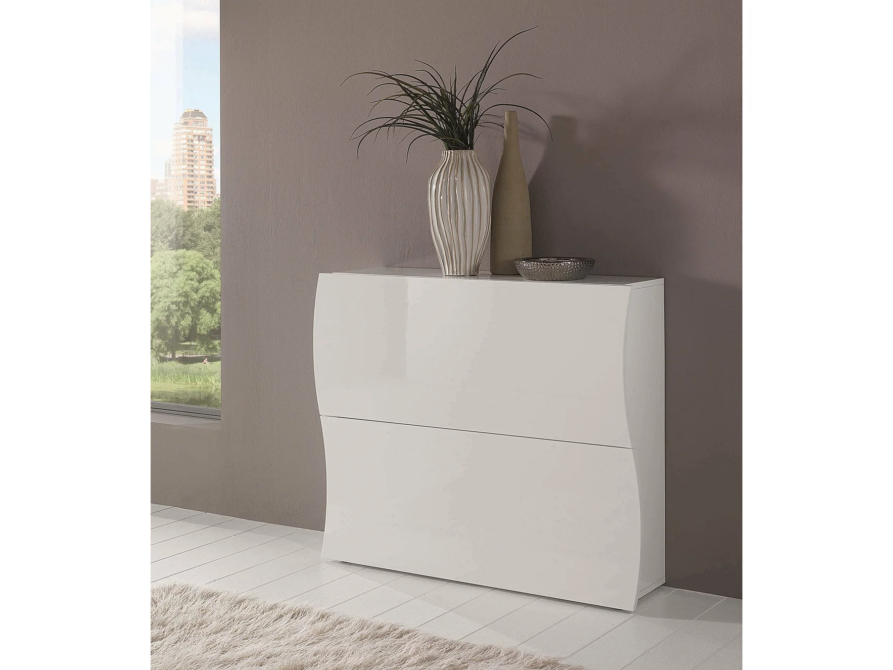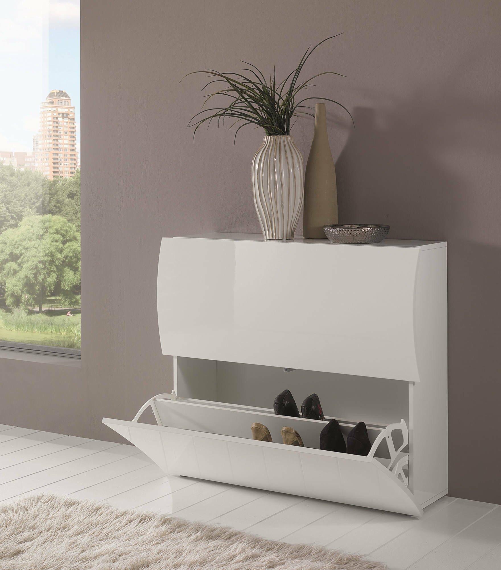 Étagère à chaussures Andrea, Armoire polyvalente avec 2 portes pliantes, Étagère à chaussures d'entrée, 100% Made in Italy, 101x27h82 cm, Blanc brillant