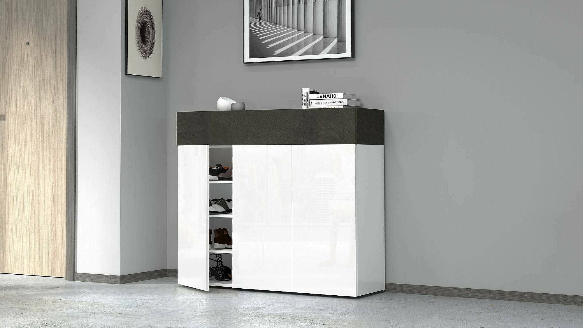 Étagère à chaussures Nick, étagère à chaussures peu encombrante à 4 portes, armoire d'entrée multifonctionnelle, 114x38h100 cm, Blanc et Ardoise