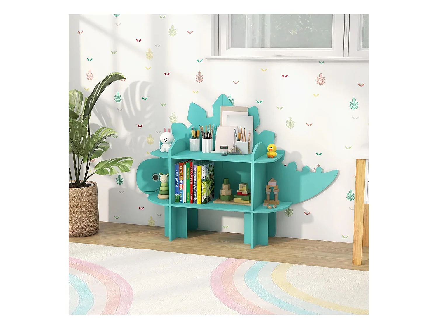 Étagère à livres enfant à 2 niveaux en forme dinosaure avec étagères ouvertes
