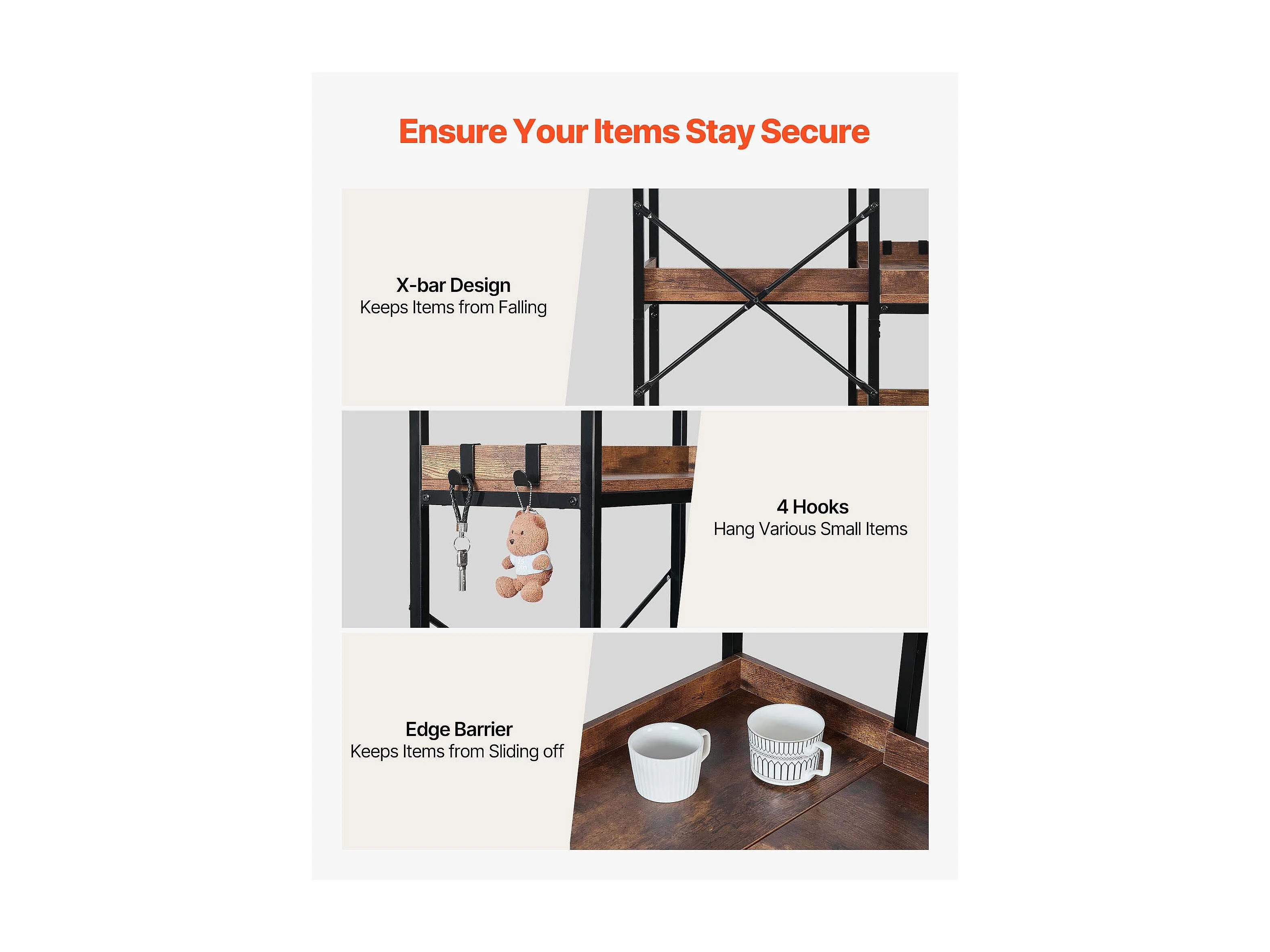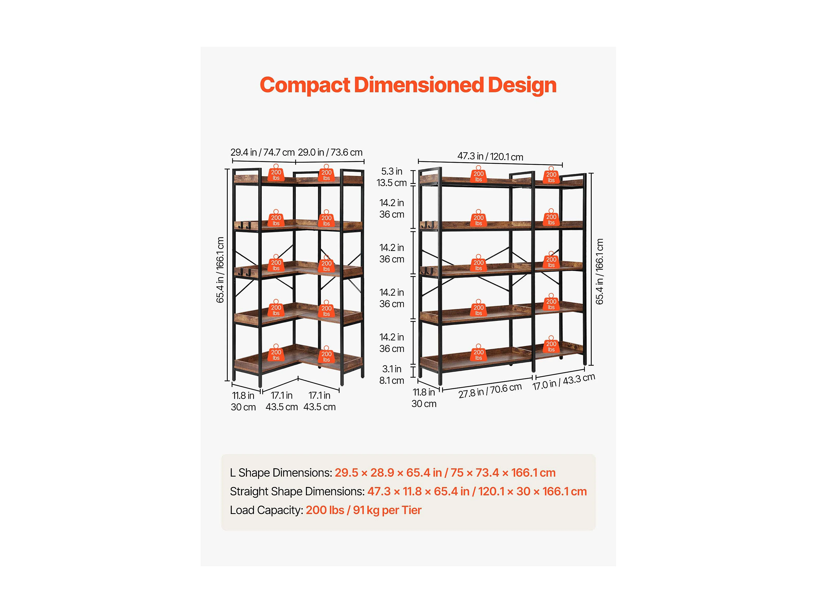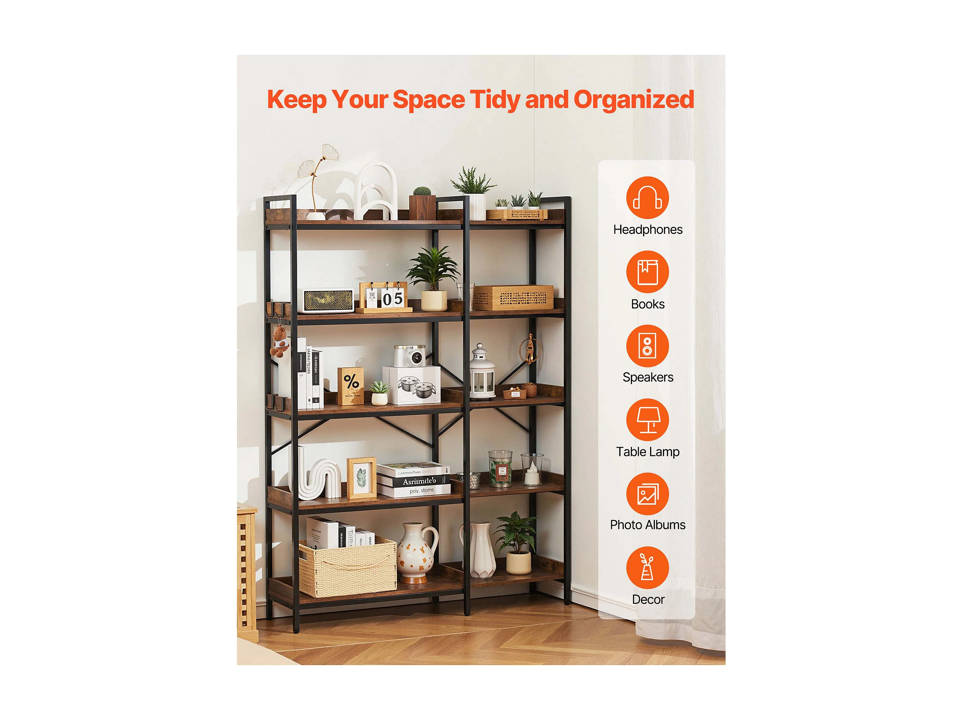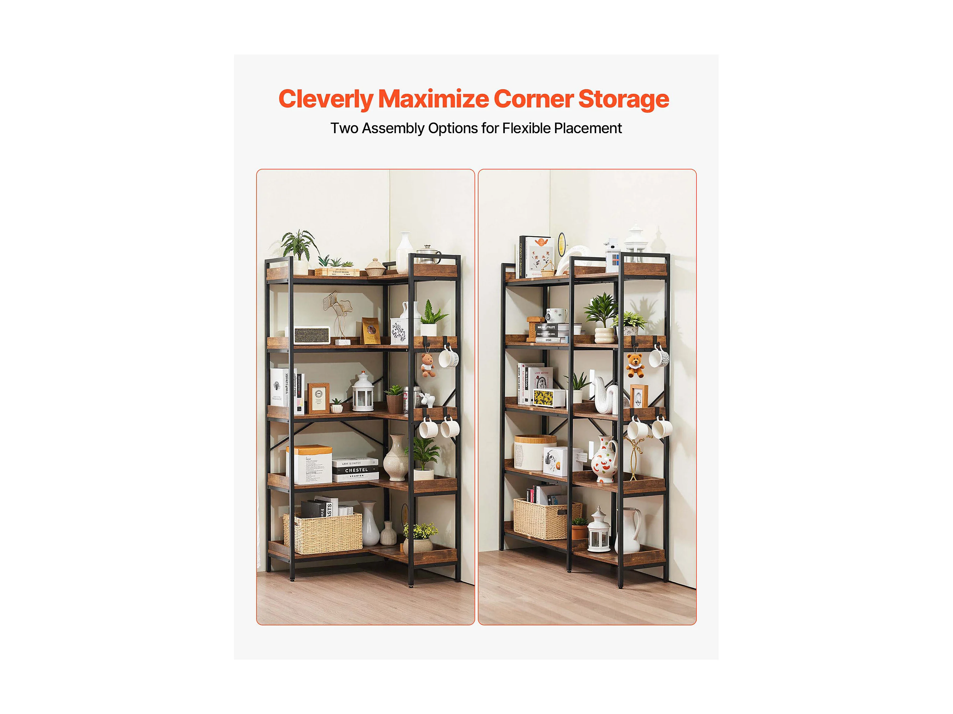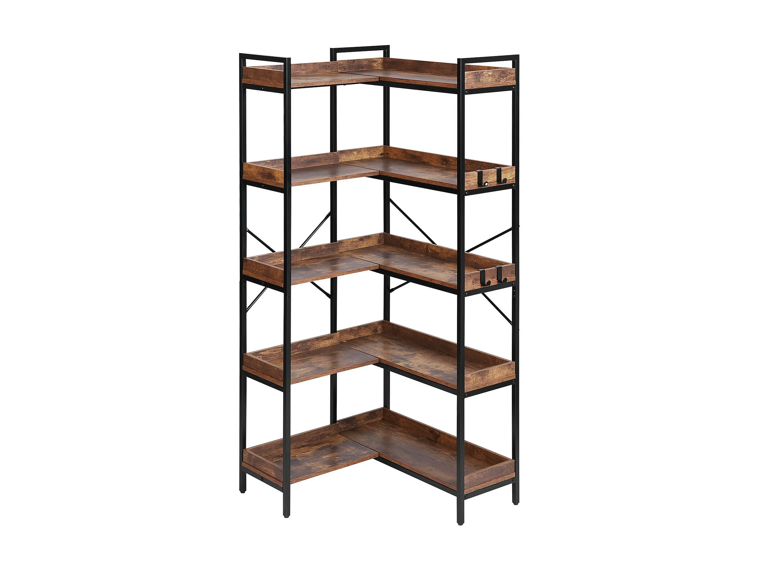 Étagère d'Angle SucceBuy à 5 Niveaux, Hauteur 166,1 cm, Bibliothèque du Coin en L avec 4 Crochets, Meuble de Rangement Réversible avec Cadre en Métal