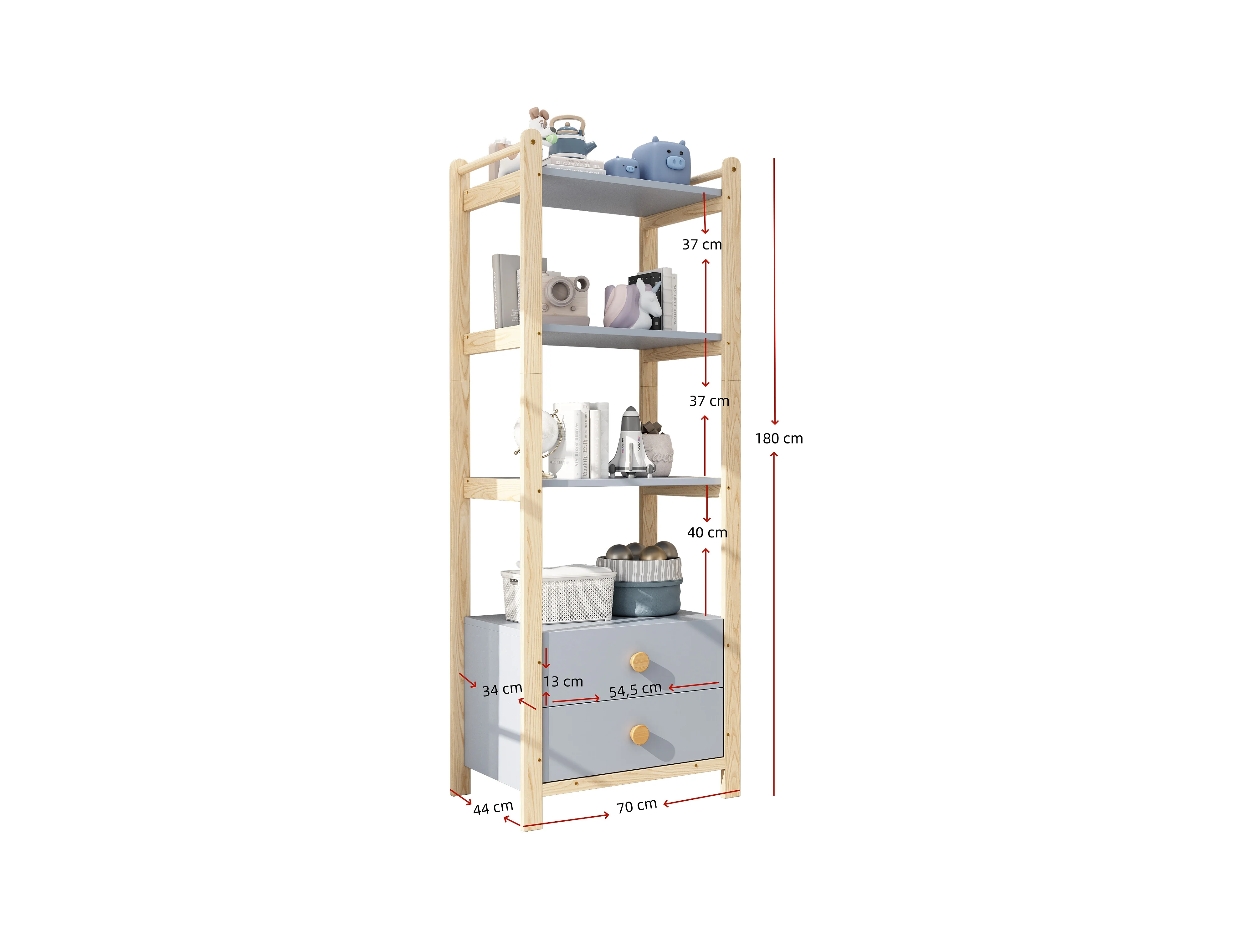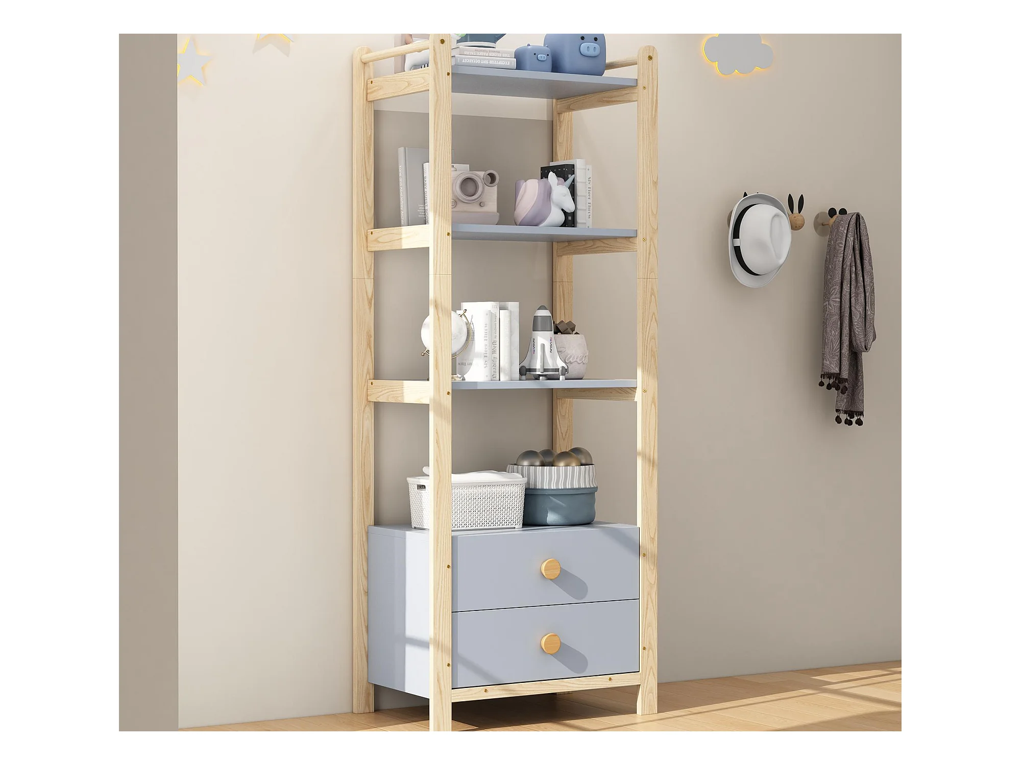 Étagère de rangement 70x44x180 cm - 2 tiroirs - poignées en bois massif - structure en pin - bleu+naturel
