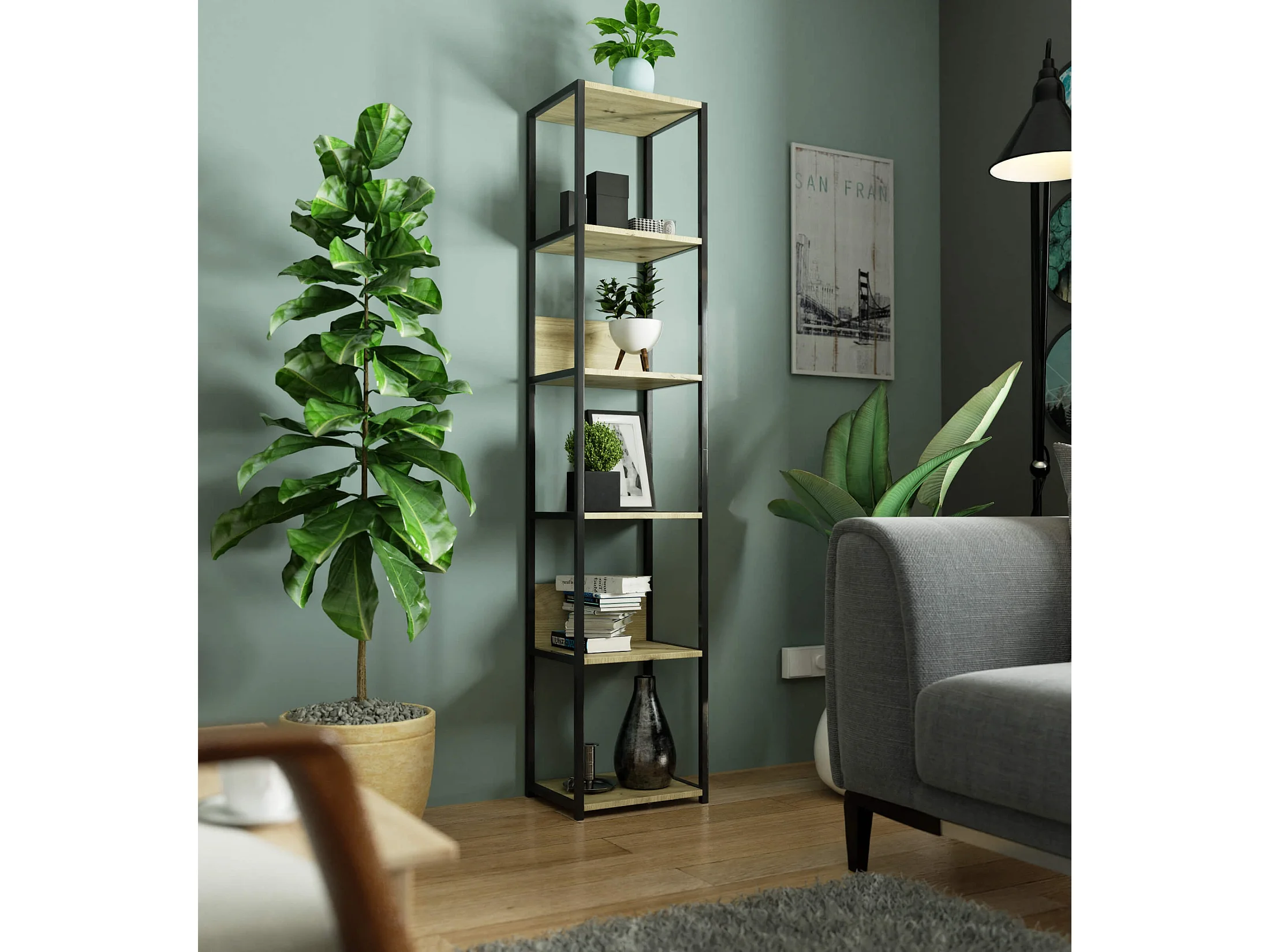 Étagère murale industrielle sur pied AKORD Noire - Chêne Artisan 40 cm 6 étagères 40x32x192 cm