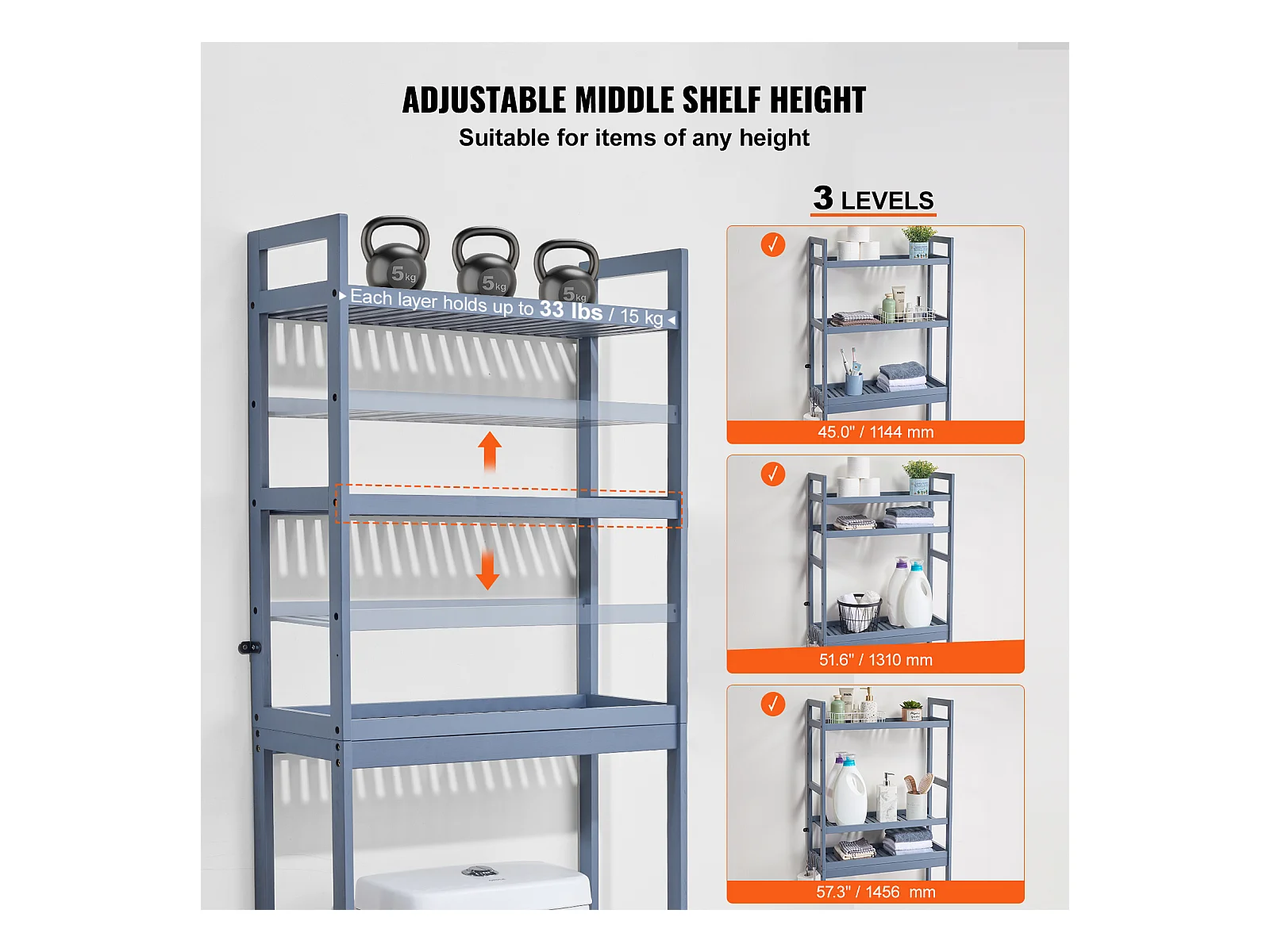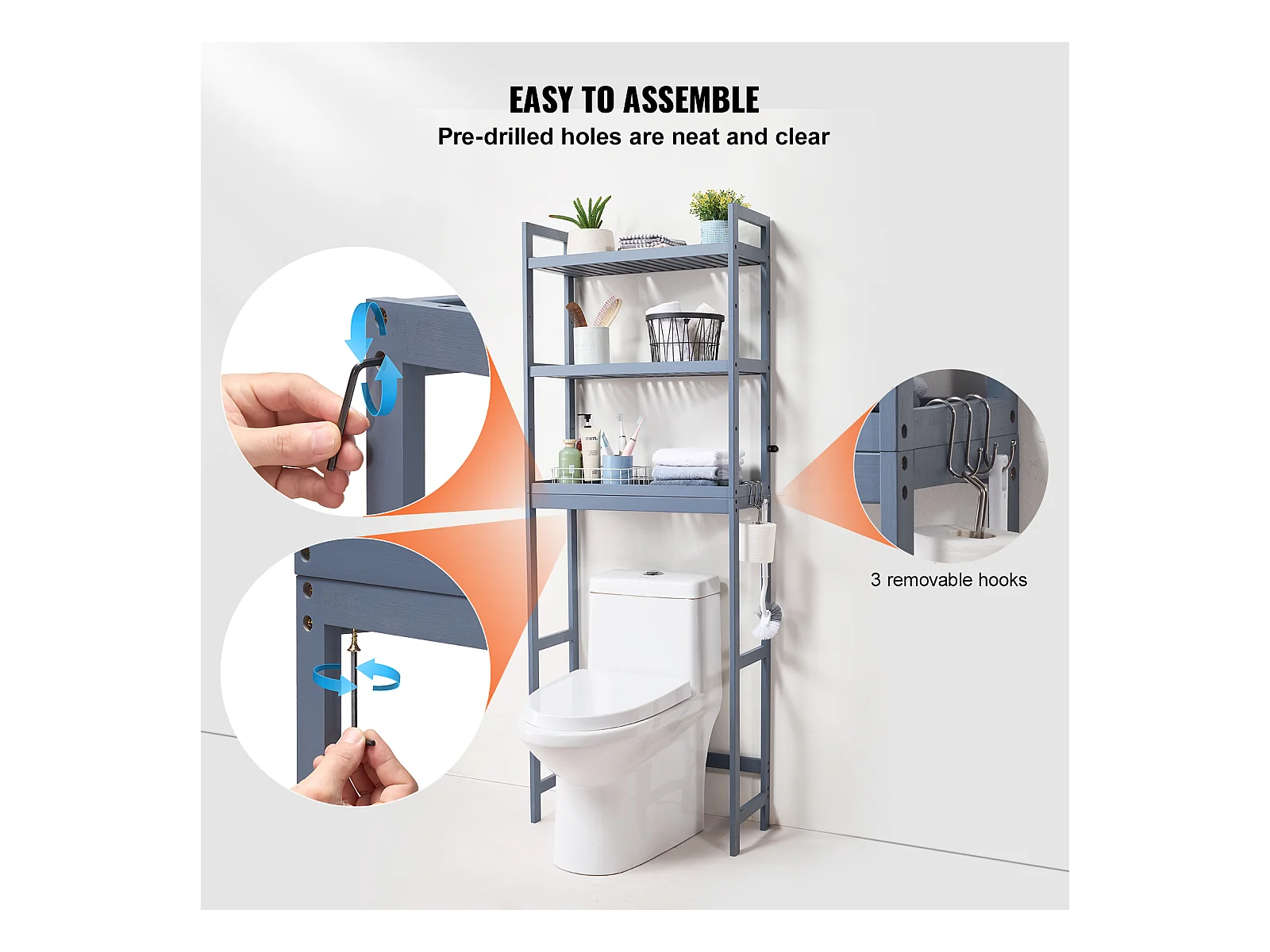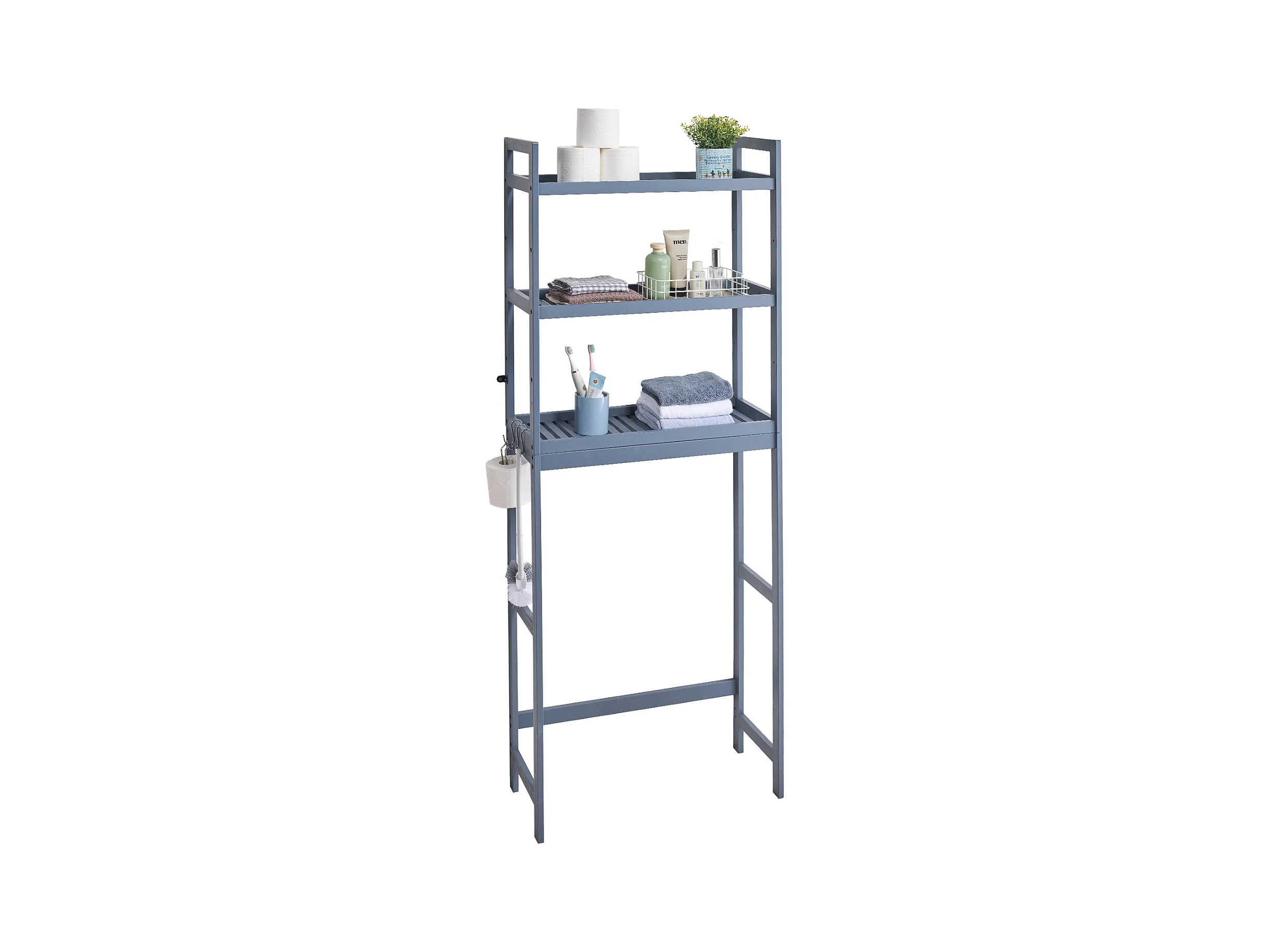 Étagère Wc Meuble SucceBuy Étagère de Rangement à 3 Niveaux pour Toilettes, Organisateur réglable en Bambou avec Crochets, Gris
