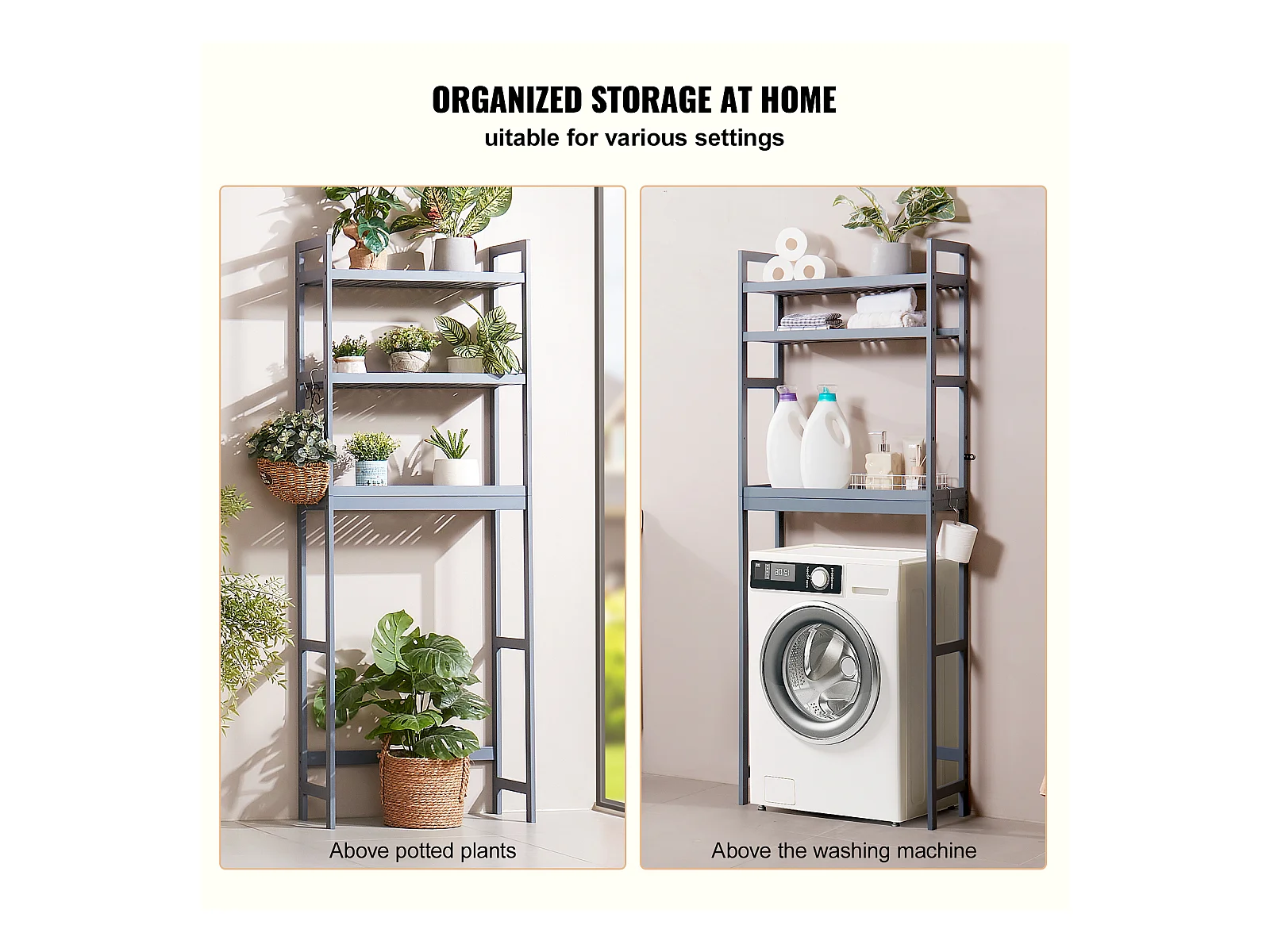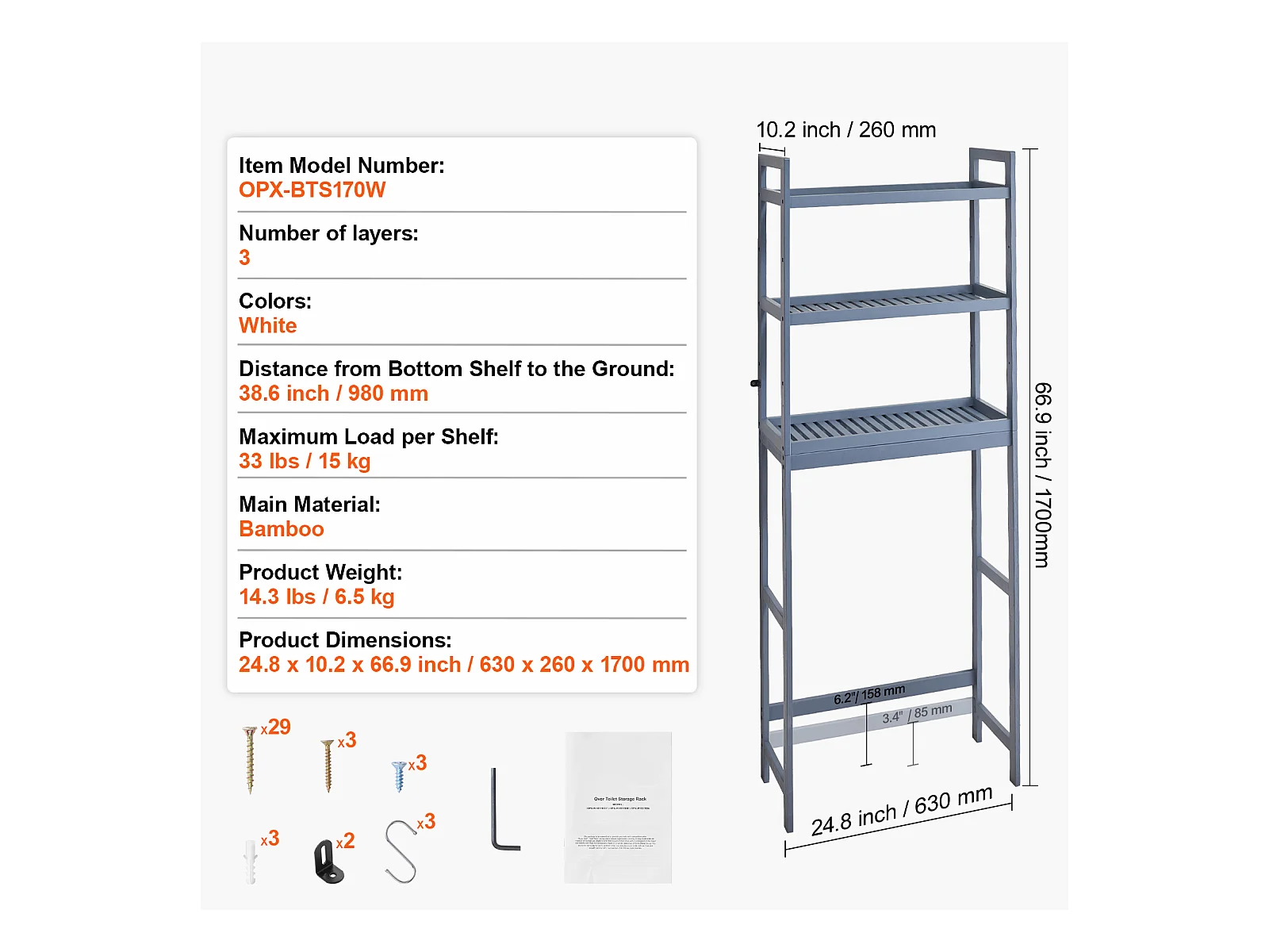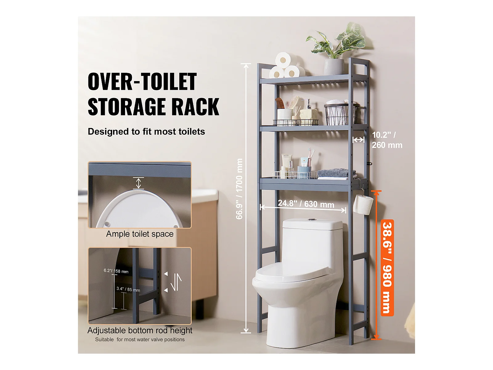 Étagère Wc Meuble SucceBuy Étagère de Rangement à 3 Niveaux pour Toilettes, Organisateur réglable en Bambou avec Crochets, Gris