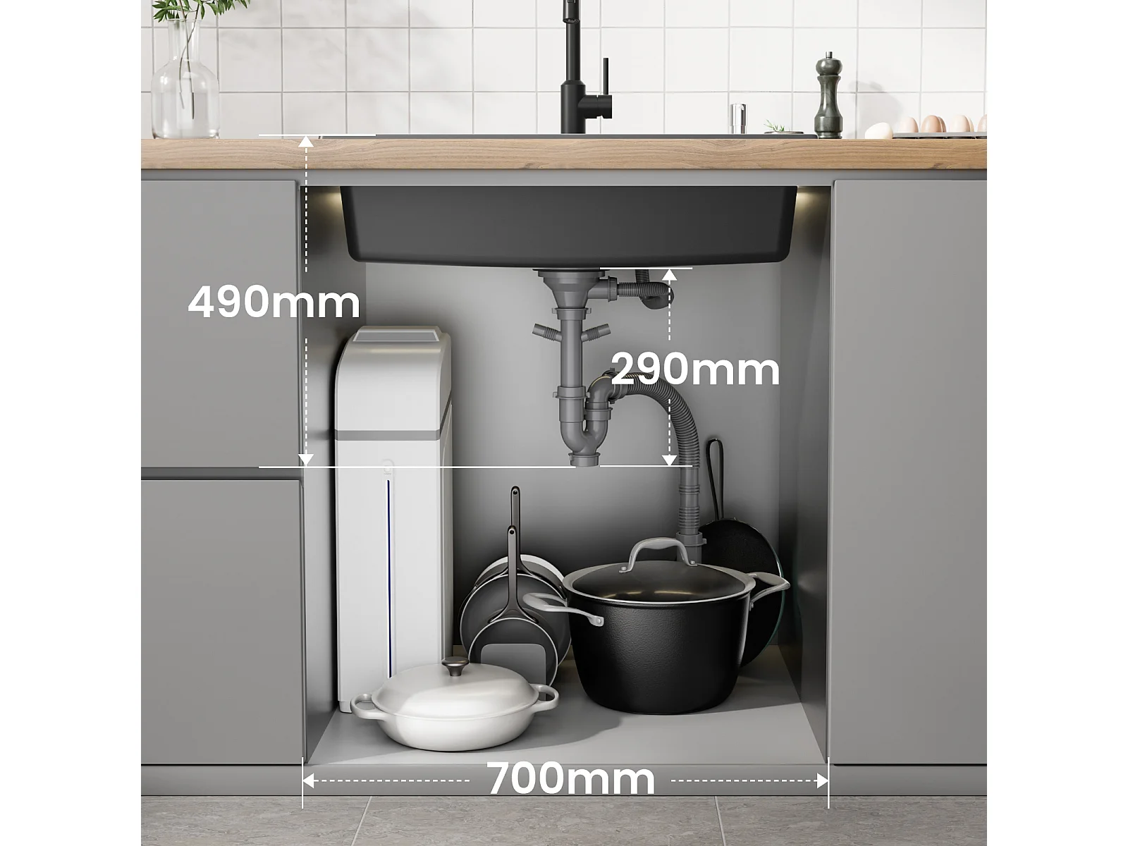 Evier 1 Bac 70x45 cm Noir Evier en Quartz et Résine avec Panier de Vidange et Distributeur de Savon + Mitigeur Cuisine Avec Douchette Extractible