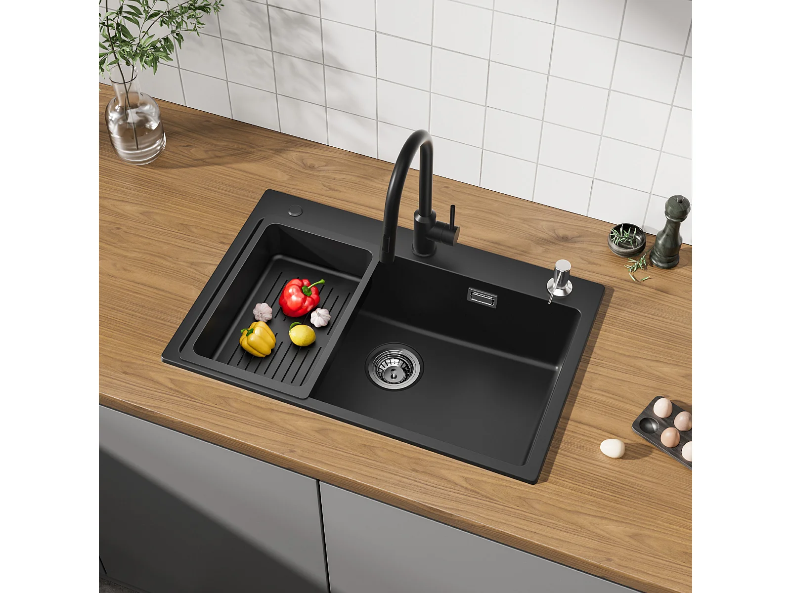 Evier 1 Bac 70x45 cm Noir Evier en Quartz et Résine avec Panier de Vidange et Distributeur de Savon + Mitigeur de Cuisine Rabattable Brossé