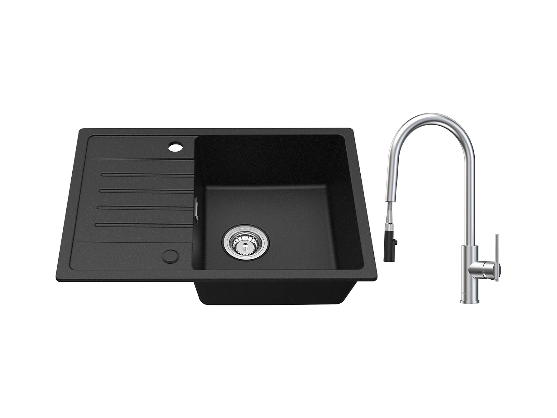 Cecipa max Evier 1 Bac avec Egouttoir Evier à encastrer Quartz et résine Noir 65x45cm+Noir Mitigeur avec Douchette Extractible 2 Modes de pulvérisat