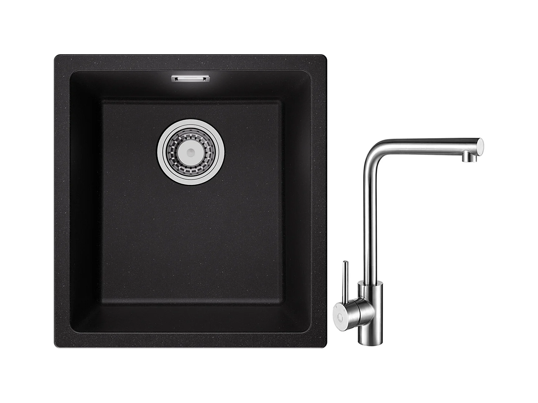 Evier 1 Bac en Quartz et Résine, 3 Options de Montage, 40*44*20cm + Mitigeur de Cuisine Rabattable Noir