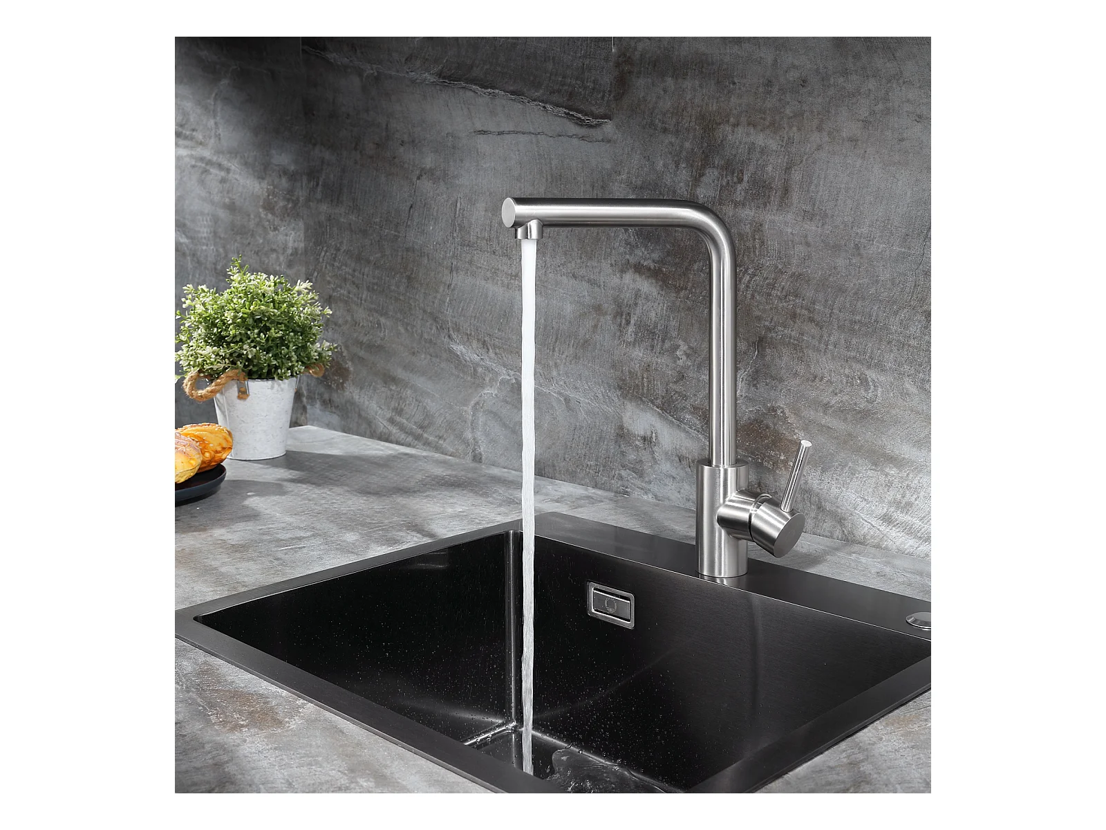 Evier 1 Bac en Quartz et Résine, 3 Options de Montage, 40*44*20cm + Mitigeur de Cuisine en Inox Noir étoilé avec Bec Haut et Incurvé