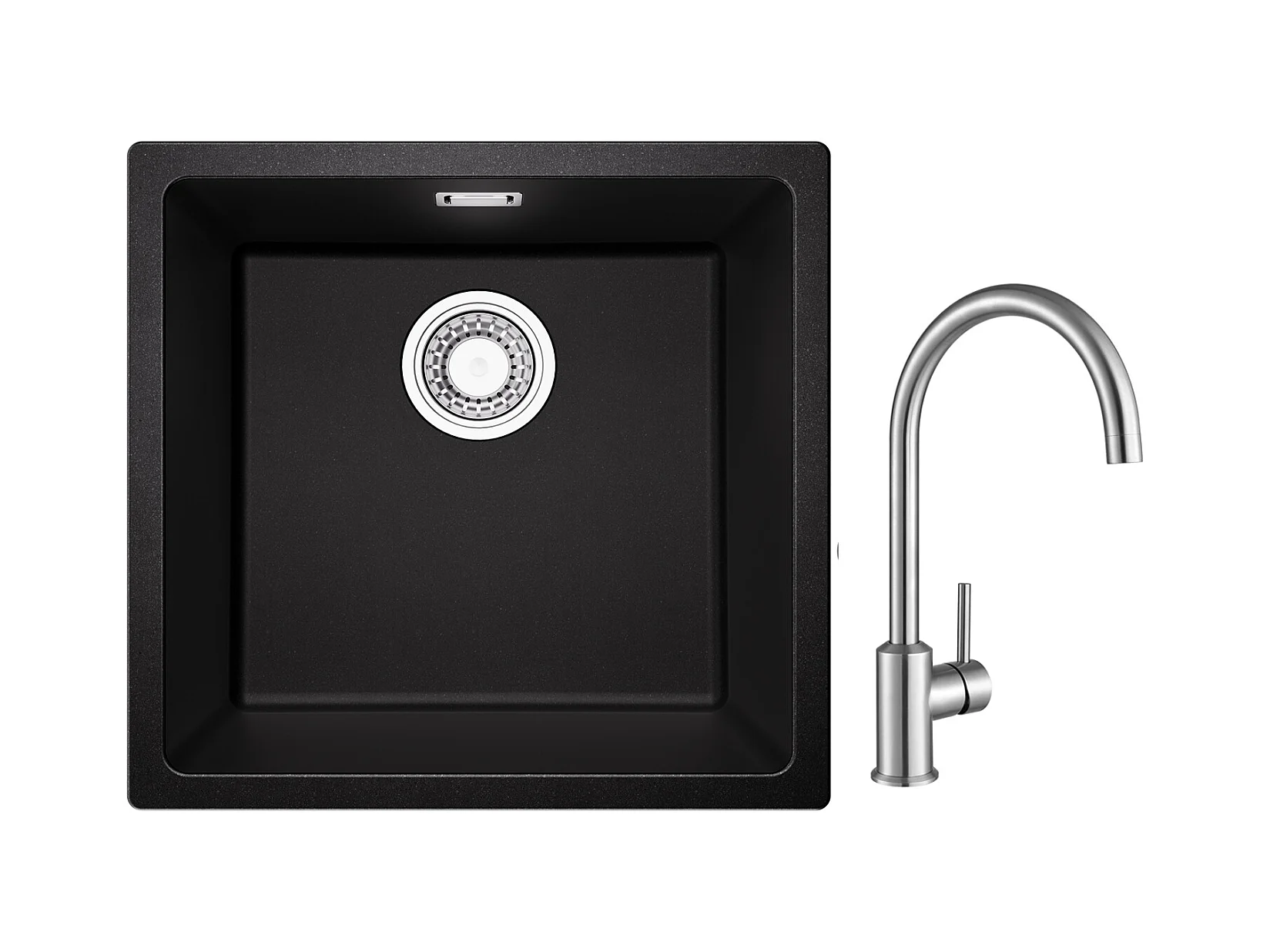 Evier 1 Bac en Quartz et Résine, 3 Options de Montage, 45*44*20cm + Mitigeur de Cuisine en Inox Noir