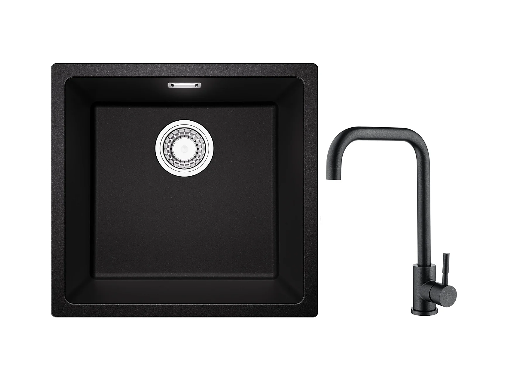 Evier 1 Bac en Quartz et Résine, 3 Options de Montage, 45*44*20cm + Mitigeur de Cuisine Rabattable Noir
